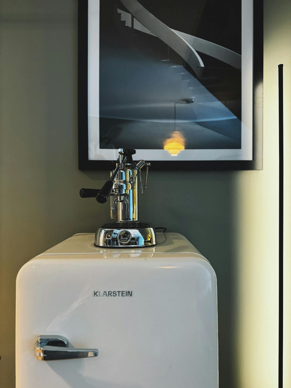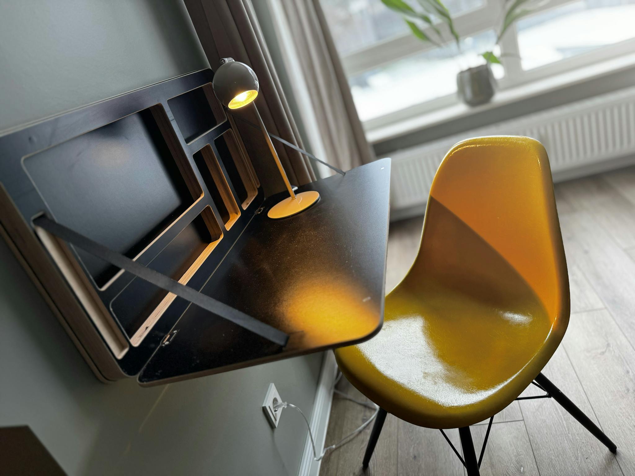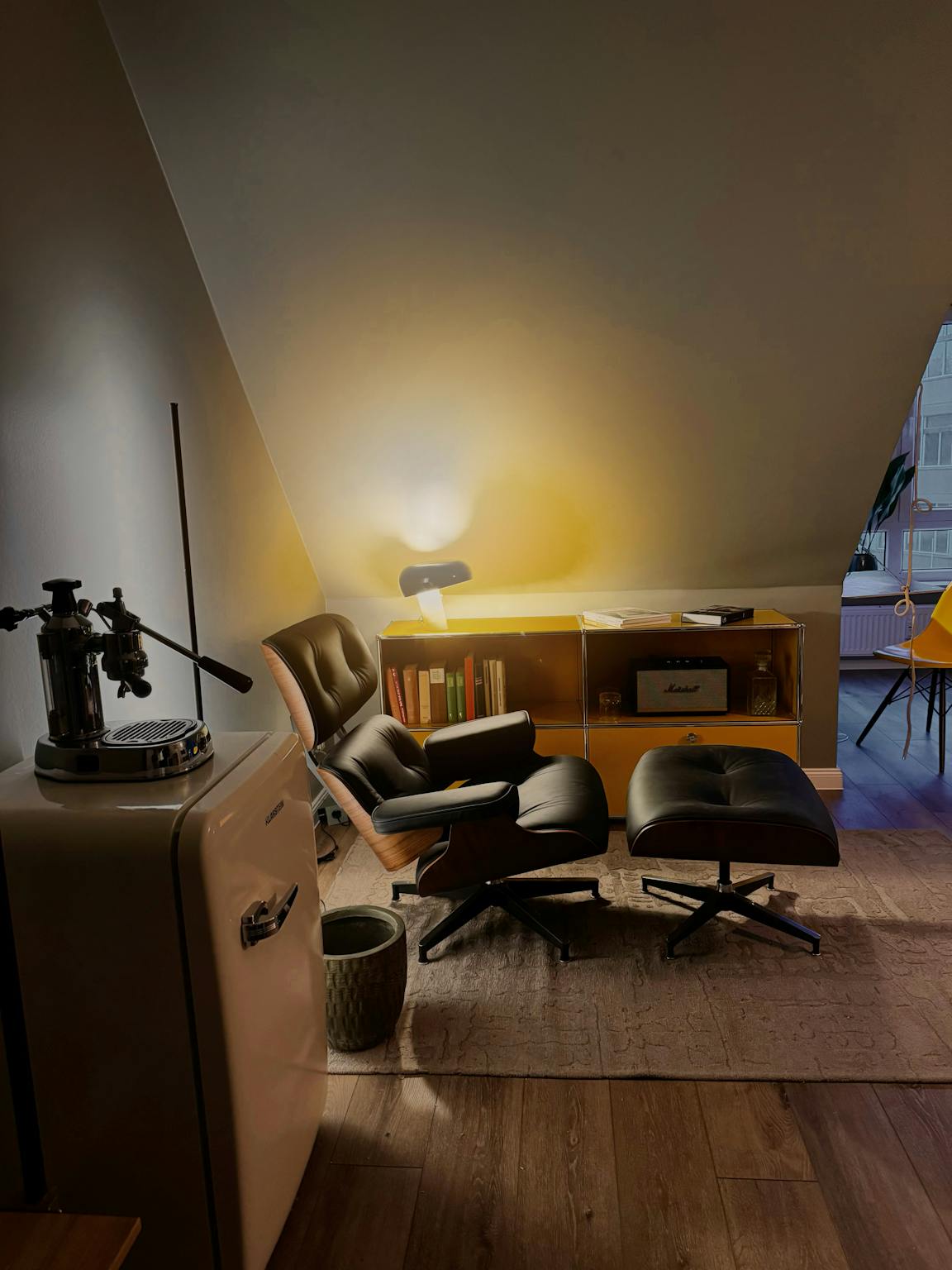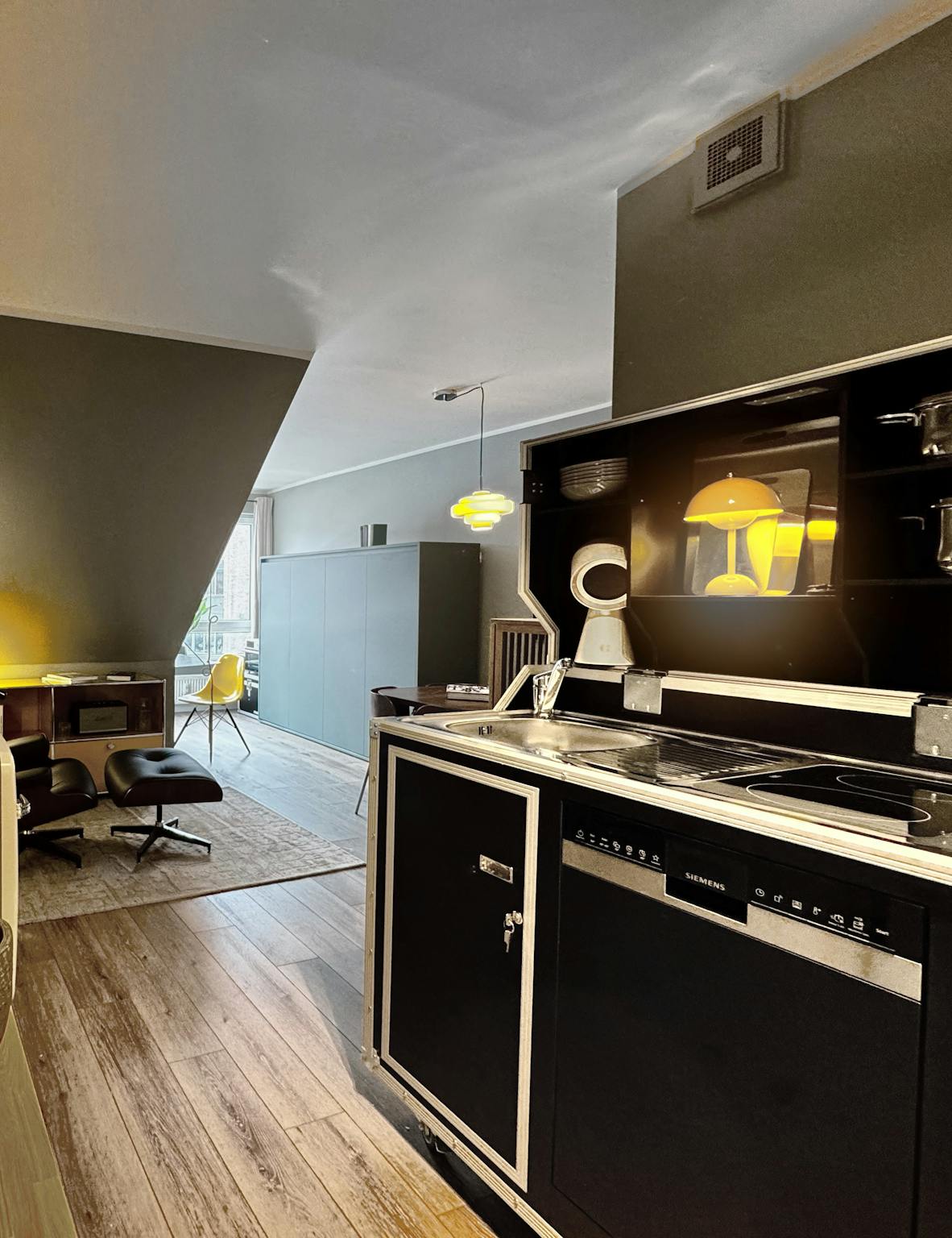 Das Apartment ist vollständig möbliert und sofort bezugsfertig. Die Gestaltung folgt einem klaren Clubroom-Konzept: ruhige grüne Wandflächen, dezente gelbe Akzente, indirekte Beleuchtung und ikonische Designklassiker schaffen eine warme, konzentrierte Wohnatmosphäre.