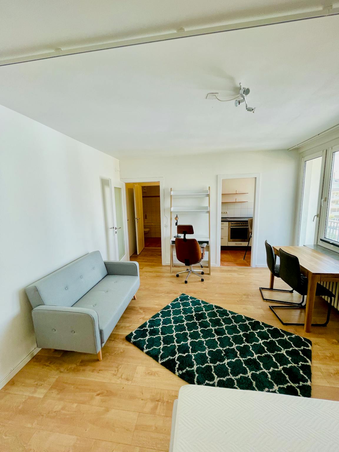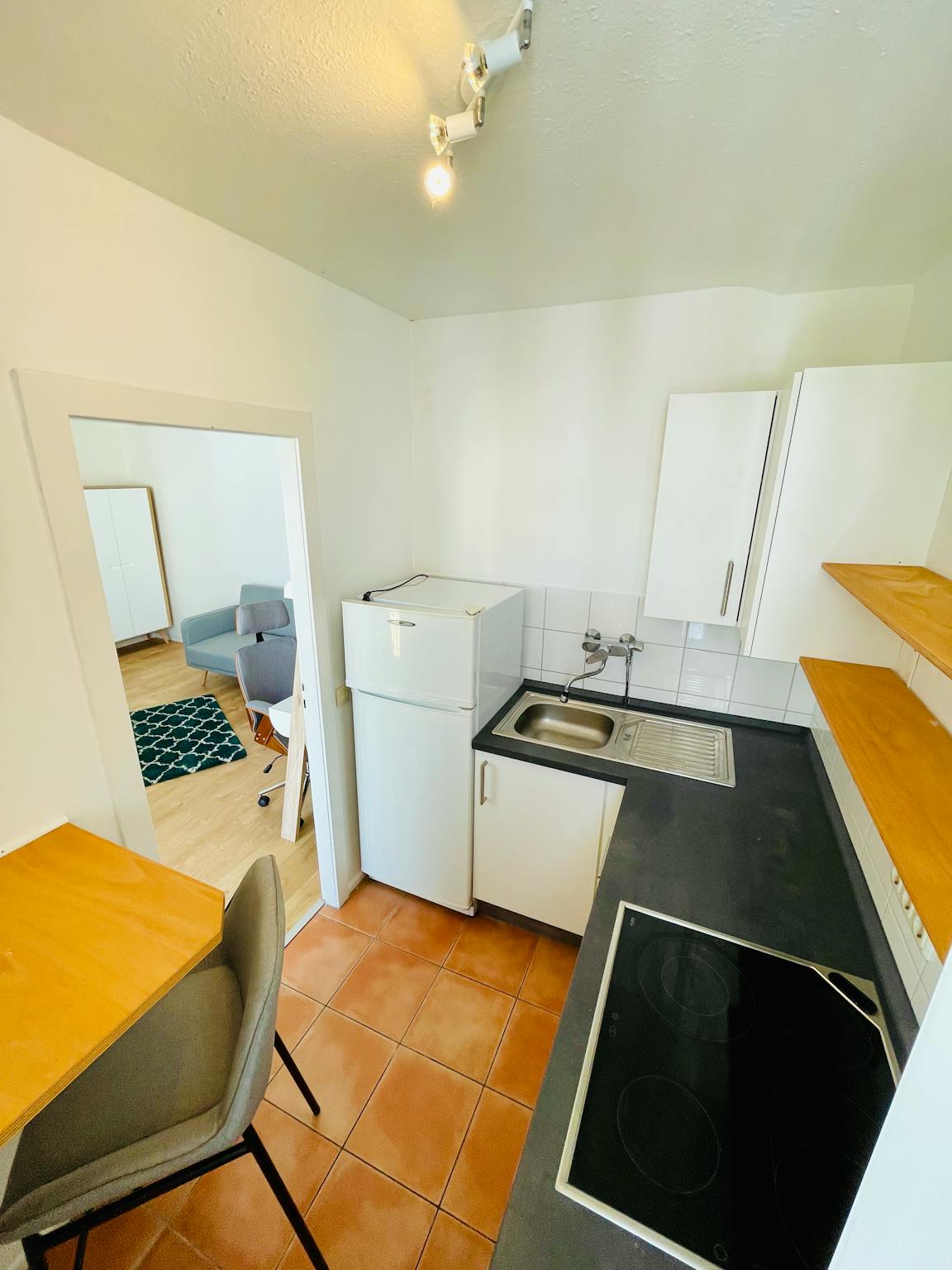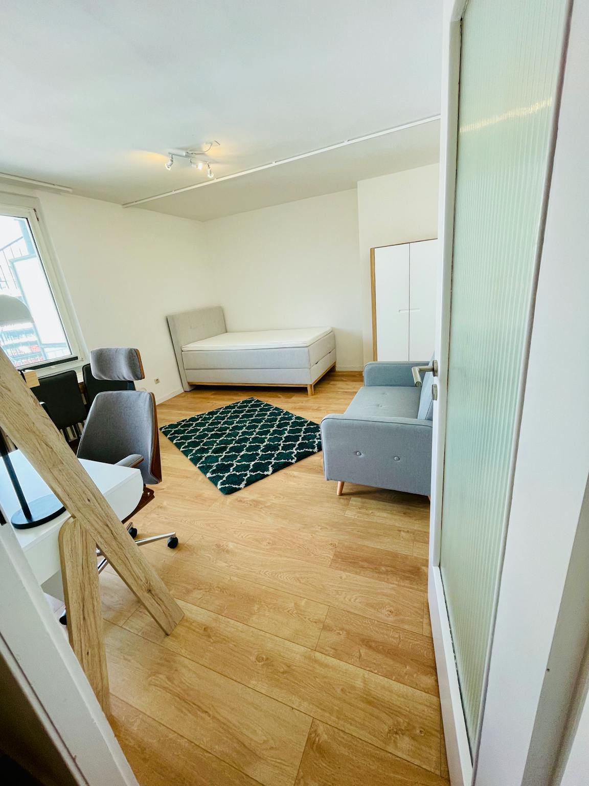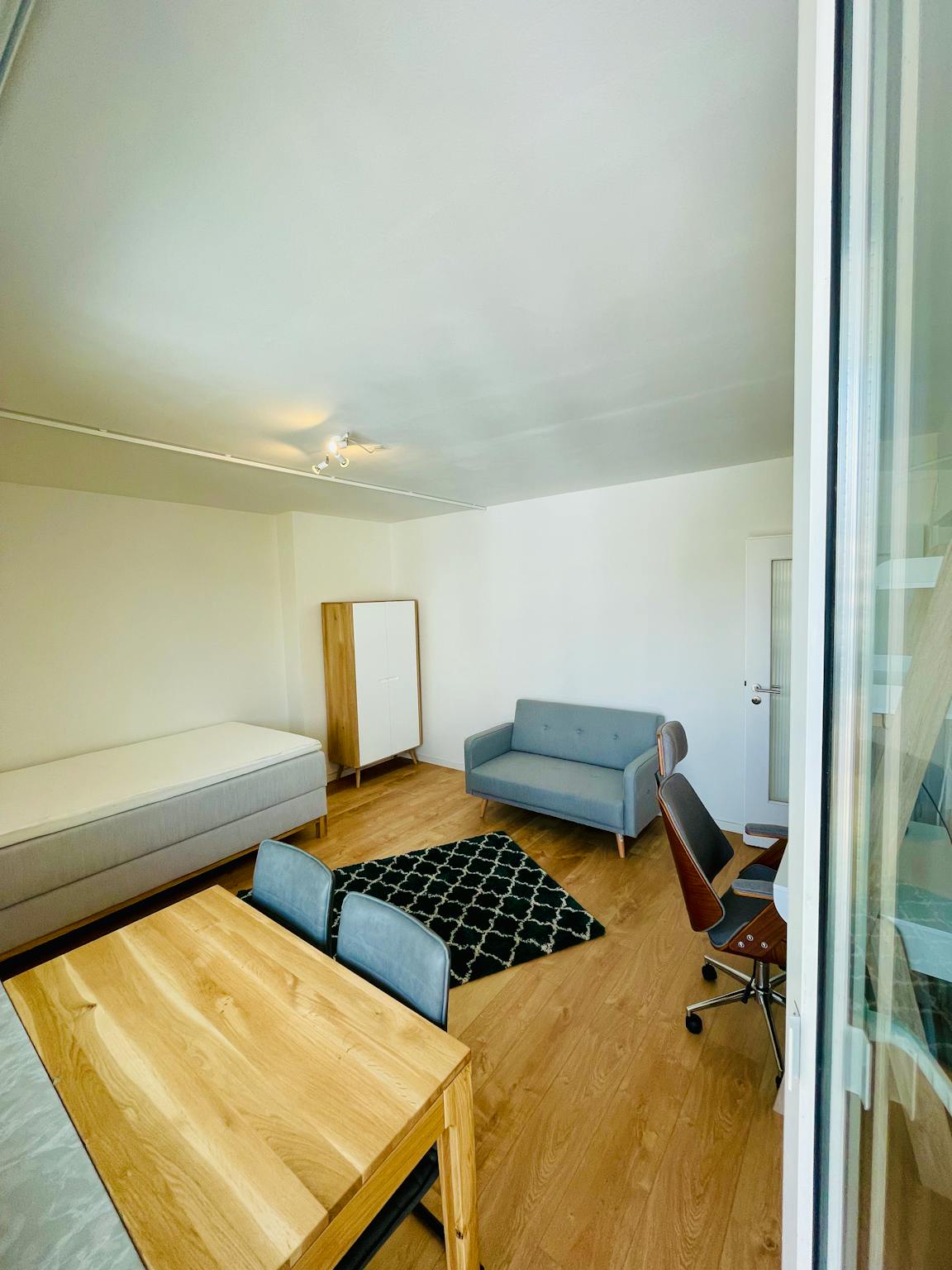 In the living room and bedroom is a 1.40 m wide bed, a desk and a comfortable seating.
