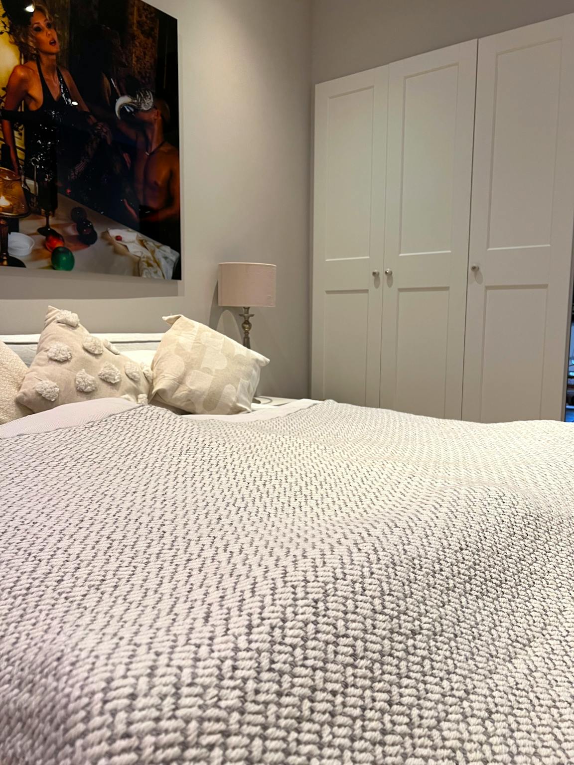 Ein Flat-TV ist vorhanden, sowie eine Sonos Anlage. Man kann sowohl von der Couch, als auch vom Bett fernsehen. In der Schlafarea befindet sich ein Doppelbett (180x200) und ein geräumiger Einbauschrank.