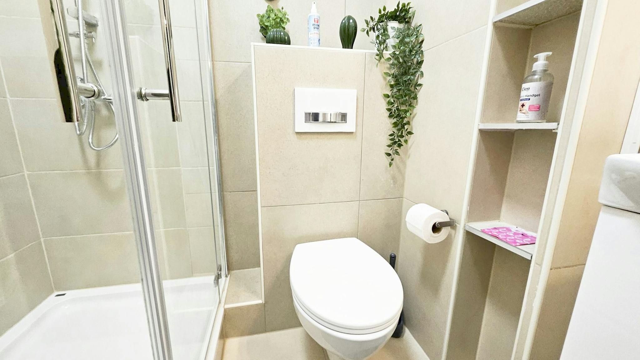 Featuring a large shower cabin with a rainfall shower🚿and regular showerhead, a WC, a sink, and ample storage space for personal items.