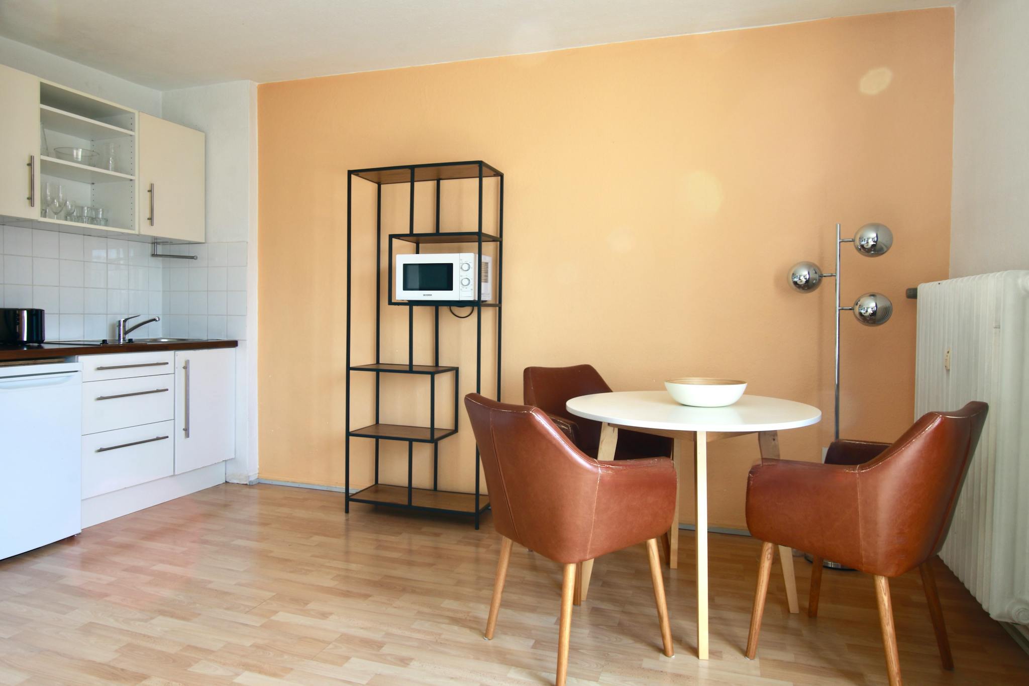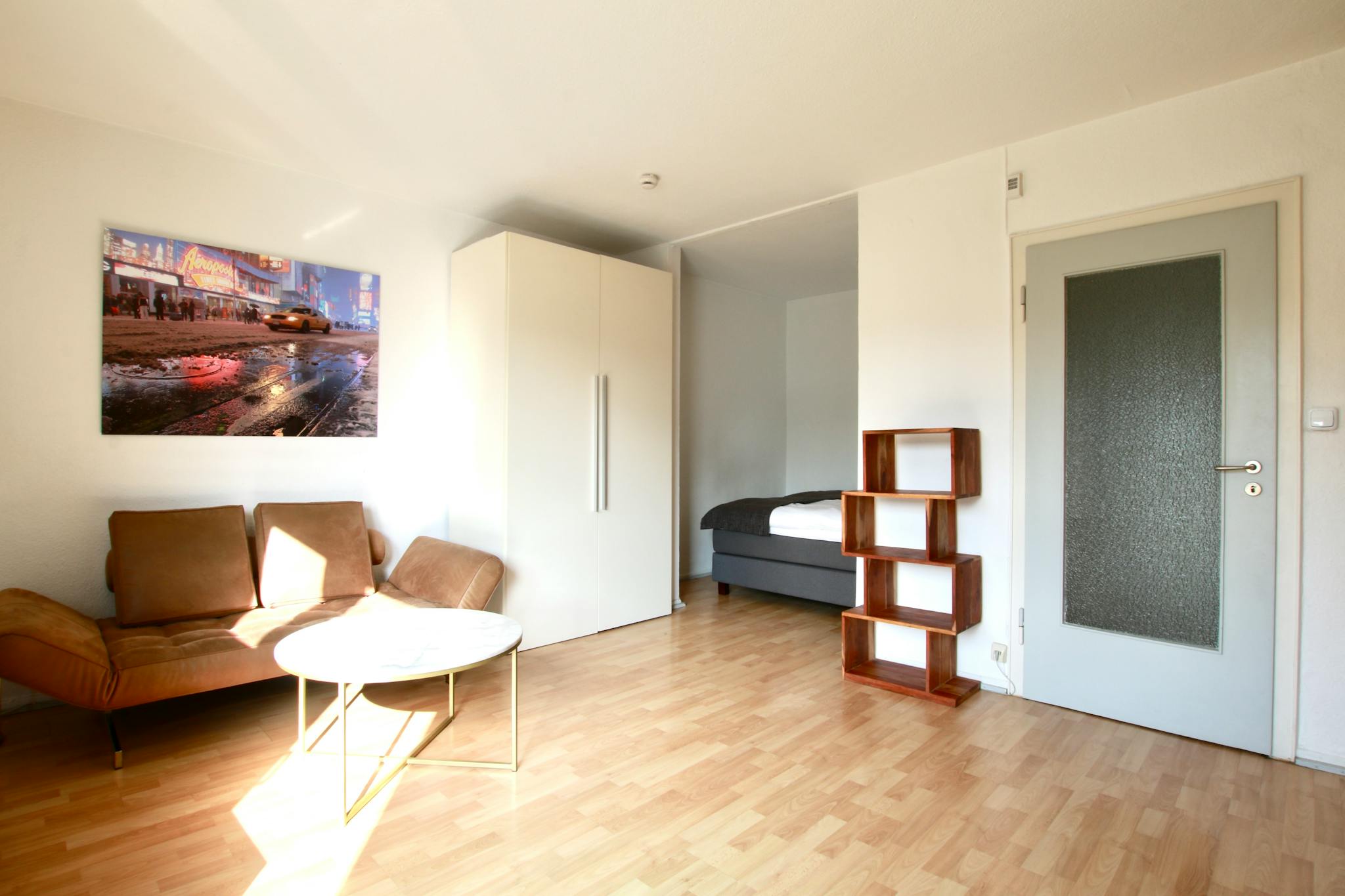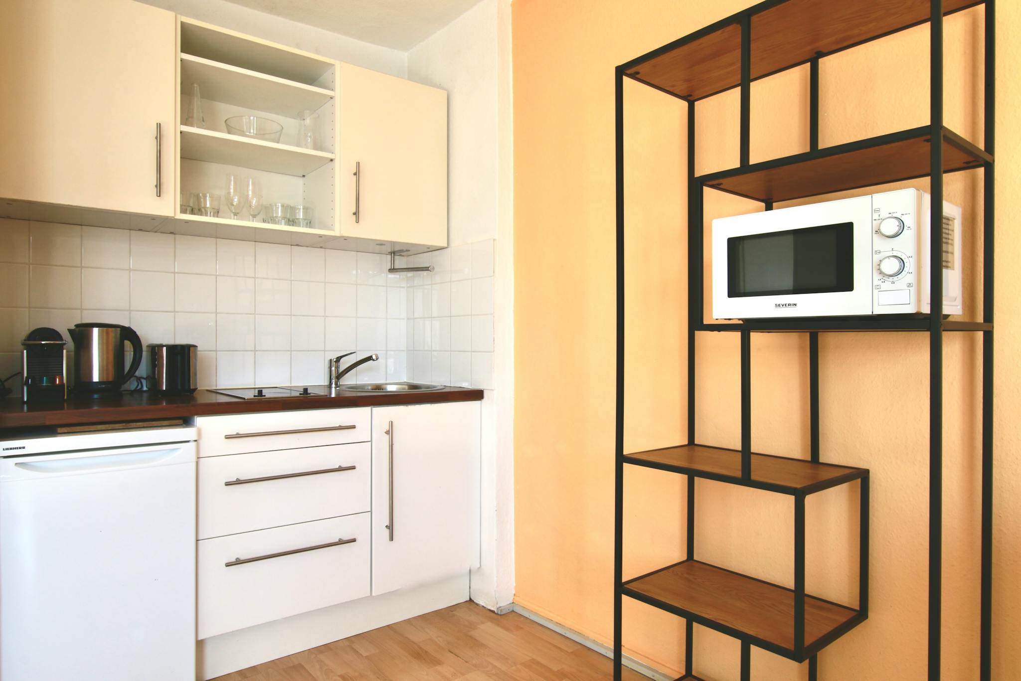 Non-SmokingNot allowed33 sqm studio apartment with balcony on the 5th floor (with elevator) of a 6-story residential building in a quiet side street off Rathenauplatz. The open-plan living room with laminate flooring has a sofa, TV, wardrobe, iron & ironing board, dining table, and a fully equipped kitchenette with refrigerator, stove, microwave, kettle, toaster, and coffee maker. Small bathroom. The box spring bed (140cm width) is located in an alcove. The small bathroom features a shower and a hairdryer.