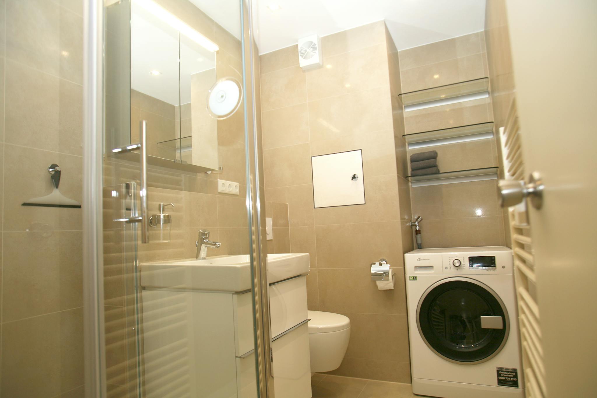 Das Bad ist deckenhoch gefliest, solide und hochwertig ausgestattet mit WC (spülrandlos, Softclose-Automatik), Dusche mit Kop(hidden)rause, Duschtrennwand aus Glas, verchromten Armaturen und Duscheinfassungen, Waschtrockner.