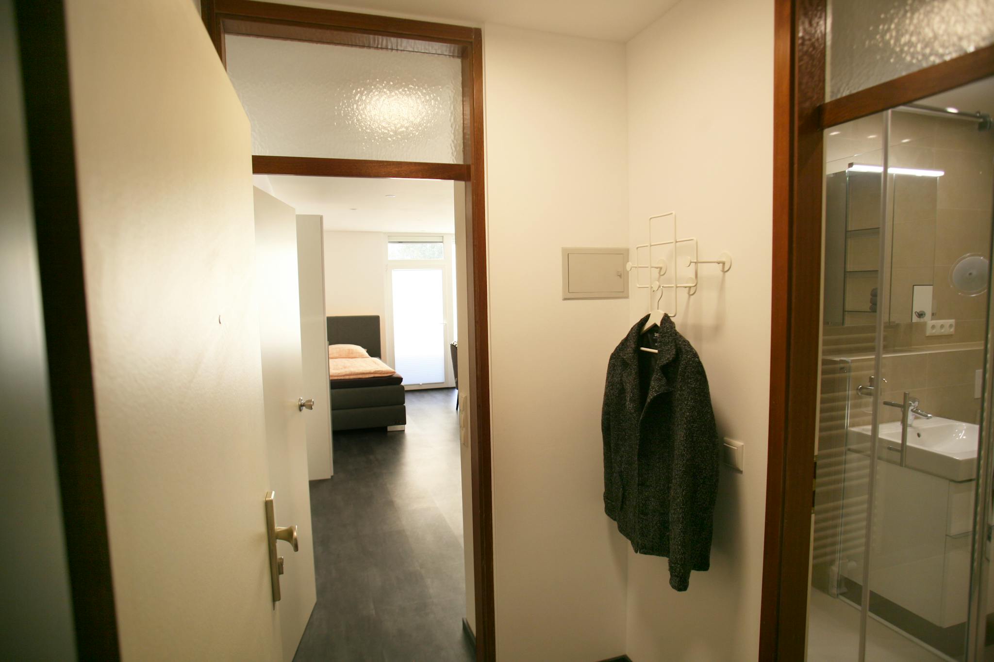 Fenster mit Plissees und elektrischen Außenjalousien und automatischem Windwächter; Holzesstisch mit modernen Designerstühlen, Arbeitsplatz, Sofa, Couchtisch, TV-Konsole und Flachbild-TV mit Kabelanschluss. WLAN (100 MB). Für das hochwertige, 1,20 m breite Boxspringbett steht ausreichend Bettwäsche zur Verfügung; eine Sitzecke mit Fernseher und gemütlichem Sofa komplettiert die Ausstattung. Auf dem sonnigen Westbalkon stehen Stühle bereit. Seitlich auf dem Balkon befindet sich eine Abstellkammer.