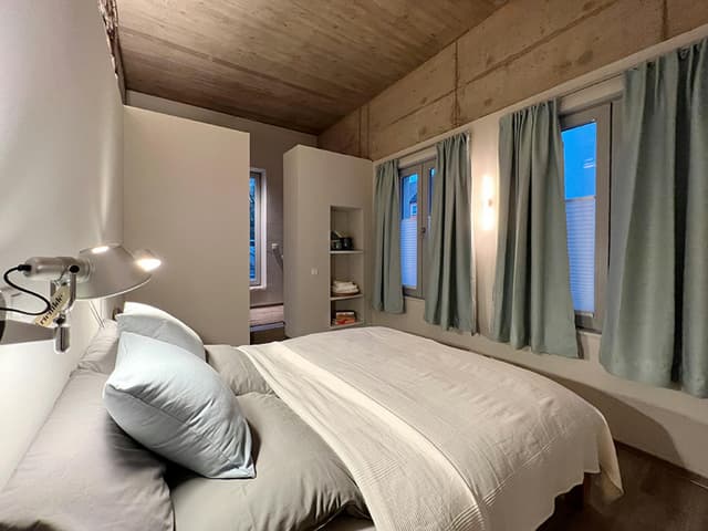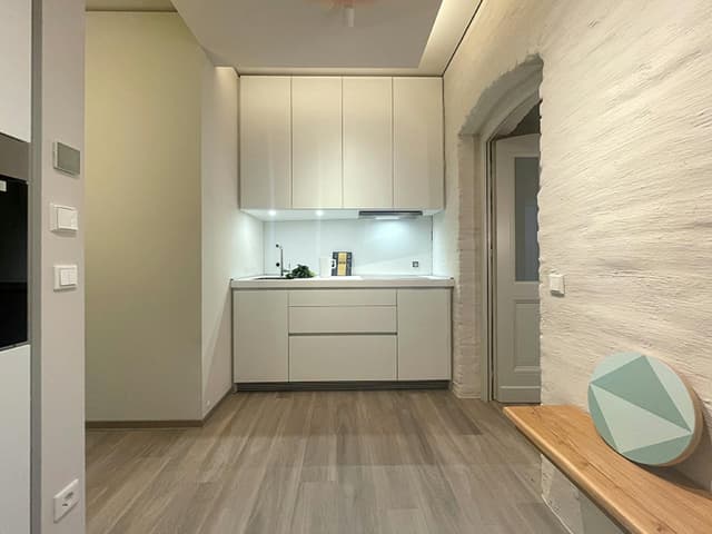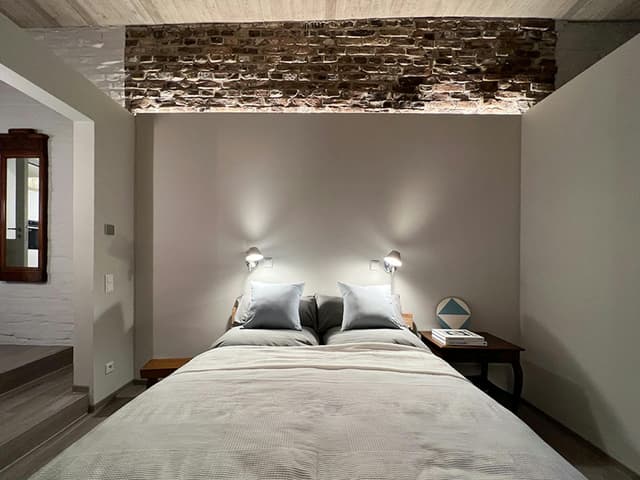 The entrance of the suite has a wardrobe with a rack. Passing the bathroom, you step into the built-in bulthaup-kitchen, facing the courtyard. In there, as in the entire apartment, indirect lighting lends the space an atmospheric ambience, emphasizing the 19th century-high ceilings. Both the 19th-century-timber frames with brick infill and the restored brick walls come aesthetically into their own. Descending from the adjacent dressing room you enter the sleeping area with an exceptionally comfortable bed. A partition wall, containing built-in closets, indicates another dressing room with a French window, leading up to the apartment’s own secluded 10 sqm sun terrace. The furnished living room with a stucco ceiling brickstone walls is located in the front of the house. The on-site trash room is next to the discrete gateway to the supermarket in the back of the property in the courtyard.