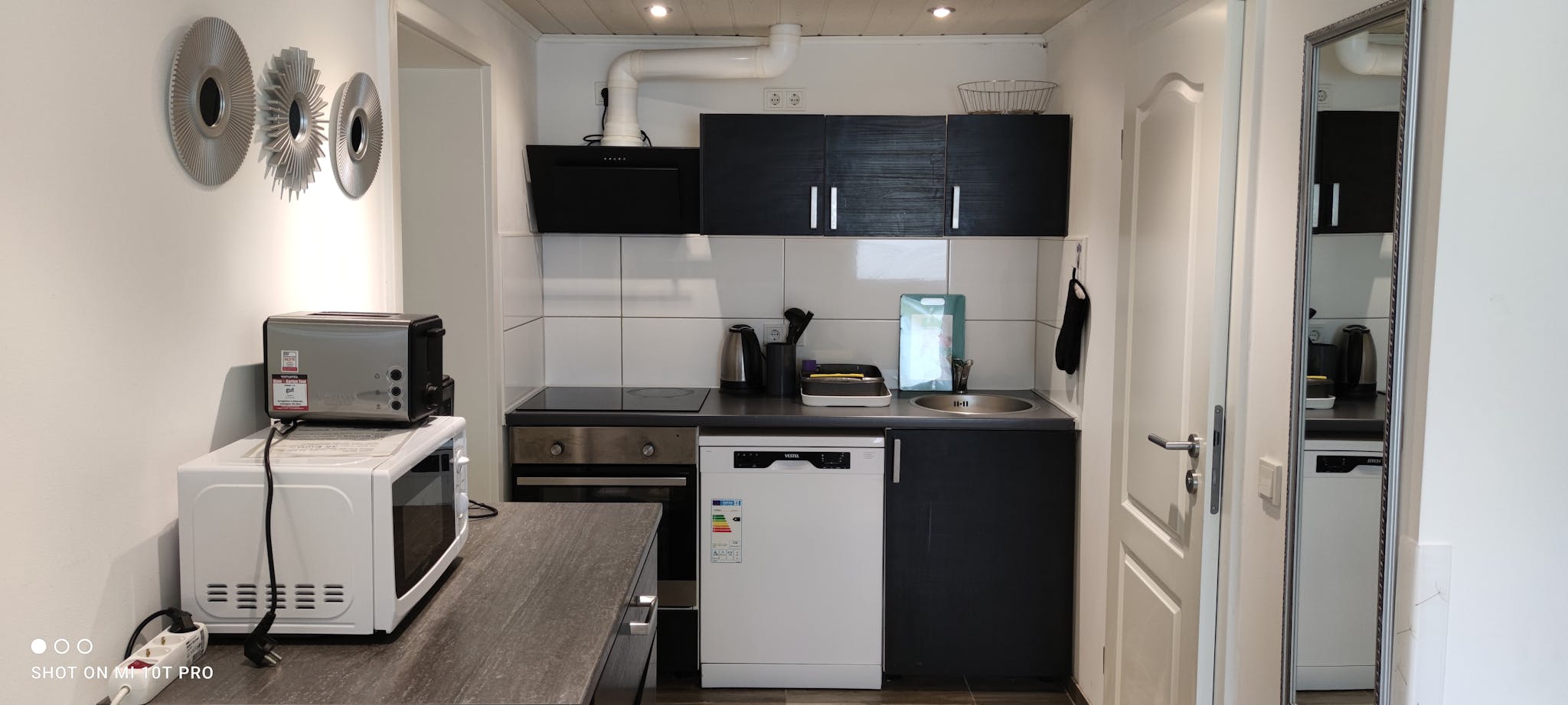 Fully equipped with a large fridge, freezer, ceramic hob, oven, washing machine with dryer, microwave, toaster, coffee maker, kettle, and all essential cooking and dining accessories.🍳