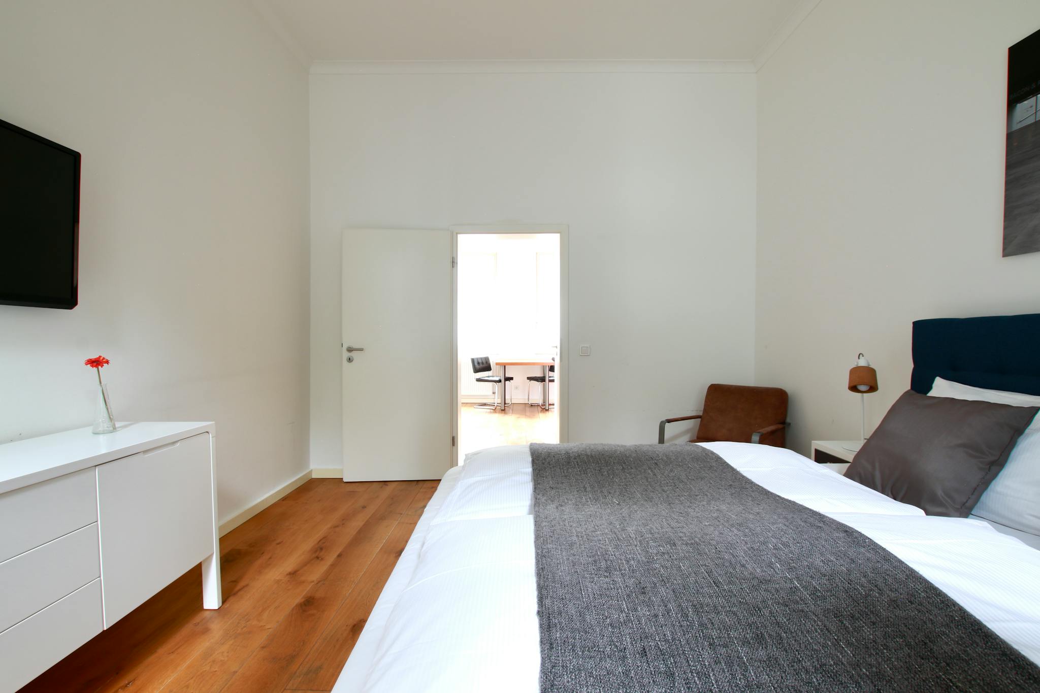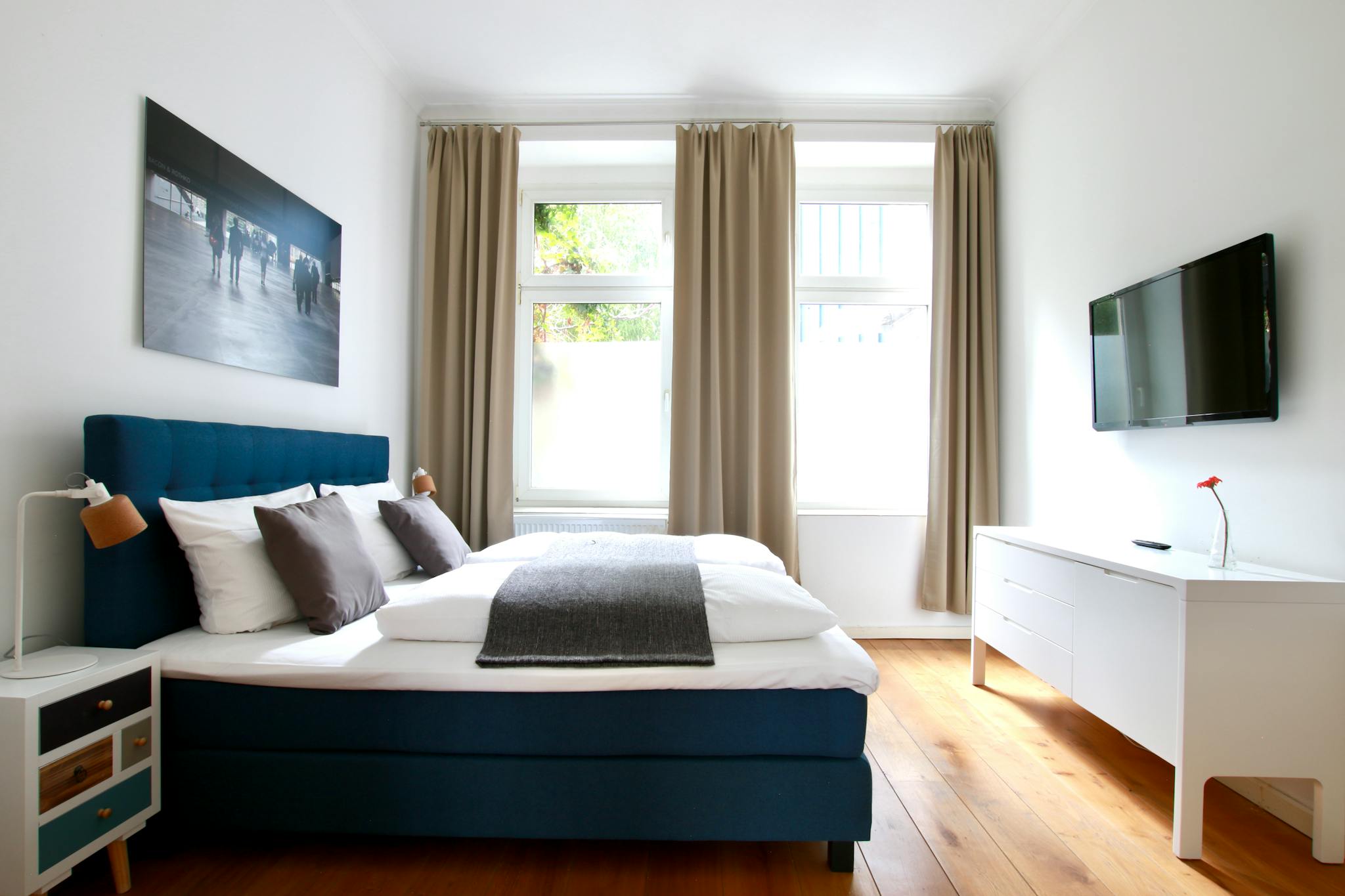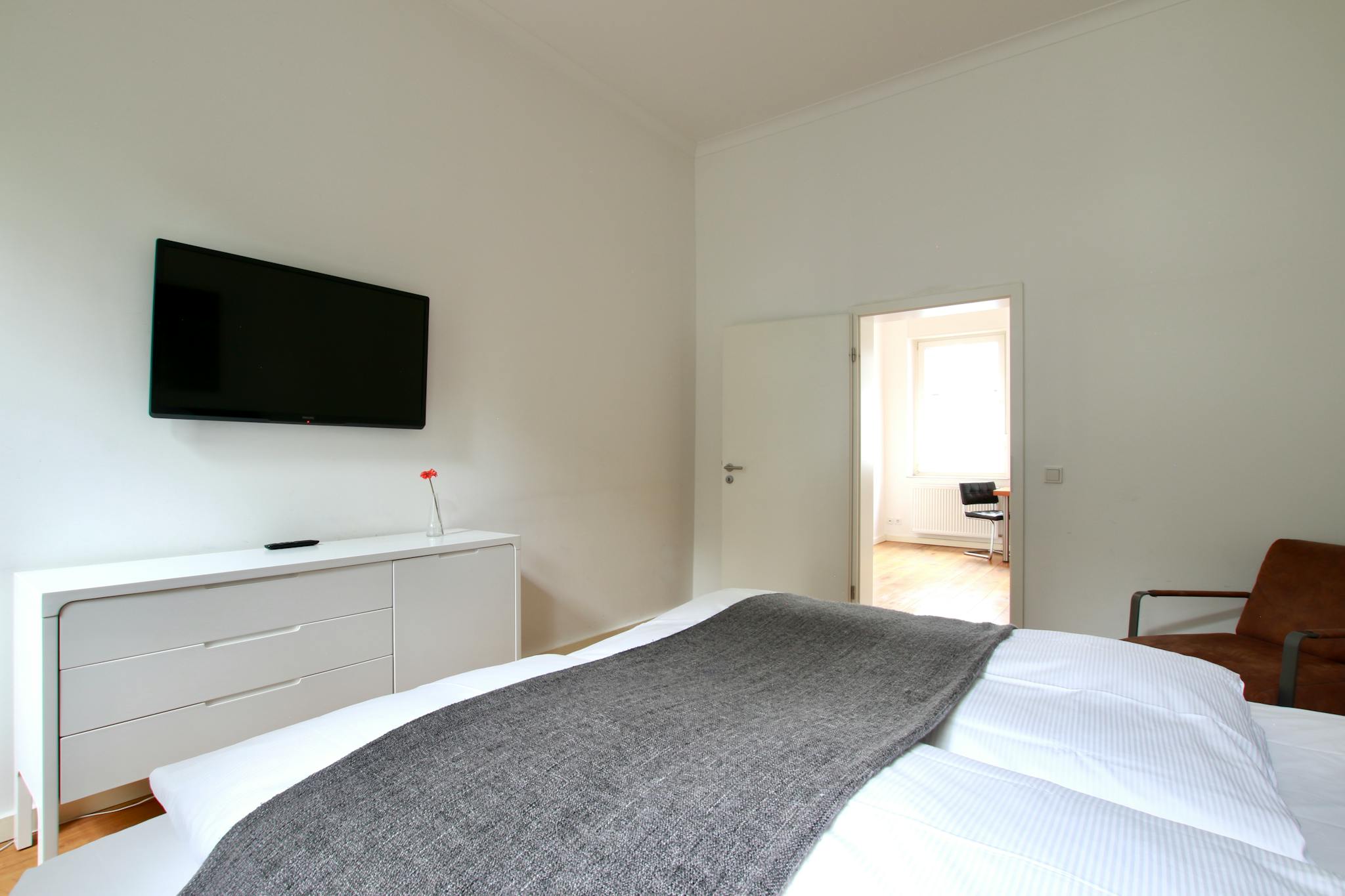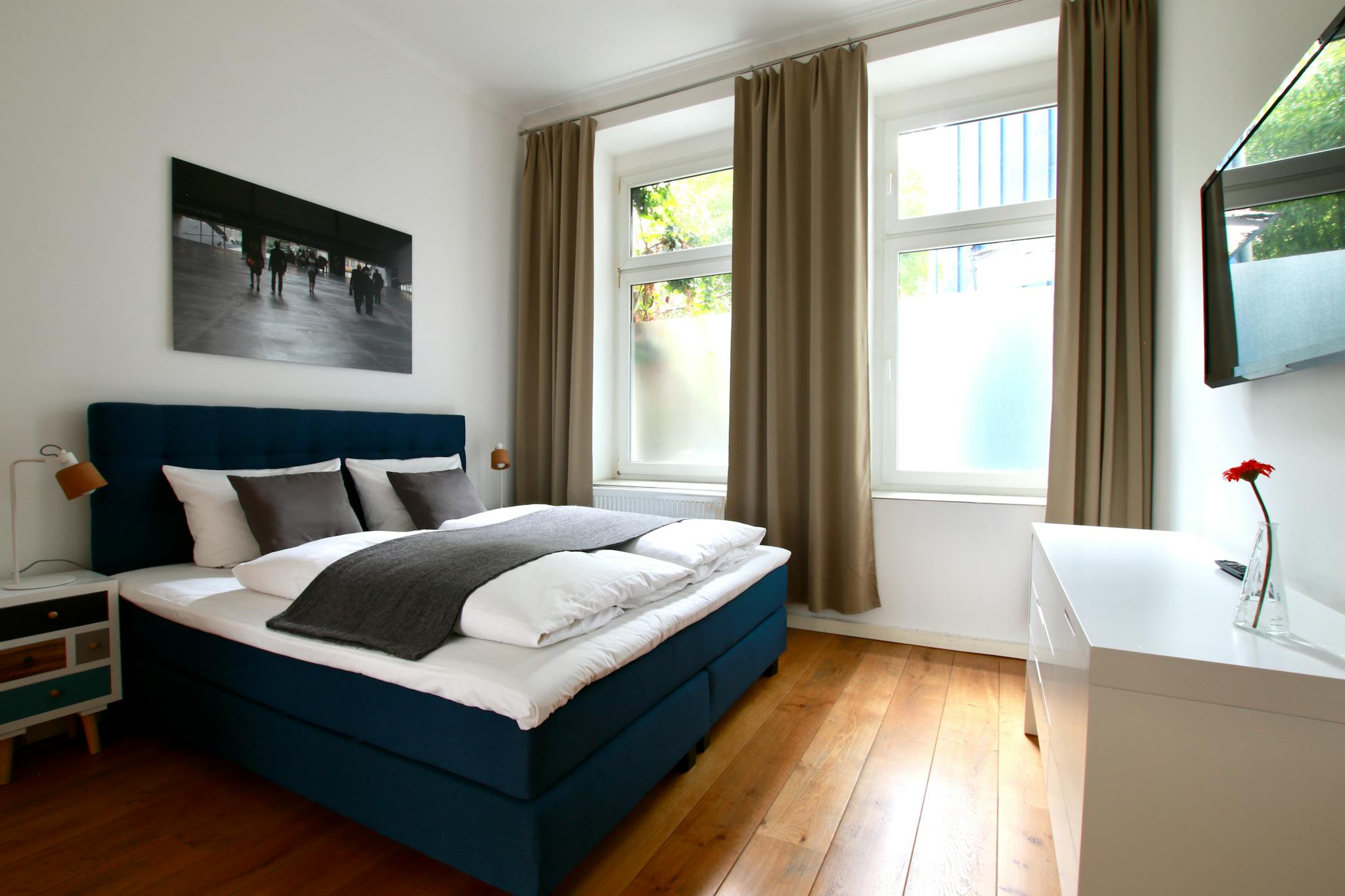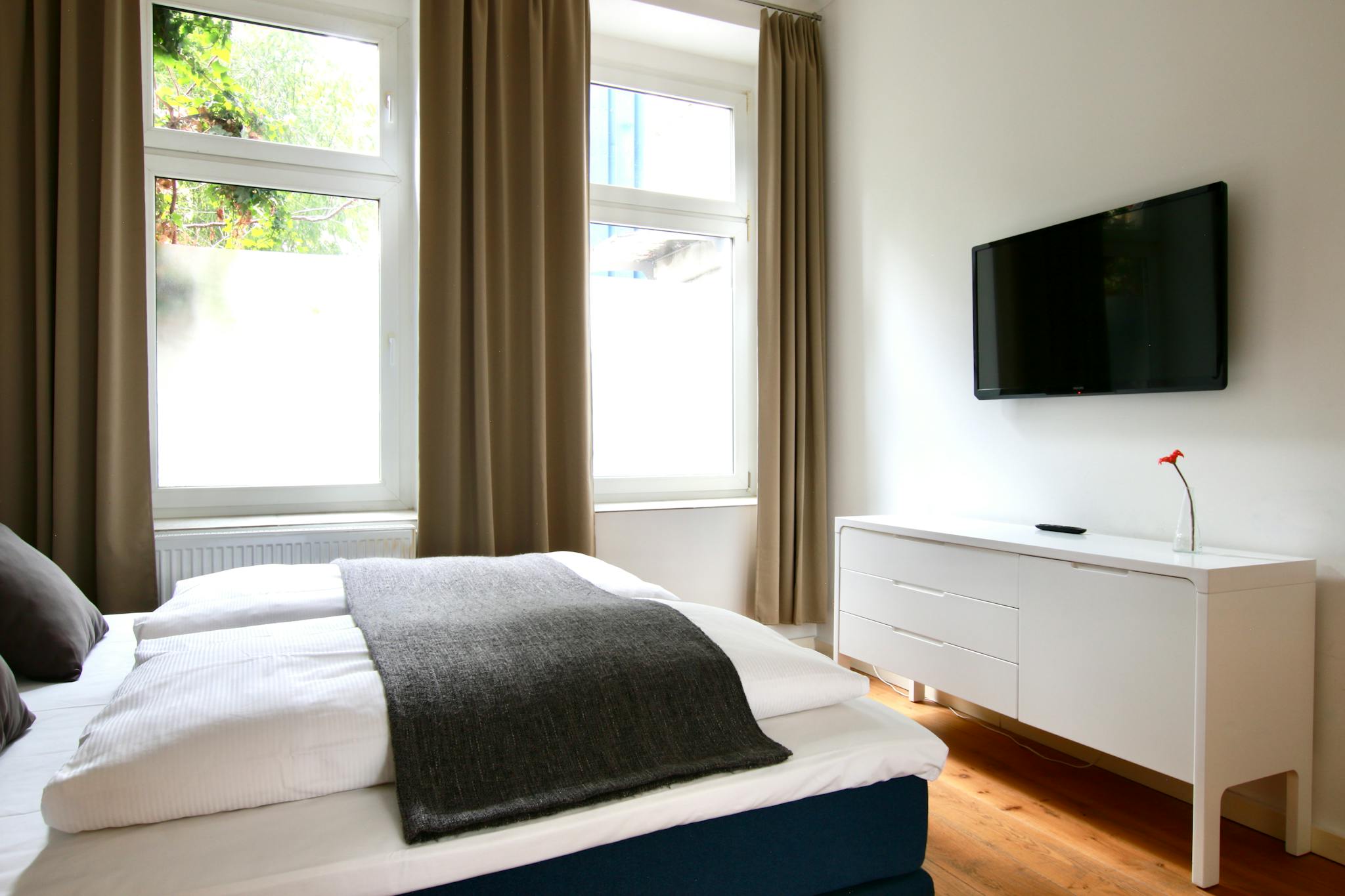 40 sqm bright apartment with beautiful wooden floors on the ground floor of a 3-story apartment building in a quiet side street in the Deutz district. The cozy kitchen with dining table has a refrigerator, stove, oven, kettle, and coffee maker. The separate bedroom has a box spring bed (180 cm width), armchair, and TV; the entrance hall comes with a large wardrobe, iron & ironing board. The modern bathroom has a shower and hairdryer.