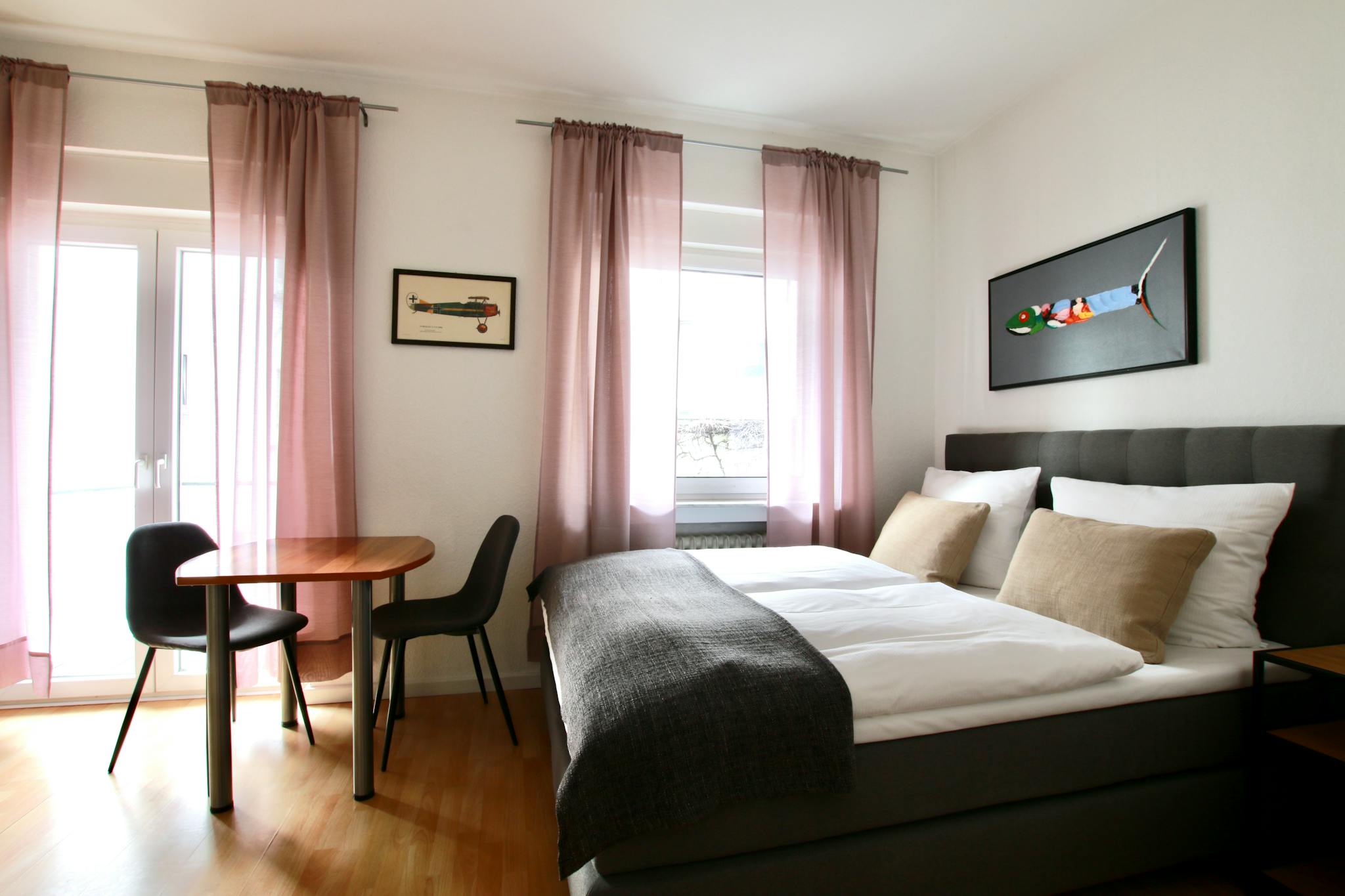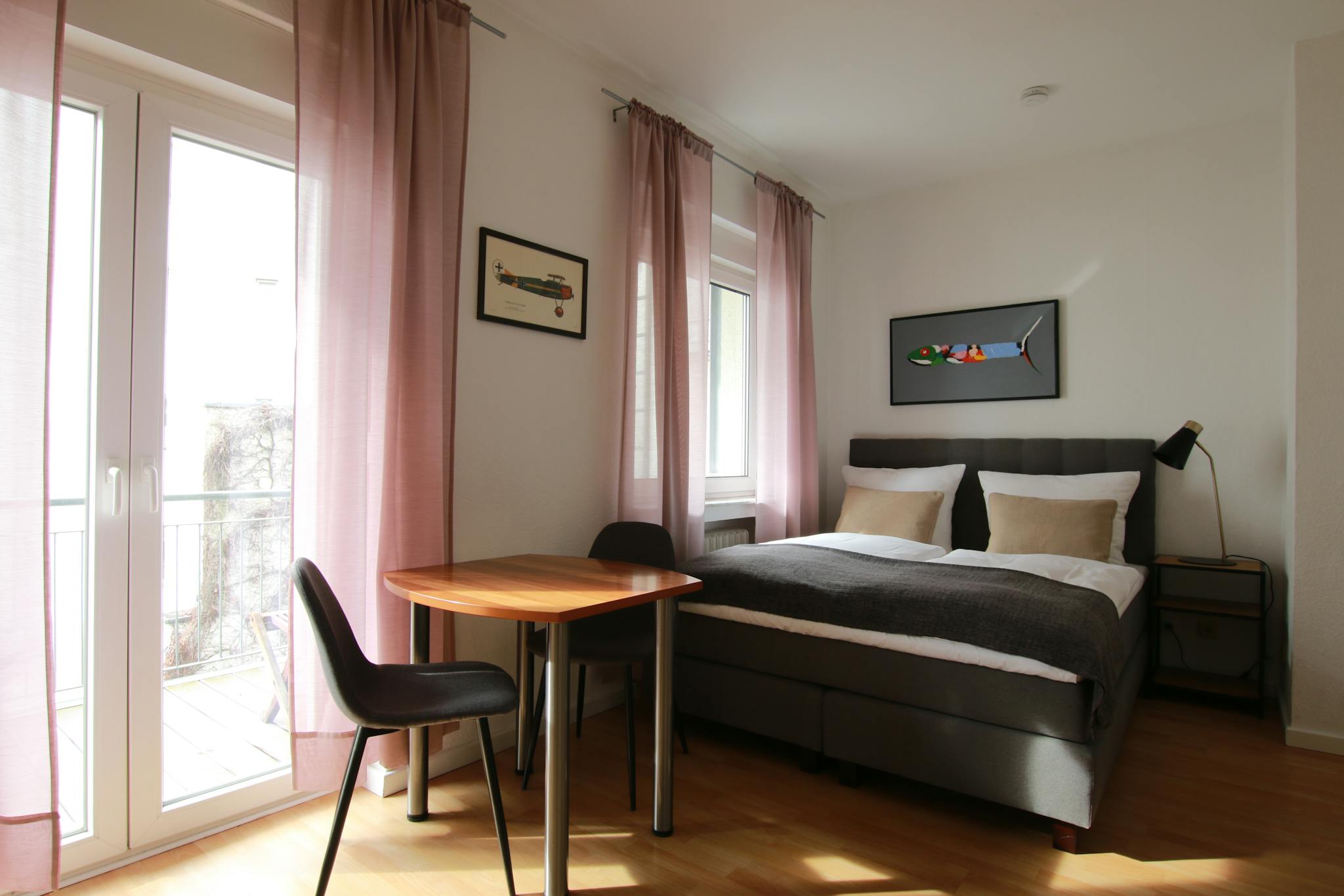Das 25 qm Apartment ist komfortabel und modern eingerichtet. Es verfügt über ein bequemes queen size Boxpsringbett, eine Küchenzeile mit Kühlschrank, Kochfeld, Mikrowelle, Kaffeemaschine und einem Wasserkocher. Das Bad ist mit einer einer Dusche ausgestattet. Fön, Handtücher und Bettwäsche sind vorhanden. Ein schöner Balkon gehört auch zur Wohnung.