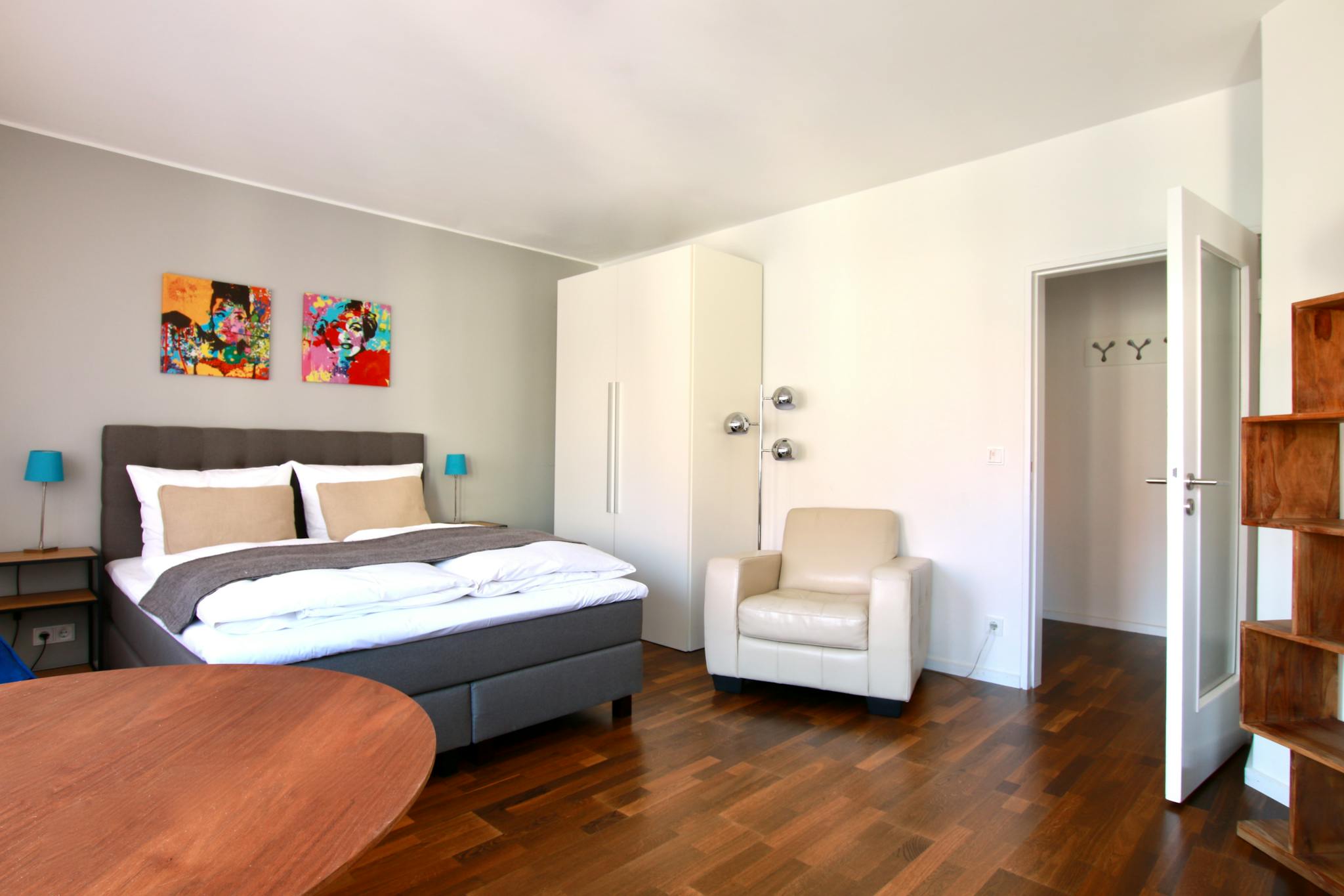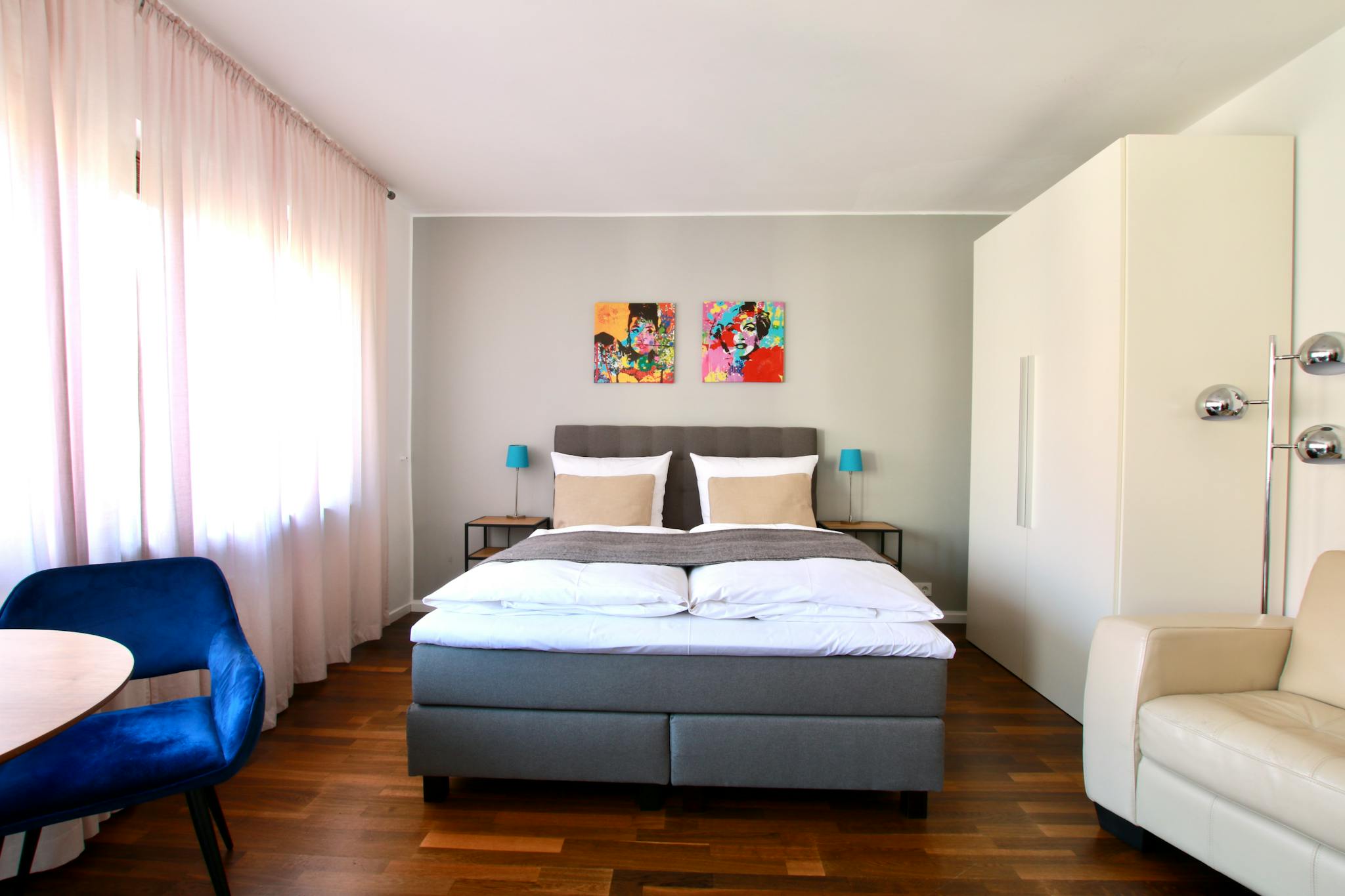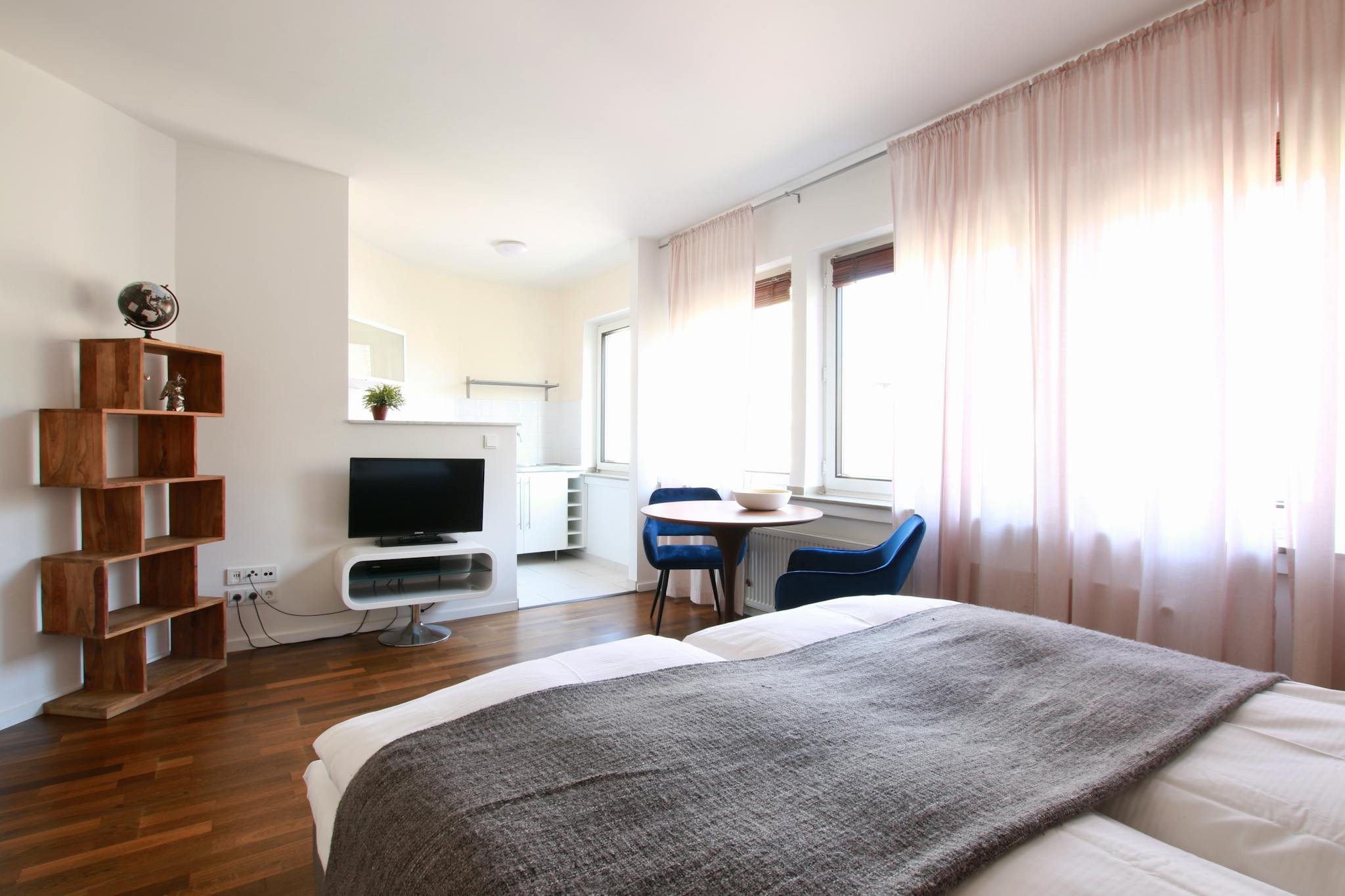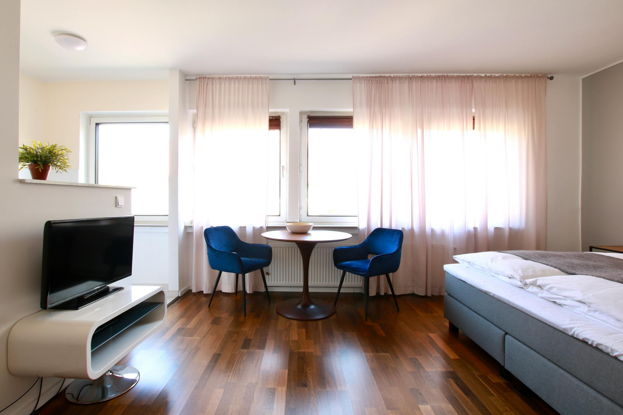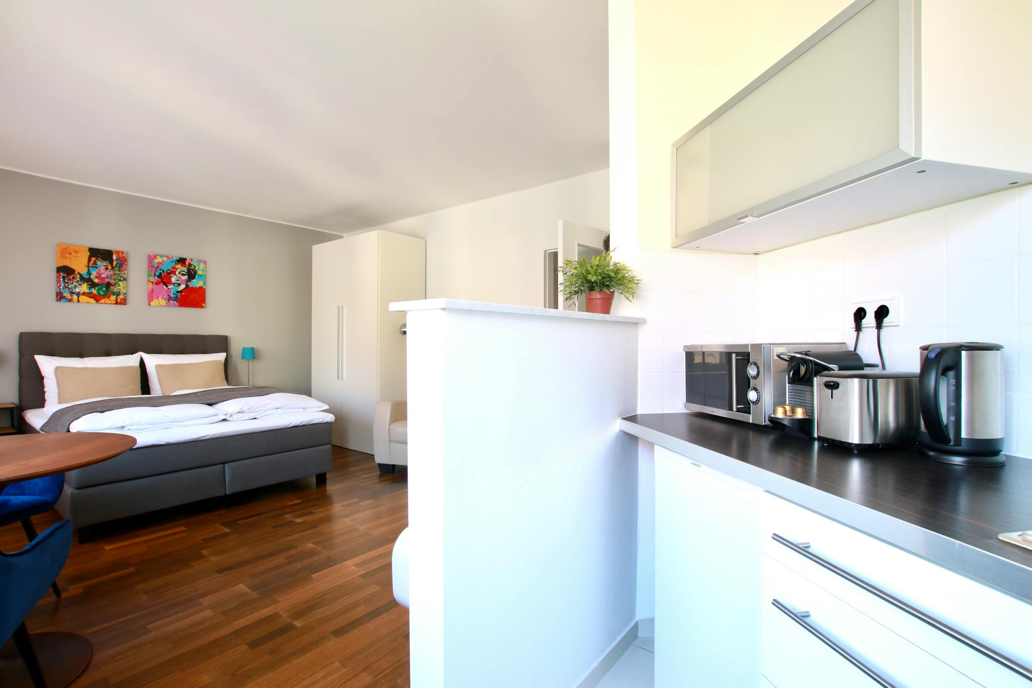 28qm großes Studio-Apartment im 3. OG eines 4-stöckigen Apartmenthauses und großer Fensterfront zu einer ruhigen Seitenstraße. Offener Wohnraum mit Laminatboden, Boxspringbett (160cm breit), Schrank, Bügeleisen & Bügelbrett, Sessel, TV, modernem Wannenbad mit Föhn, und voll ausgestatteter Küchenzeile mit Kühlschrank, Cerankochfeld, Wasserkocher, Kaffeemaschine, Toaster und Mikrowelle. Kostenloses Wlan ist verfügbar.