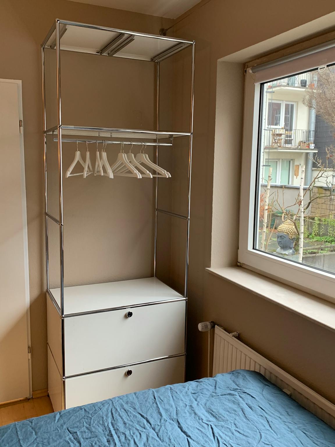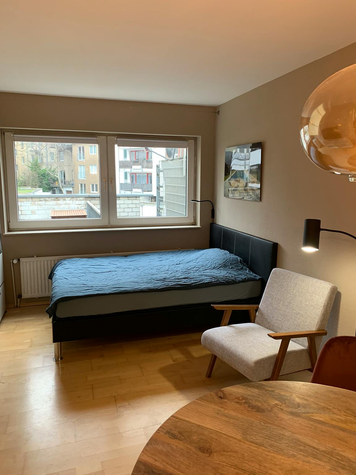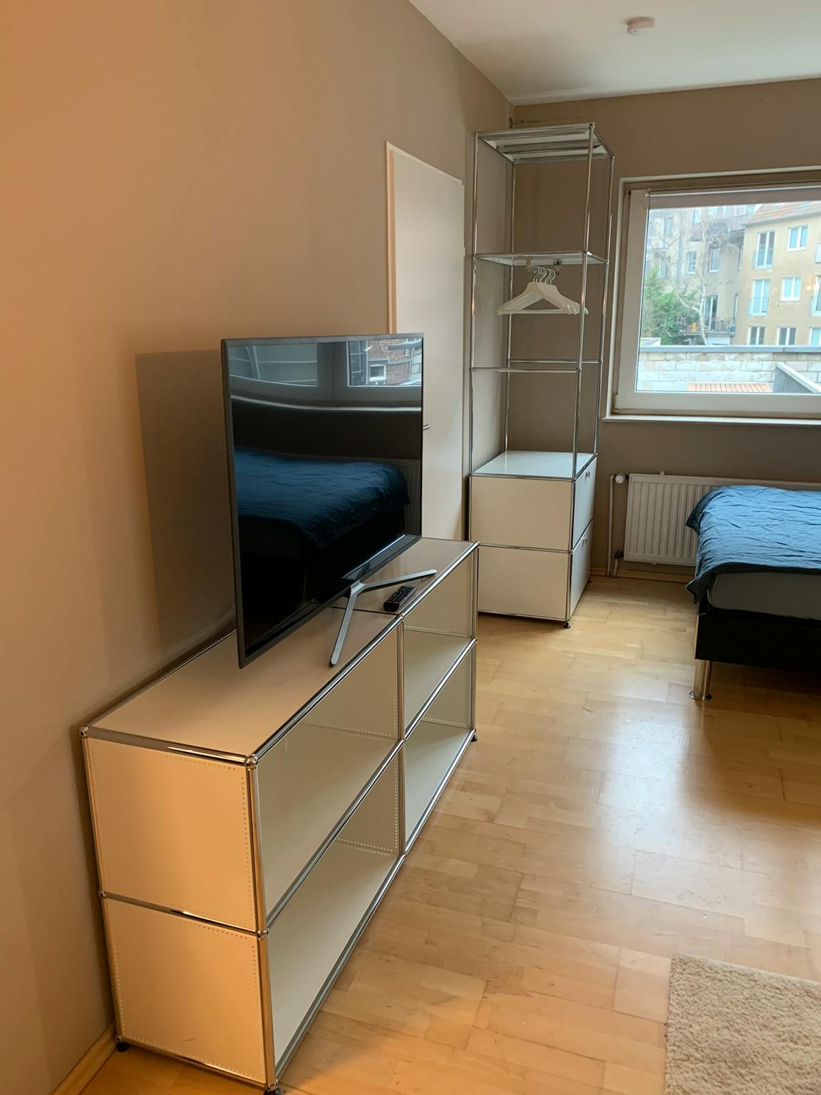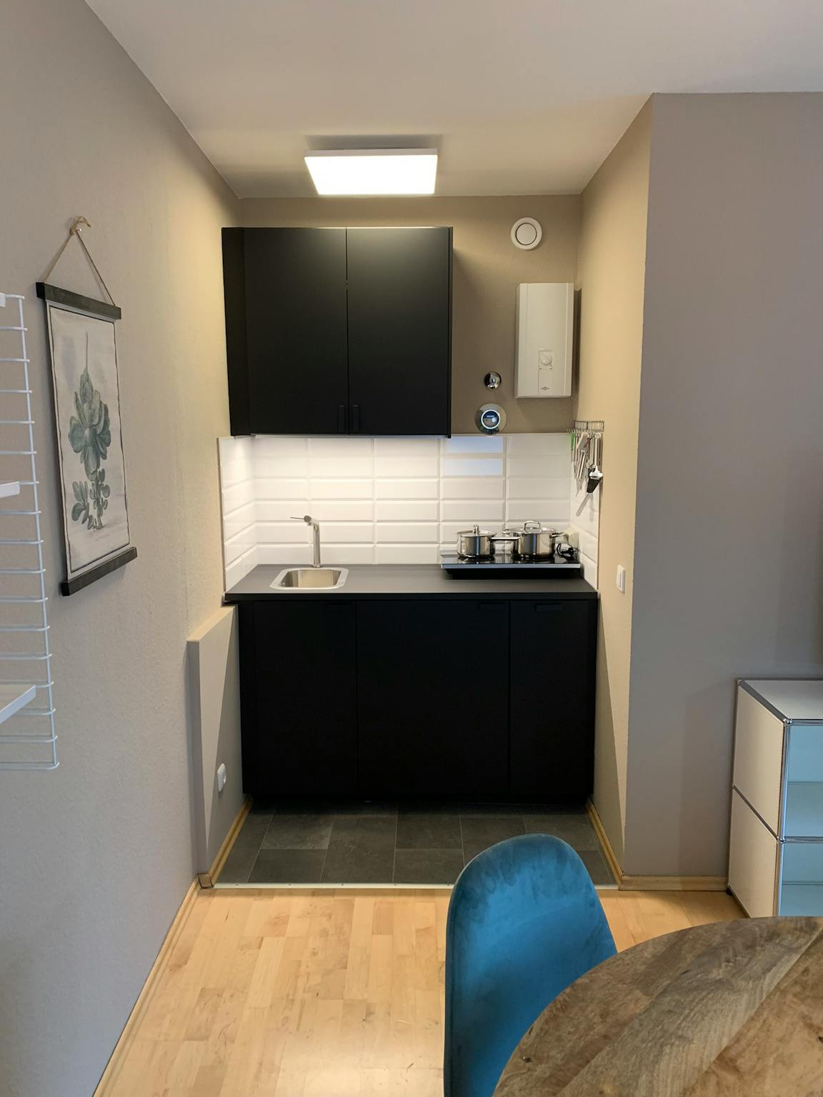Die Ausstattung der Wohnung ist top. Sie verfügt über echtes Eichenparkett, eine matt schwarze nagelneue Einbauküche inkl. Küchenutensilien, ein Samsung Smart-TV, Möbel von Maison du Monde und USM Haller und ein Boxspring-Doppelbett mit zwei Bettzeug-Garnituren. Alles in allem schafft dies ein sehr individuelles Ambiente zum Wohlfühlen.