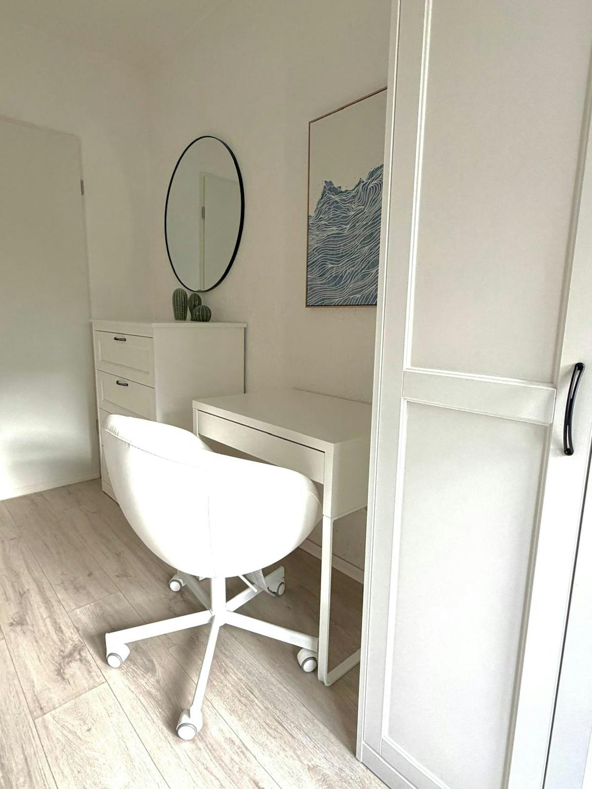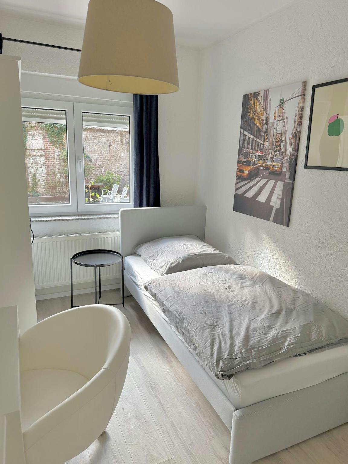 A comfortable, thoughtfully set up private room ideal for long stays. It features a cozy single bed with soft linens and a calm, minimalist feel. Large windows bring in natural light, while blackout curtains ensure restful sleep. You’ll have a desk and chair for working, plus a wardrobe and drawers for storage. The apartment includes a modern kitchen with essential appliances, cookware, and a washing machine, as well as a private balcony for relaxing. The bathroom is clean and stylish, with a walk-in shower, fresh towels, and all the essentials for everyday living.