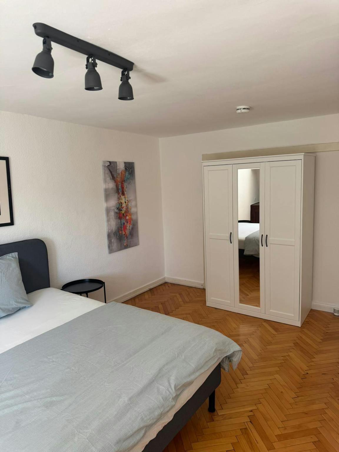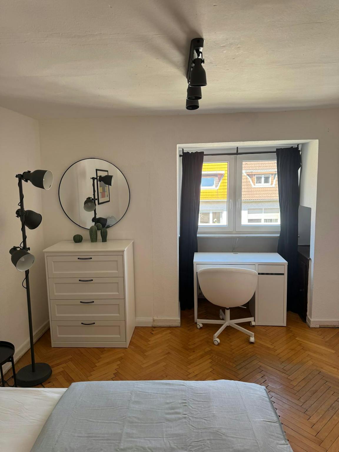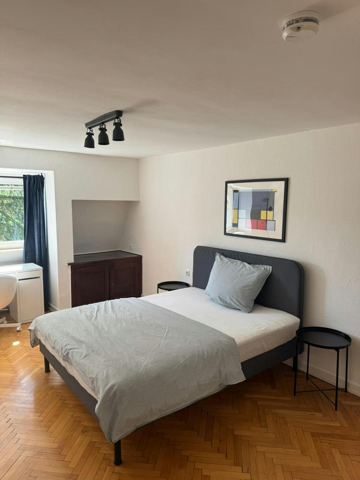 The apartment has 3 bedrooms. The rooms are particularly bright. The rooms are furnished with a king-size box-spring bed with fine linens, two bedside tables, a dresser, a large mirror, a work table with a matching chair, a floor lamp, and a large closet. In addition to that, you and your roommates share a spacious kitchen with a seating area. The kitchen is also equipped with cooking appliances and utensils. The bathroom has a bathtub, a shower, a toilet, and a sink.