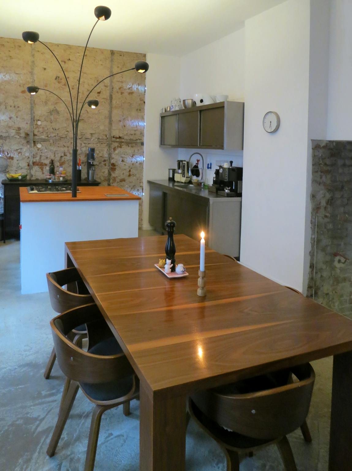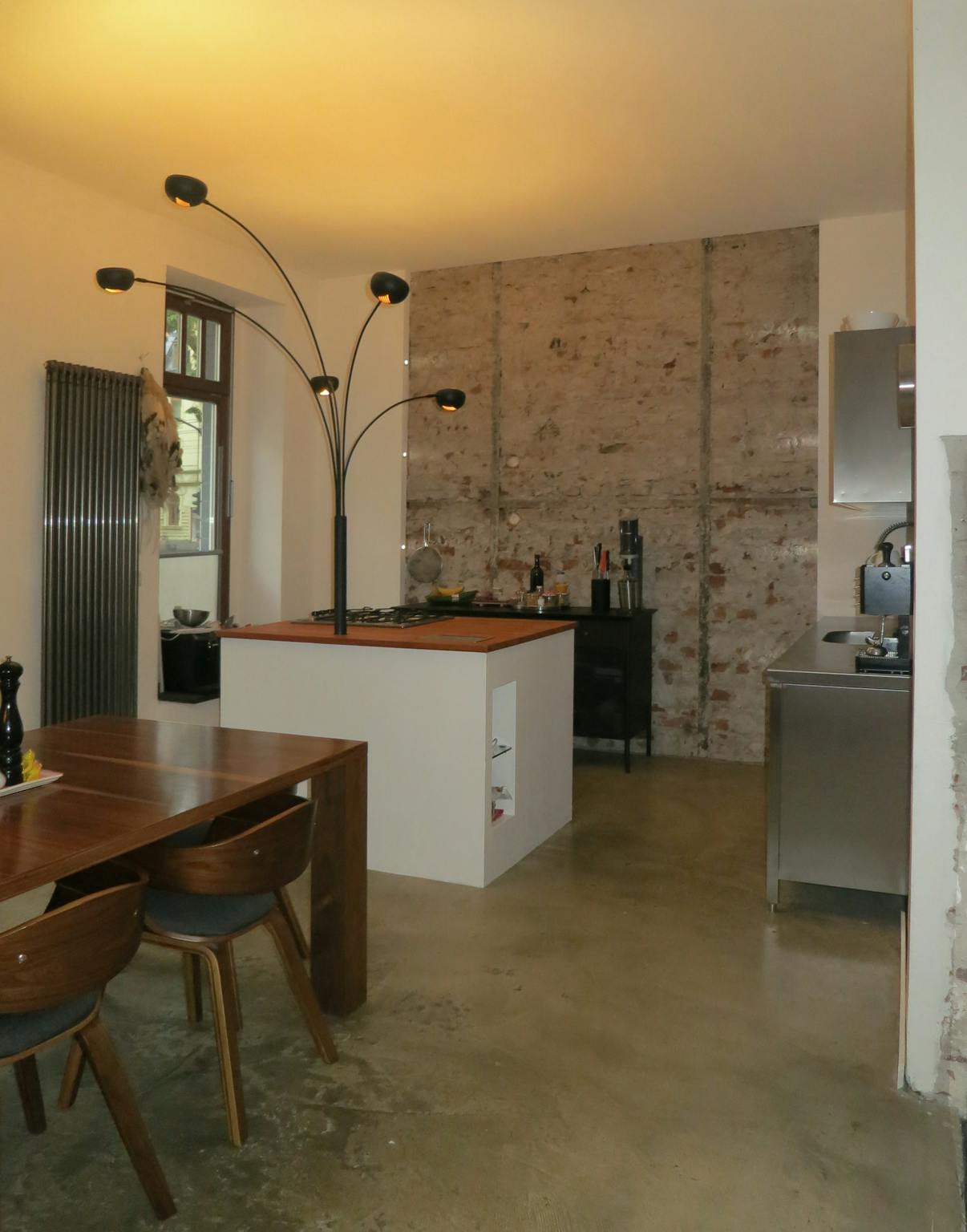 House in a house! The apartment is spread over three levels in a historic apartment building. The kitchen consists of a converted pub in industrial style with high quality stainless steel furniture. The living room and bedroom are located in the quiet annex with a view of the spacious backyard.