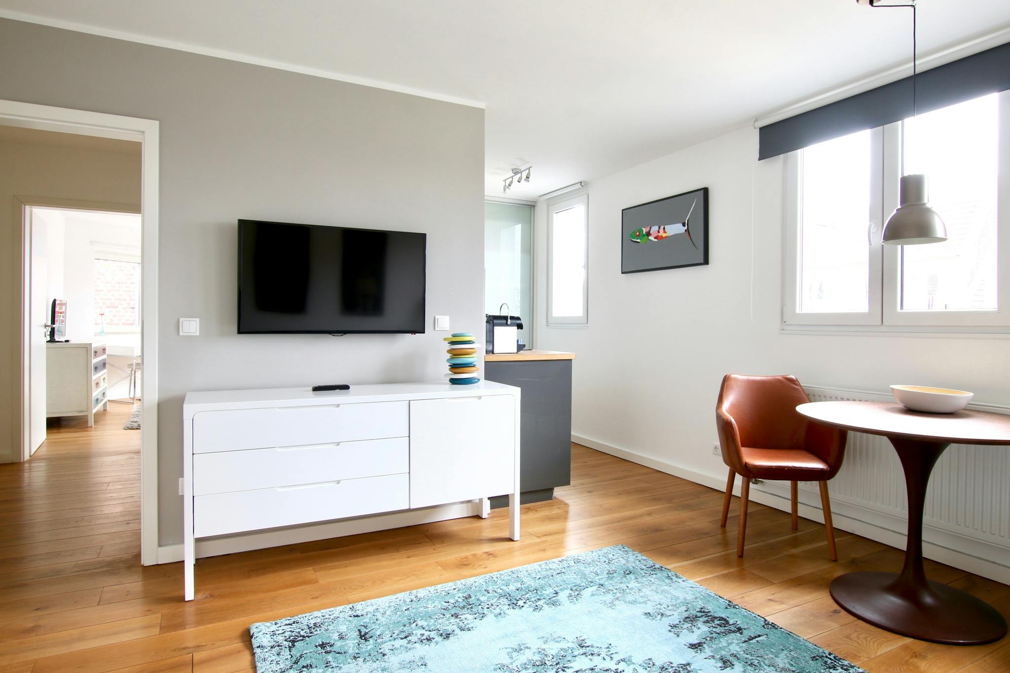40qm großes Apartment mit kleiner Terrasse im Dachgeschoss eines 6-stöckigen Apartmenthauses an einer Straßenkreuzung im quirligen Belgischen Viertel. Der offene Wohnraum mit Holzfußboden verfügt über Esstisch, Schlafsofa, TV und eine voll ausgestattete Küche mit Kühlschrank, Cerankochfeld, Backofen, Wasserkocher, und Kaffeemaschine. Im separaten Schlafzimmer befindet sich ein Boxspringbett (160cm breit), Schrank, Bügeleisen & Bügelbrett, Arbeitsplatz und ein weiterer Fernseher. Das kleine Bad verfügt über Dusche & Föhn.
