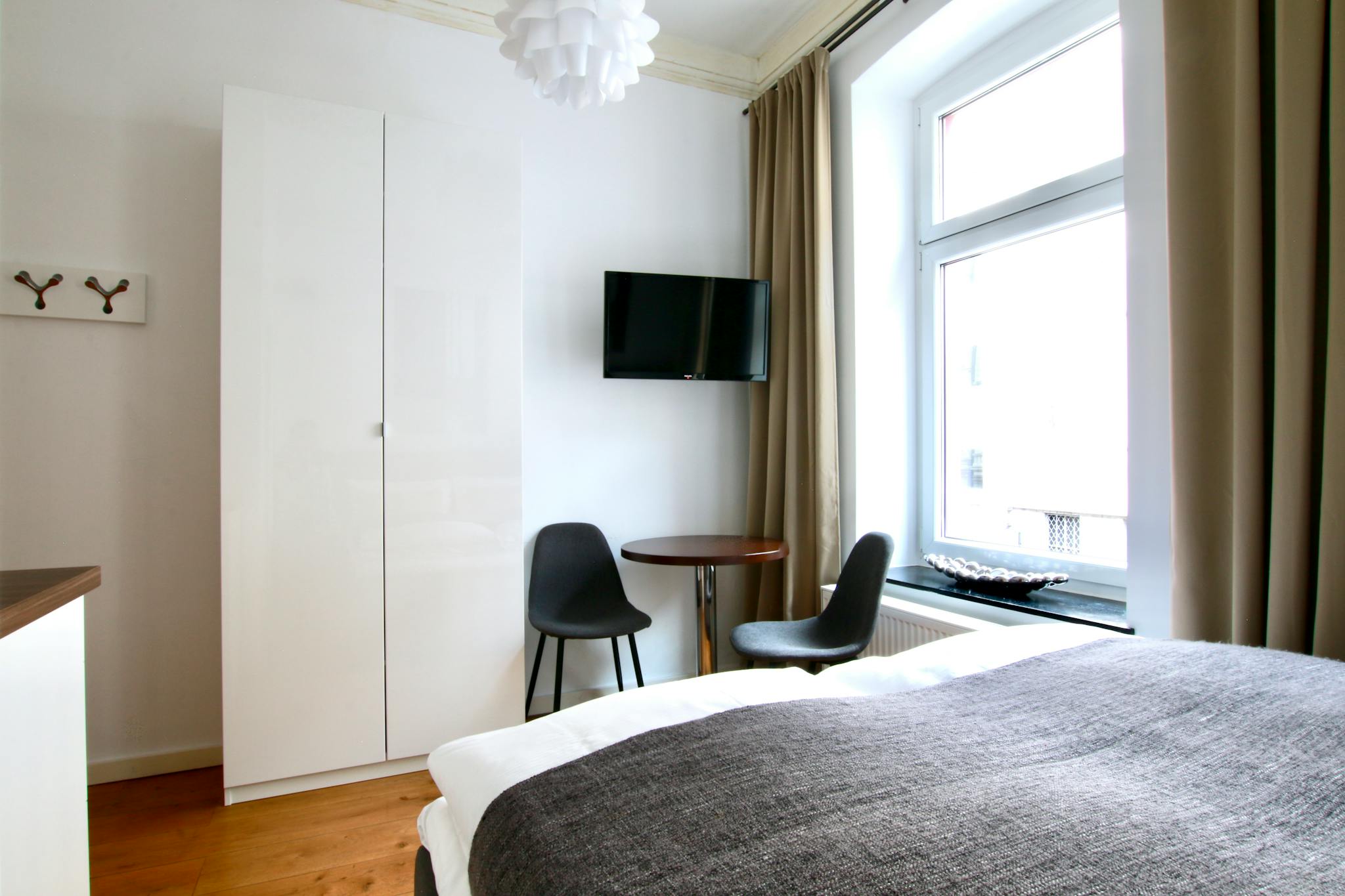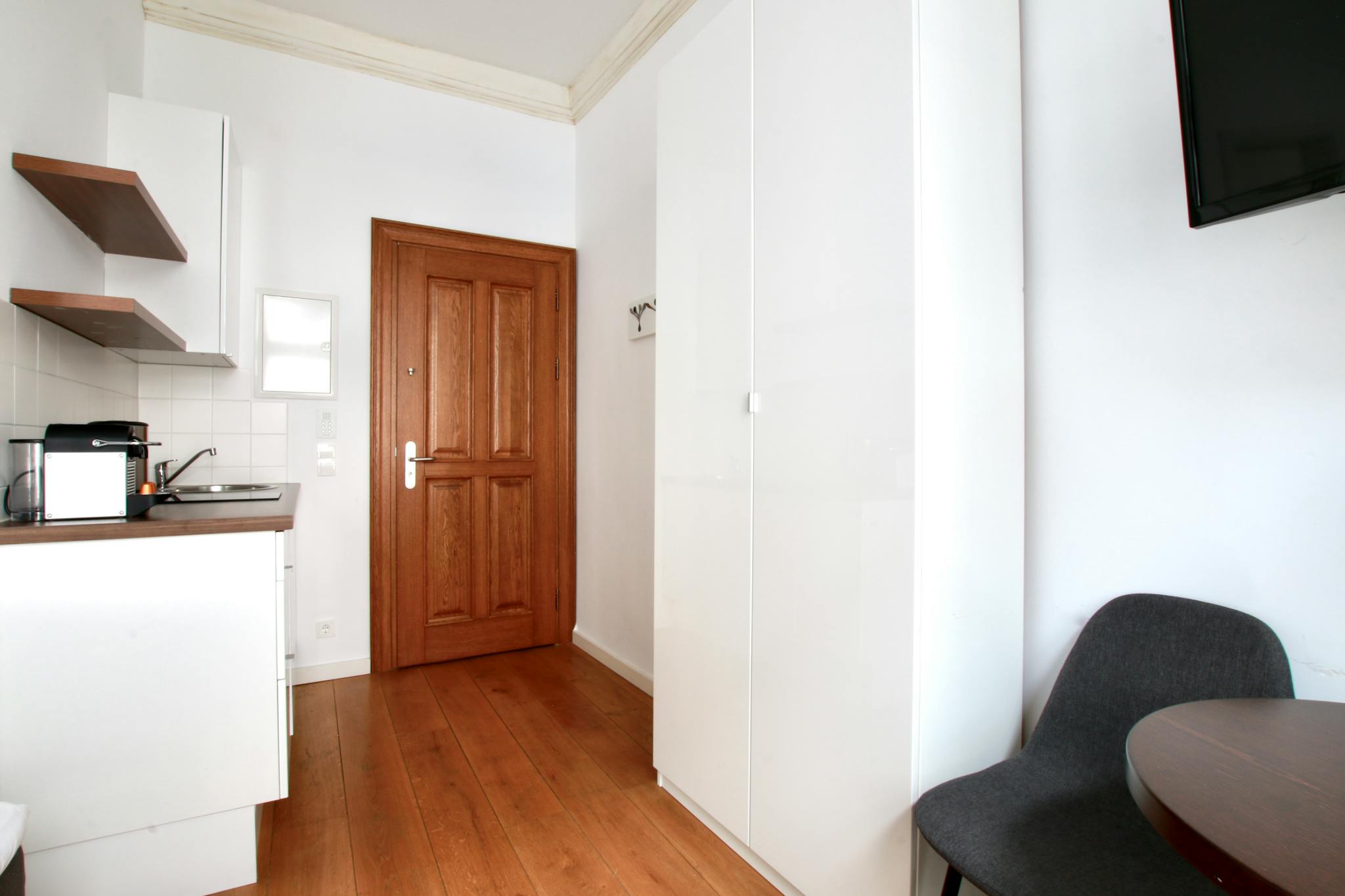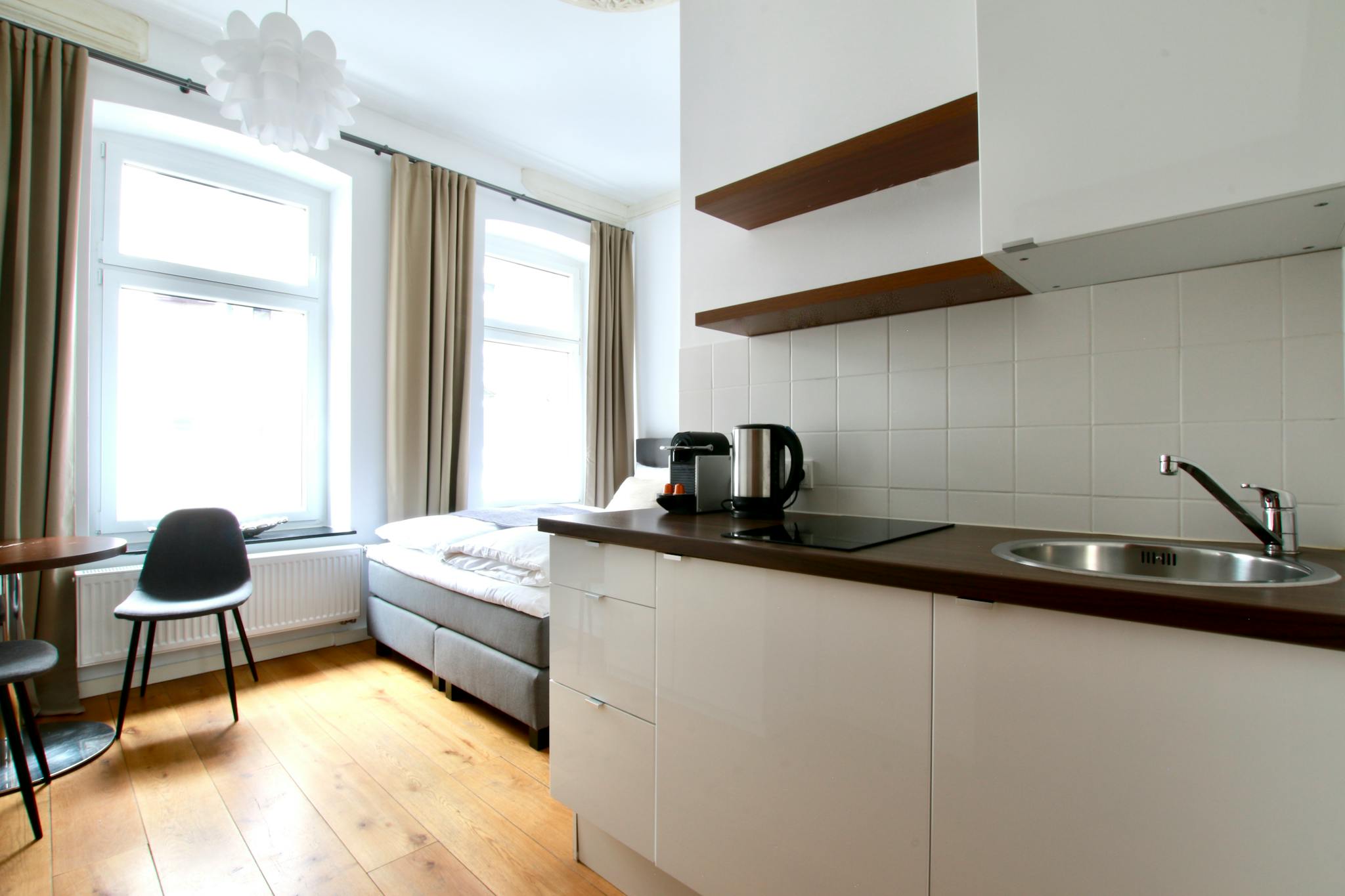 The 20 sqm studio apartment is very modern and comfortable furnished. There is a comfortable queen size bed (1,60m x 2m), a kitchenette with a fridge, hob, electric cattle, a Nespresso capsule coffeemaker and a small table with two chairs. The bath has a shower. A blow-dryer, shower gel, towels and linens for the bed are supplied.