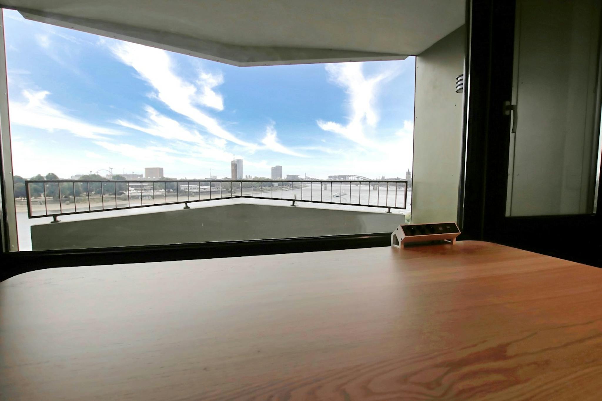 This centrally located 2-room apartment offers 68sqm and is located 1km north of the Cologne Central Station in the immediate distance to the Rhine River and at the foot of a beautiful park. The view from the two loggias towards the Rhine and the Cologne cathedral is unique during the day, as well as in the evening and at night. In addition to a bedroom and a large living room with a dining table, there is a kitchen and a spacious bathroom and a guest toilet.