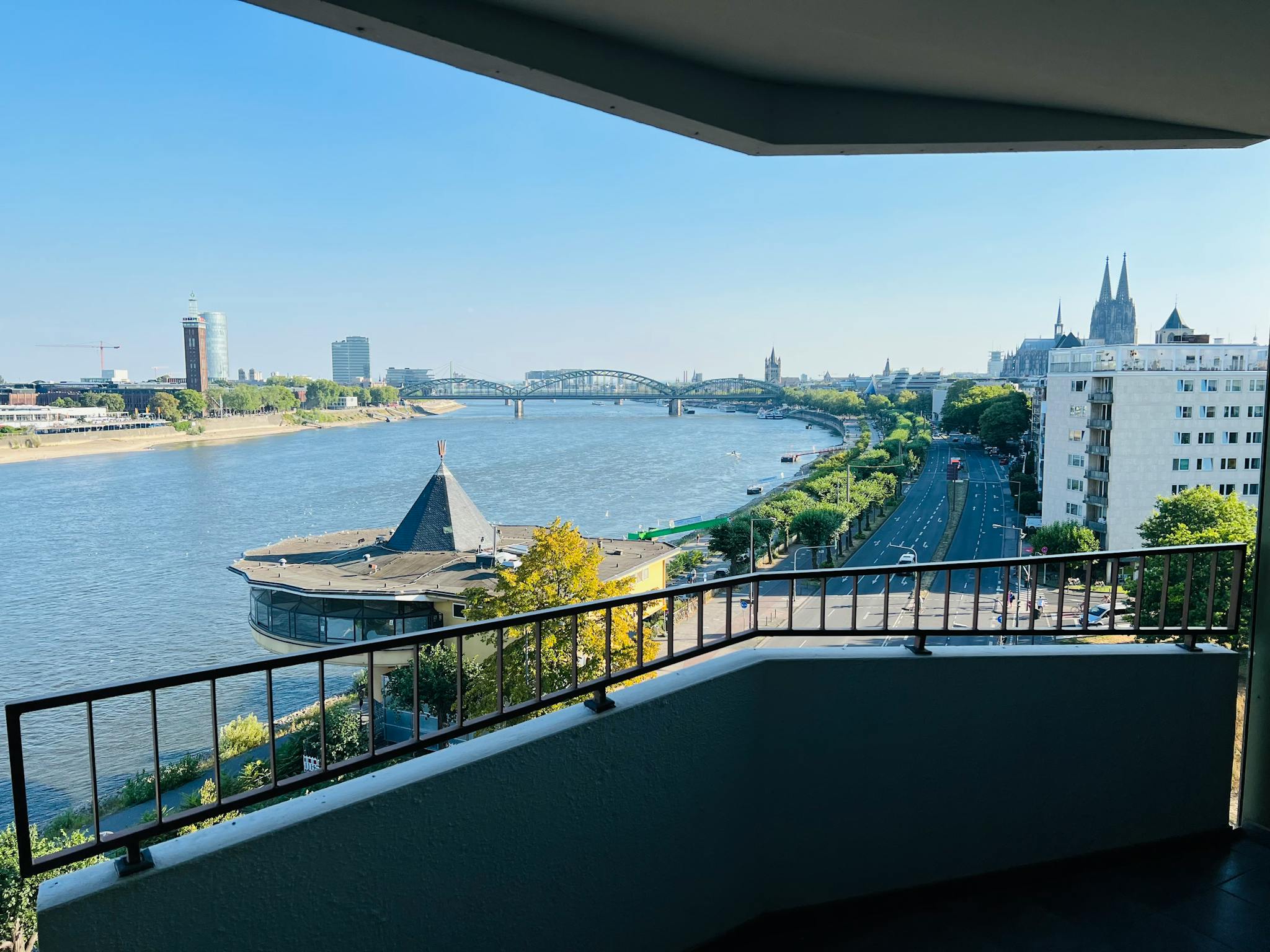 Diese zentral gelegene 2-Zimmer Wohnung ist 68qm groß und befindet sich 1km nördlich vom Kölner Hauptbahnhof in unmittelbarer Rheinnähe und am Fuße einer schönen Parkanlage. Der Ausblick von den zwei Loggien auf den Rhein und den Dom ist einmalig am Tage, wie auch am Abend und in der Nacht. Neben einem Schlafzimmer und einem großen Wohnzimmer mit Esstisch, gibt es eine Küche und ein großzügiges Badezimmer, sowie eine Gästetoilette.