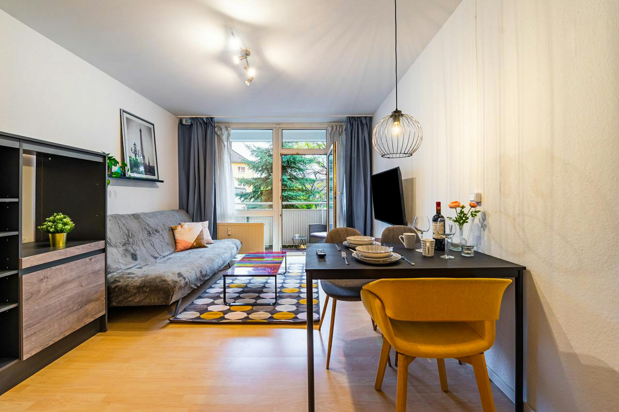 - 4 mins train ride to Cologne central station, few mins walk to train station "Trimbornstraße";