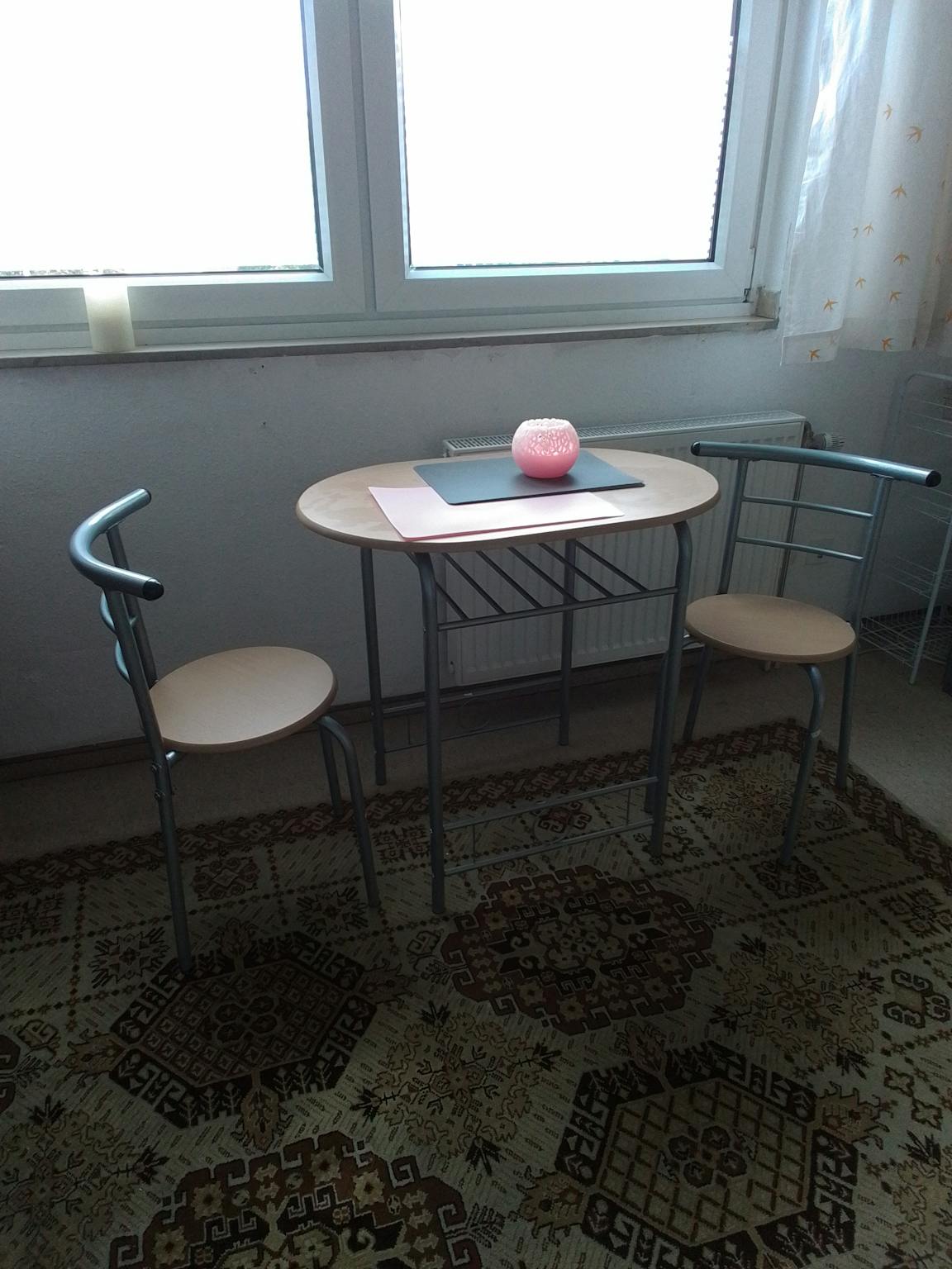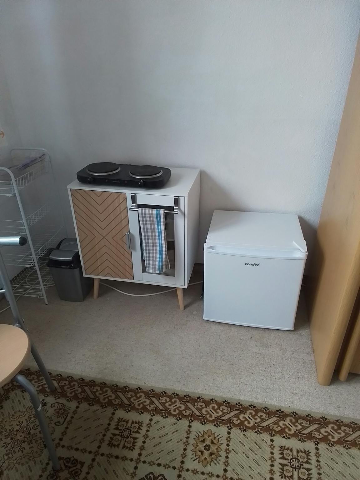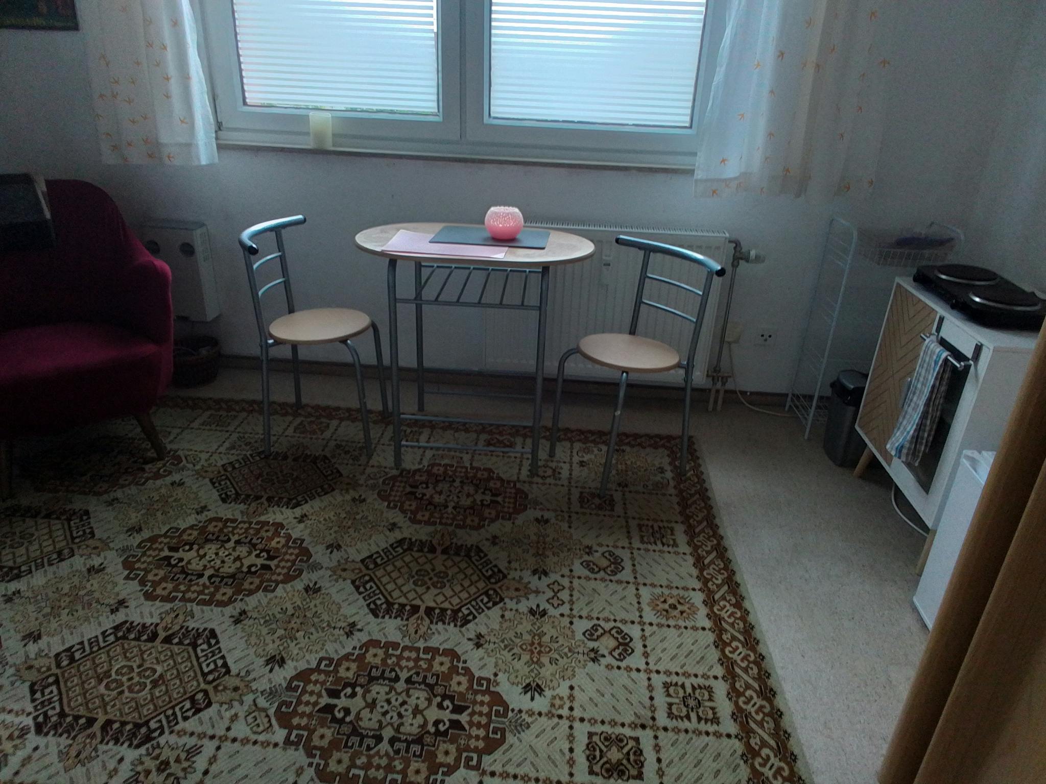 Das Zimmer ist komplett möbliert im angesagten Industriedesign mit Bett, Sessel, Essbereich bestehend aus Tisch mit Stühlen, Schreibtisch, Kleiderschrank, Kühlschrank, Kochnische mit Herd,entsprechendem Geschirr und Kochutensilien zur Zubereitung von Mahlzeiten