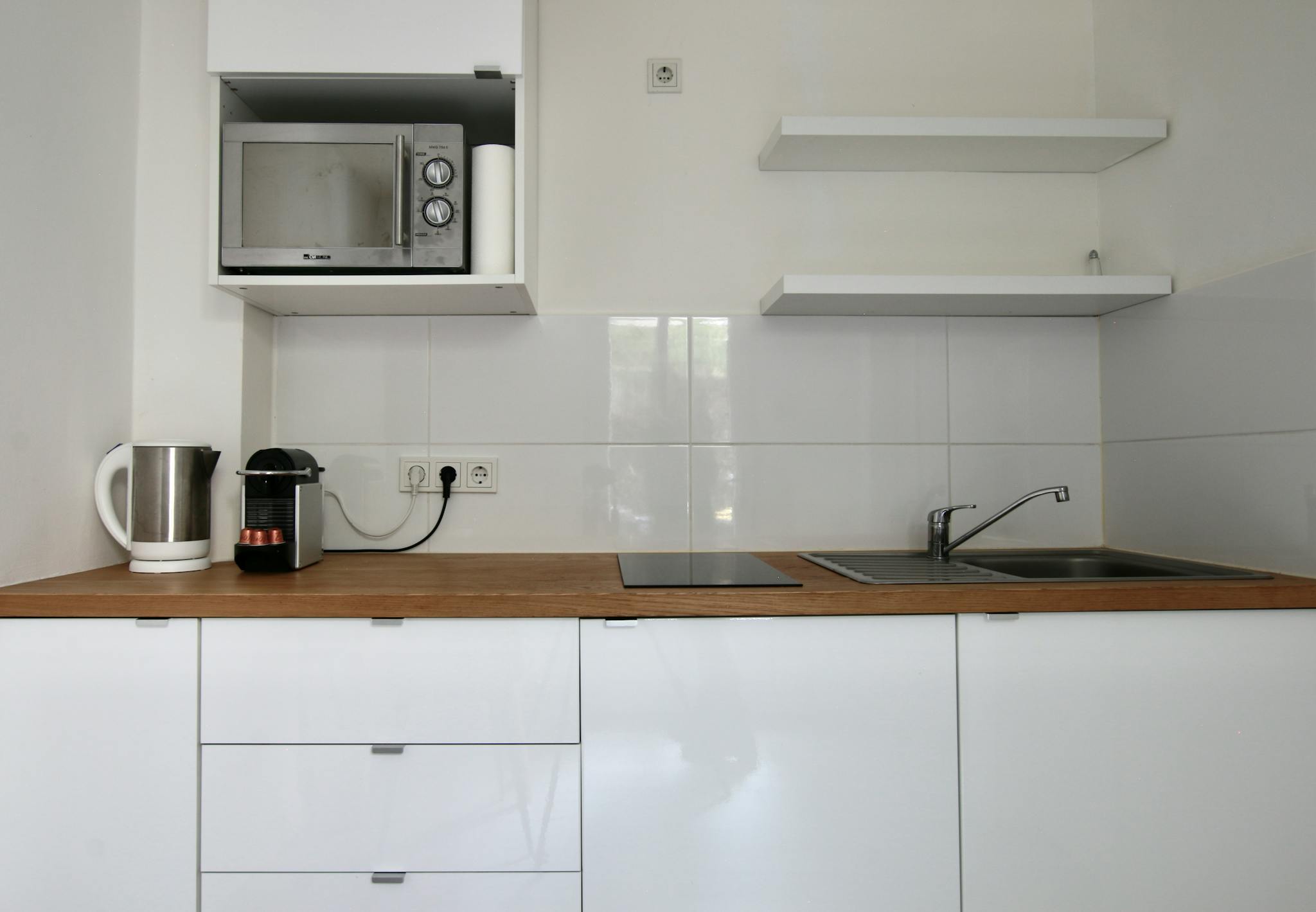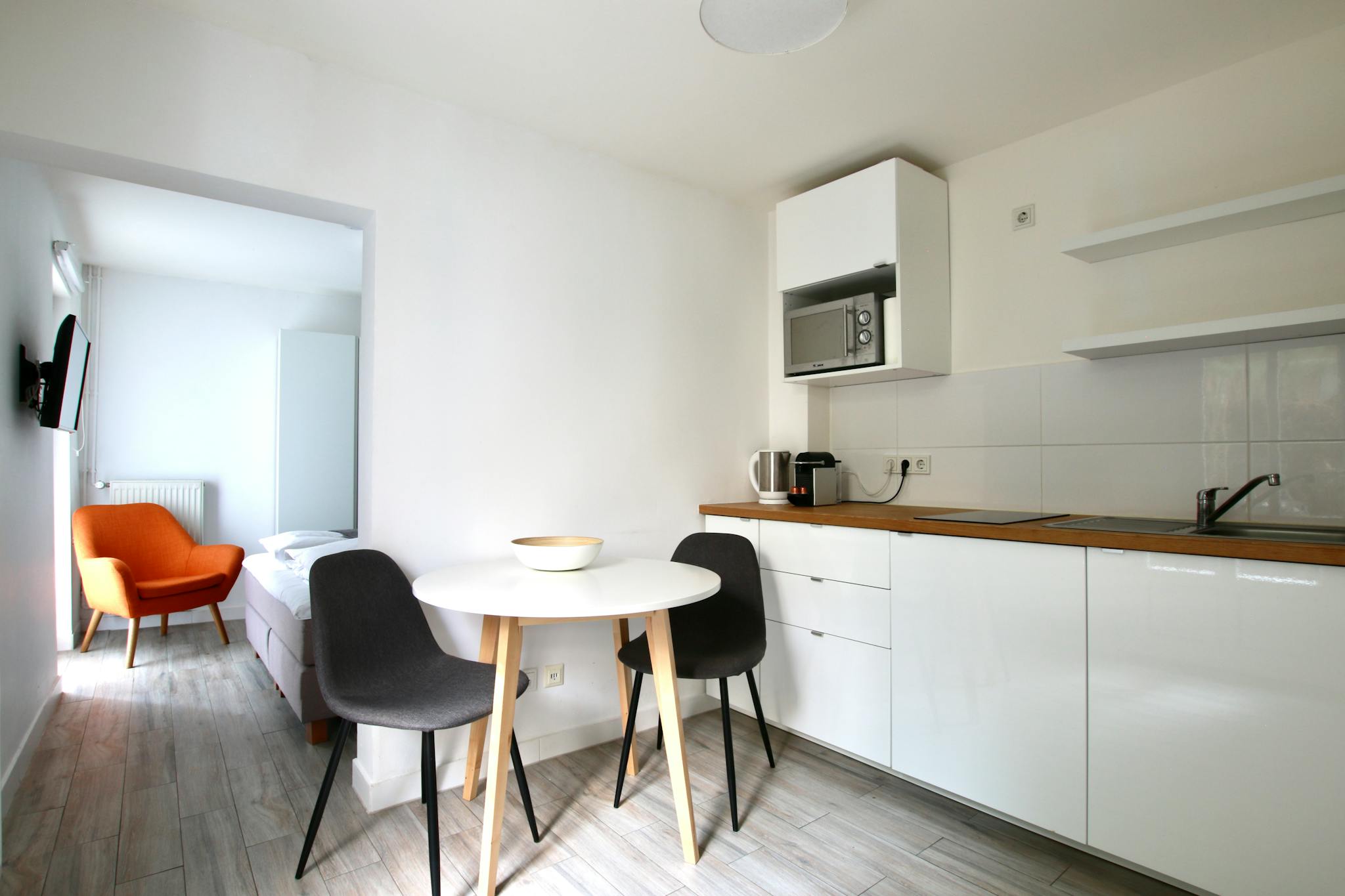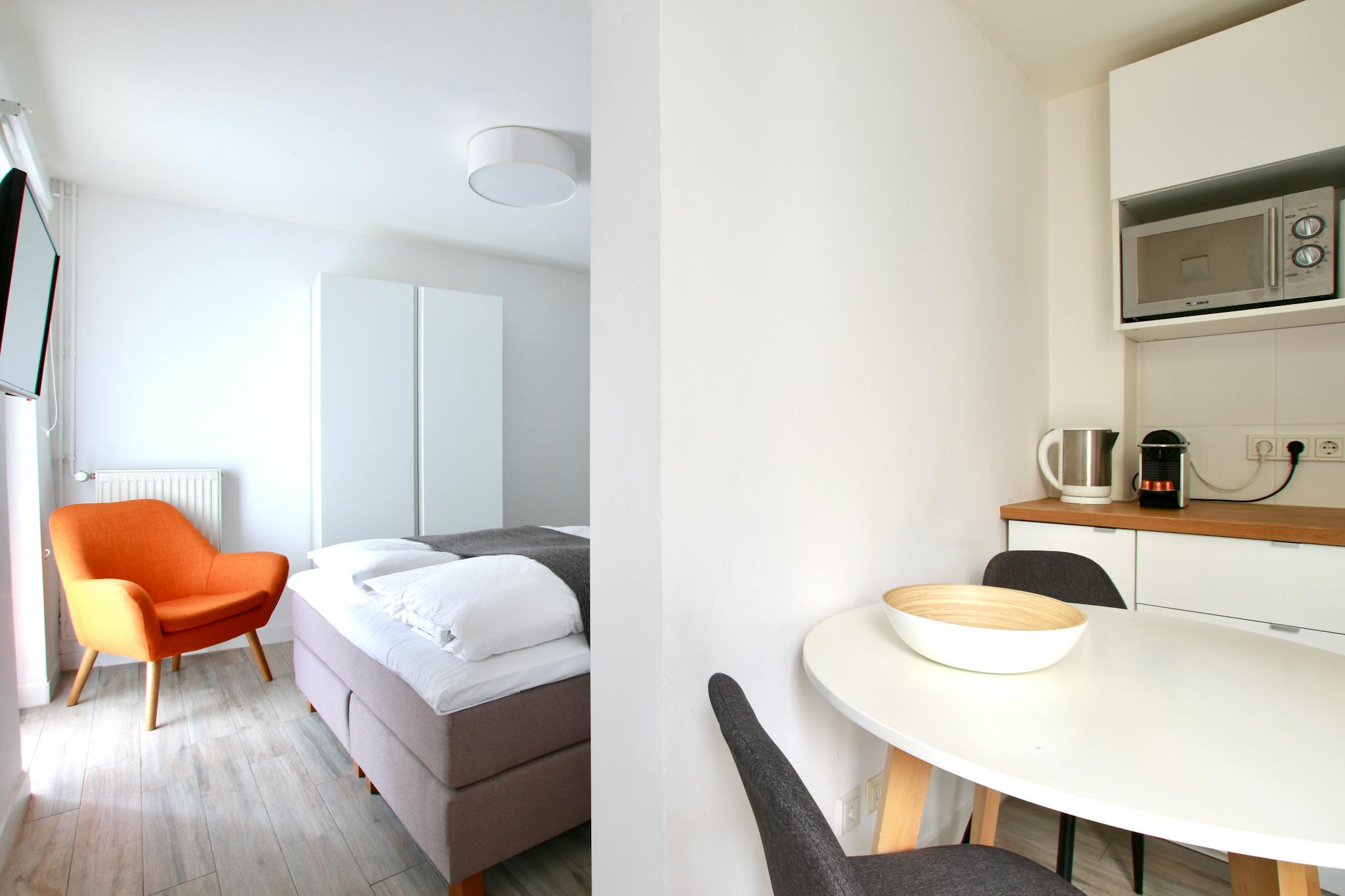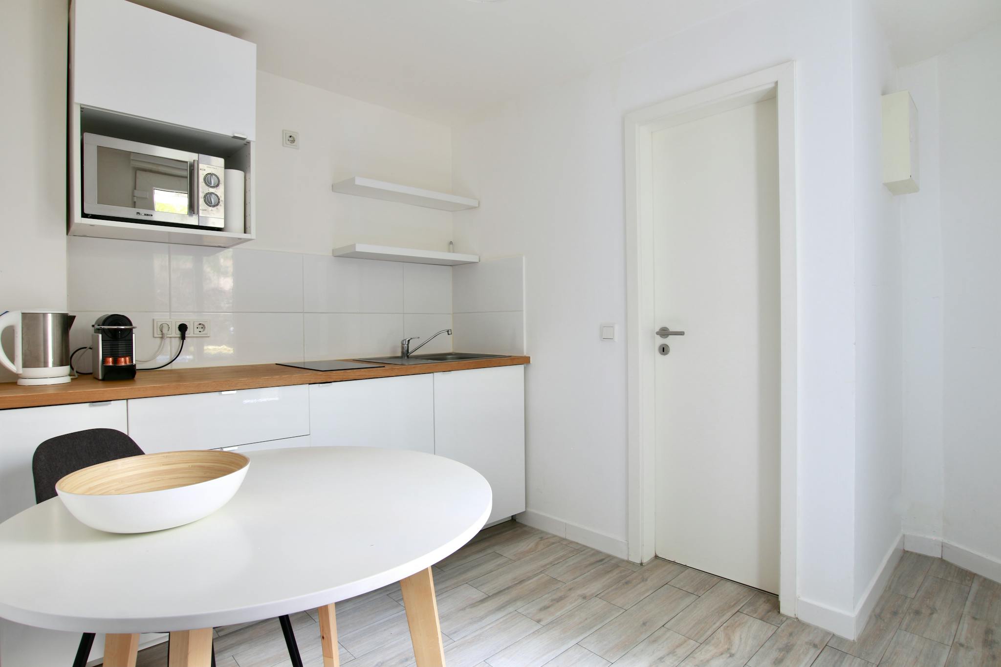 25qm Studio-Apartment im Erdgeschoss eines 3-stöckigen Apartmenthauses in einer ruhigen Seitenstraße im Stadtteil Deutz. Der offene Wohnraum mit Laminatboden verfügt über Boxspringbett (160cm breit) Schrank, Bügeleisen & Bügelbrett, Sessel, TV, Esstisch und voll ausgestattete Küche mit Kühlschrank, Kochfeld, Mikrowelle, Wasserkocher und Kaffeemaschine. Das Badezimmer hat Dusche und Föhn.