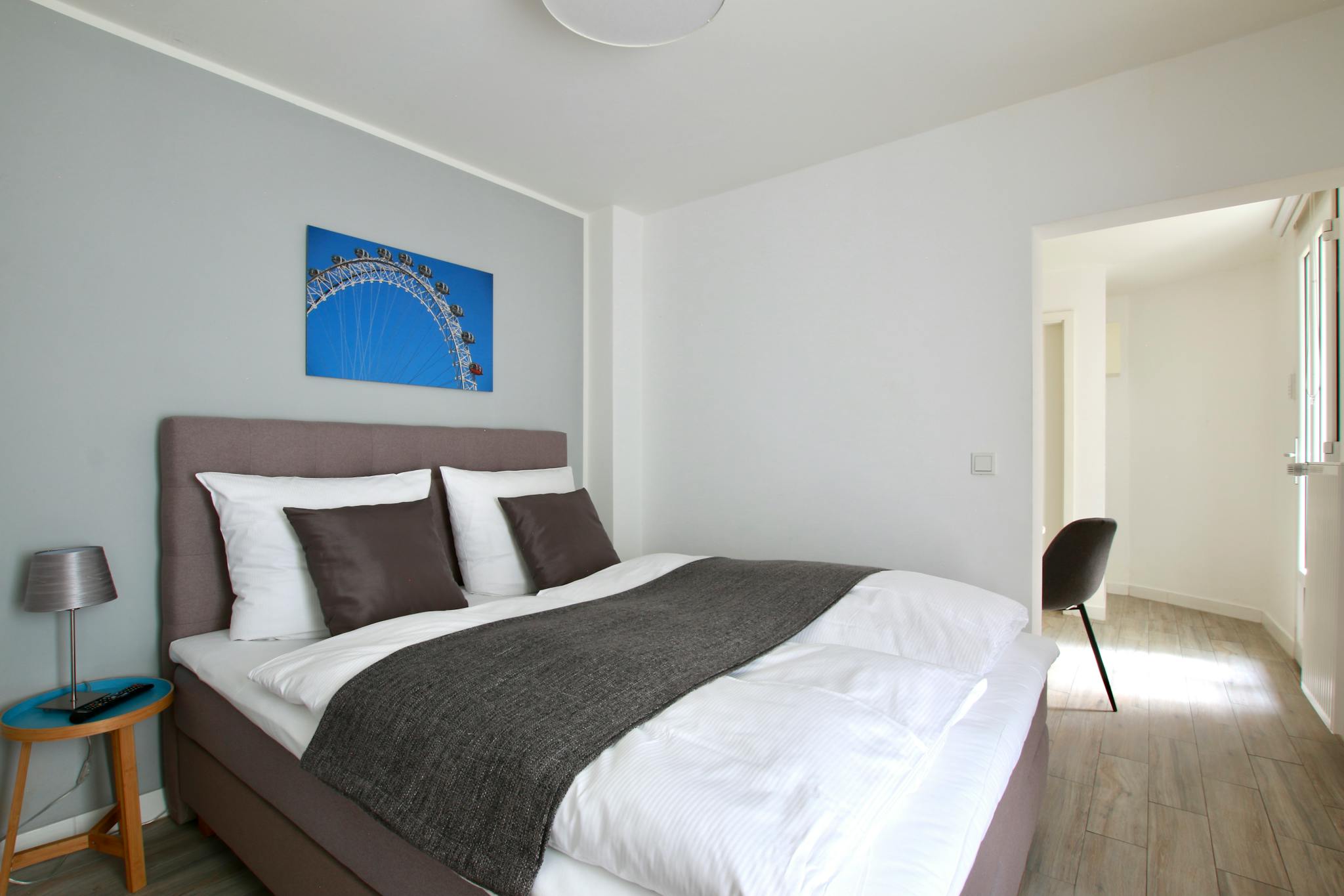 The apartment building is located in the Deutz district on the right bank of the Rhine, very close to the exhibition center, making it particularly suitable for trade fair visitors. Shops for everyday needs and a small selection of cafés and restaurants can be found around Deutzer Freiheit street. The Rhine riverbank with Deutzer Werft, Kennedy-Ufer, Rheinpark, and Poller Wiesen offers local recreation in green surroundings. The Messe/Deutz long-distance train station is only a few minutes' walk from the apartment building and offers both long-distance connections to destinations in Germany and abroad as well as many regional connections. In addition, the station is served by several underground and tram lines (1, 3, 4, 9, 14), which guarantee excellent connections to all destinations within Cologne. The walkway on the Hohenzollern Bridge, which offers fantastic panoramic views of the old town and the banks of the Rhine, lead to the city center and the cathedral on the river’s left bank.