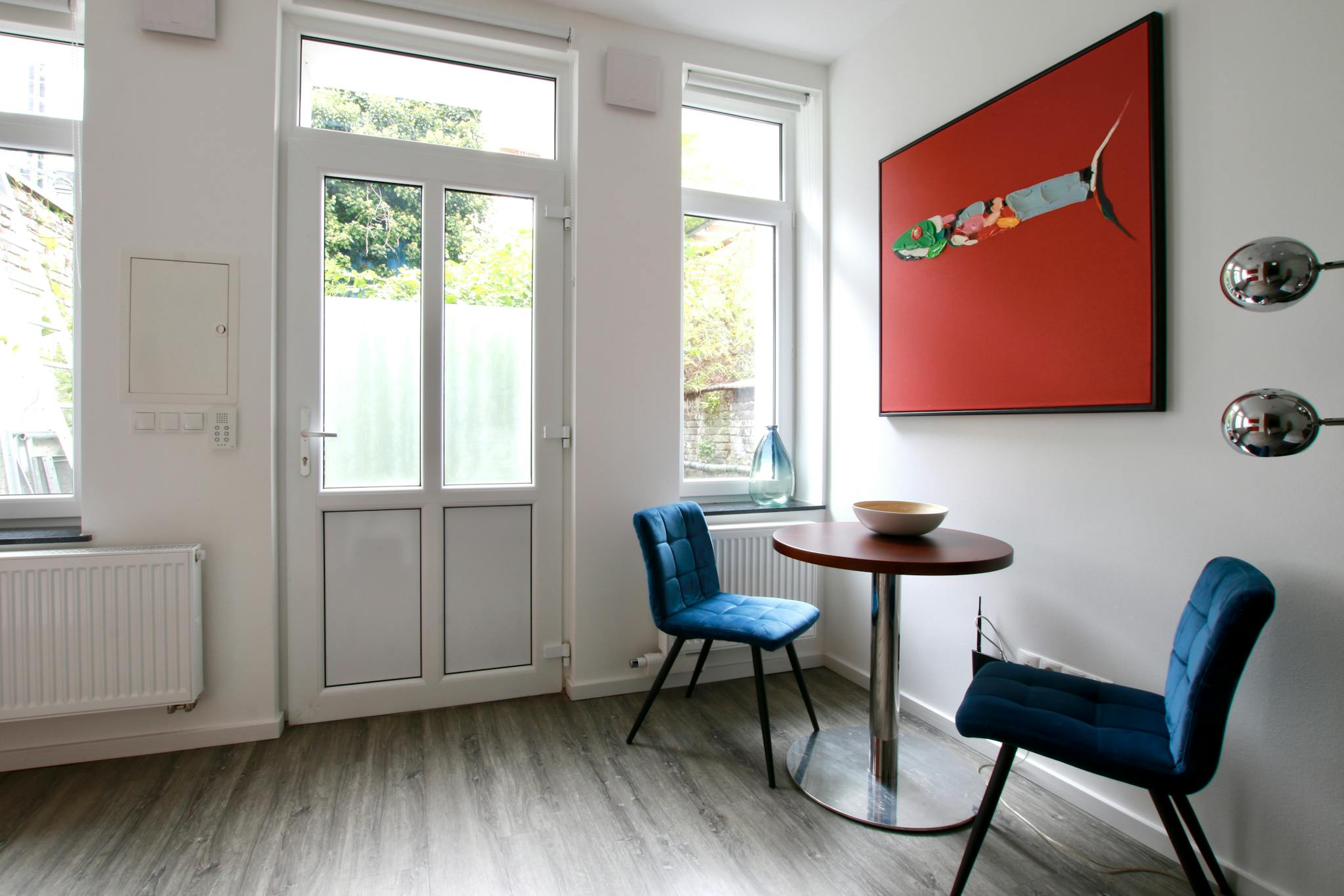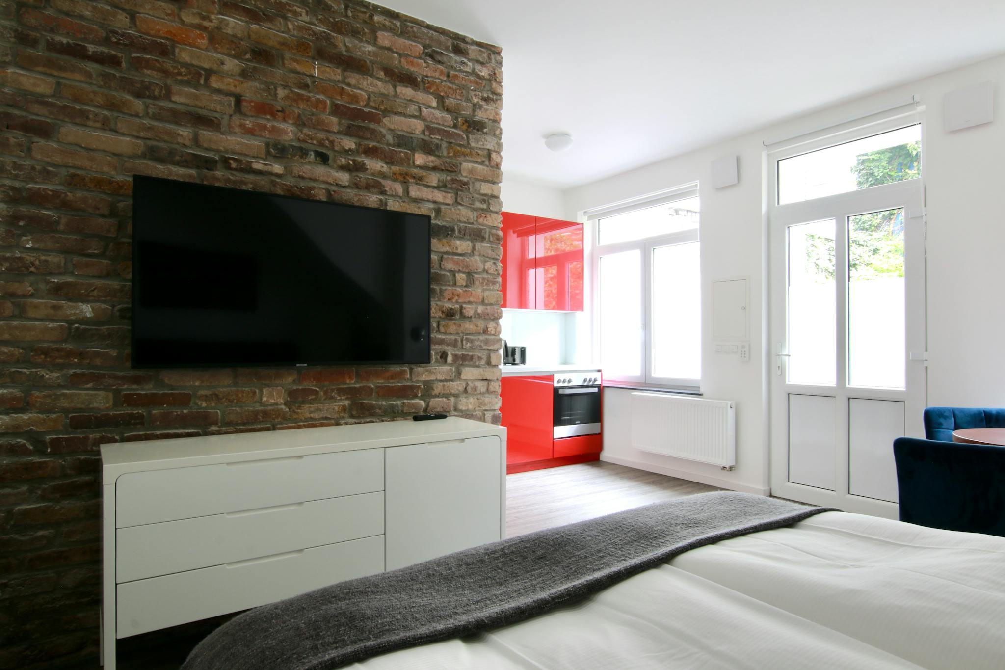 25qm großes, ebenerdiges Studio-Apartment in ruhigem, begrüntem Hinterhof eines 3-stöckigen Apartmenthauses in einer Seitenstraße im Stadtteil Deutz. Der offene Wohnraum mit Laminatboden verfügt über Boxspringbett (140cm breit), Bügeleisen & Bügelbrett, TV, Esstisch und voll ausgestattete Küche mit Kühlschrank, Kochfeld, Backofen, Wasserkocher, Toaster und Kaffeemaschine. Das moderne Badezimmer hat Dusche und Föhn.