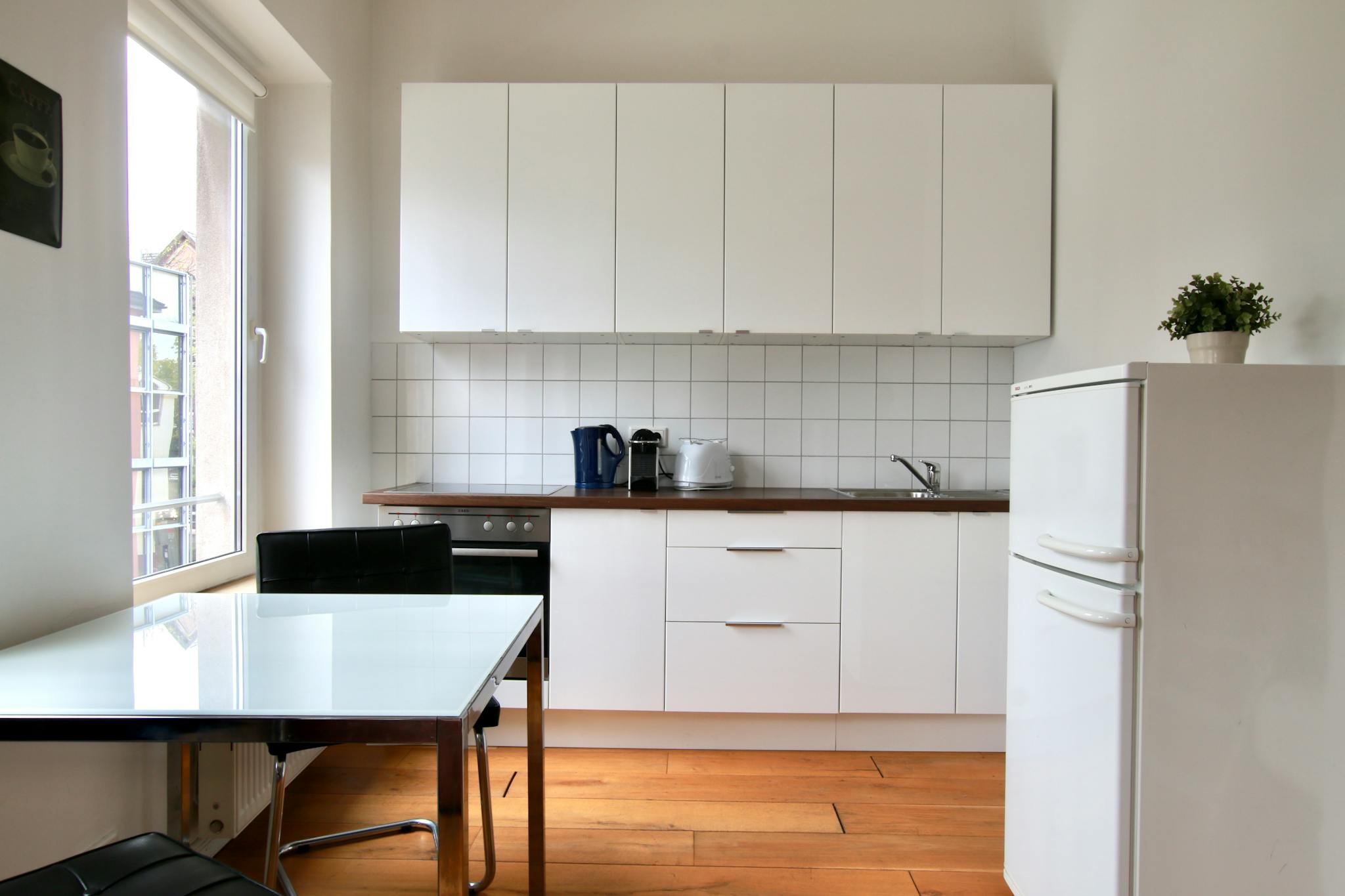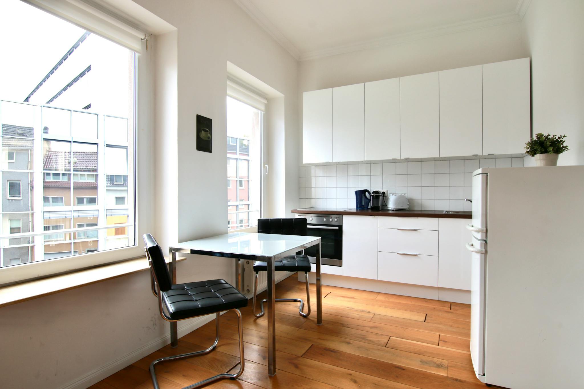 40qm großes Apartment im 2. OG eines 3-stöckigen Apartmenthauses in einer ruhigen Seitenstraße im Stadtteil Deutz. Das Schlafzimmer verfügt über Boxspringbett (180cm breit), Schrank, Bügeleisen & Bügelbrett, Sessel und Arbeitsplatz. Die separate Wohnküche kommt daher mit einer gemütlichen Sofaecke (Schlafsofa) mit TV, Esstisch und einer voll ausgestatteten Küche mit Kühlschrank, Kochfeld, Backofen, Wasserkocher, Toaster und Kaffeemaschine. Das moderne Badezimmer verfügt über Dusche und Föhn.