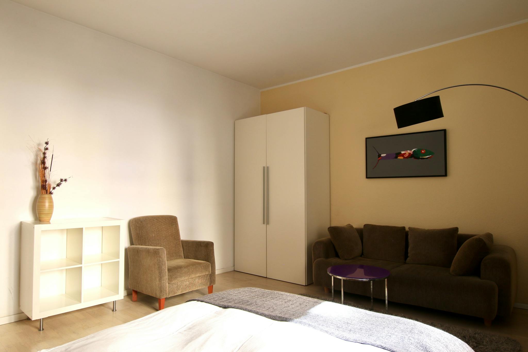 38 sqm apartment with balcony on the 3rd floor in the rear building of a 6-story apartment building opposite the beautiful Rathenauplatz in Cologne's lively student district. Open-plan living space with laminate flooring features a box spring bed (180 cm width), wardrobe, iron & ironing board, sofa, armchair, and TV. The separate, fully equipped kitchen with dining table has a refrigerator, stove, microwave, kettle, and coffee maker. The bathroom comes with a shower and hairdryer.