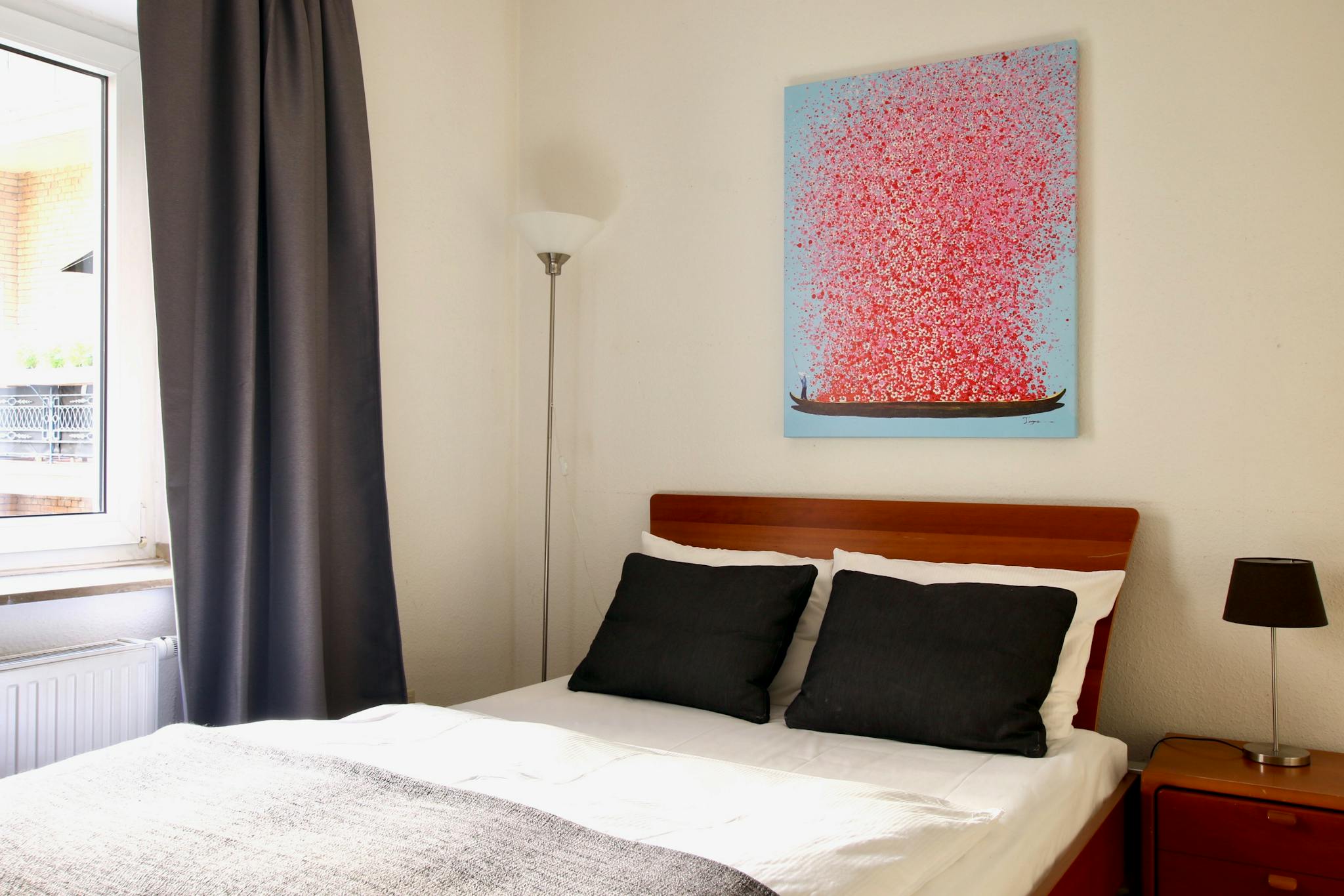 The apartment is located right next to the beautiful Rathenauplatz square and belongs to the Neustadt-Süd district. Named after the Latin Quarter in Paris due to its proximity to the University of Cologne, Kwartier Latäng is characterized by its liveliness and its multitude of restaurants, bars, and pubs. Shops for everyday needs are also located in the immediate vicinity. The green Rathenauplatz square on the other side of the street with its old trees invites you to linger; the green belt with its extensive green spaces is also just a few minutes' walk away. The apartment building is a 15-minute walk from Cologne's famous shopping streets around Neumarkt and about a 25-minute walk from the cathedral. The nearest stop is Zülpicher Platz, from where trams (lines 9, 12, 15) run to all important destinations in Cologne. The Cologne South regional train station is also less than a 5-minute walk away, with regional connections to Bonn/Koblenz, Düsseldorf, Eifel, etc.