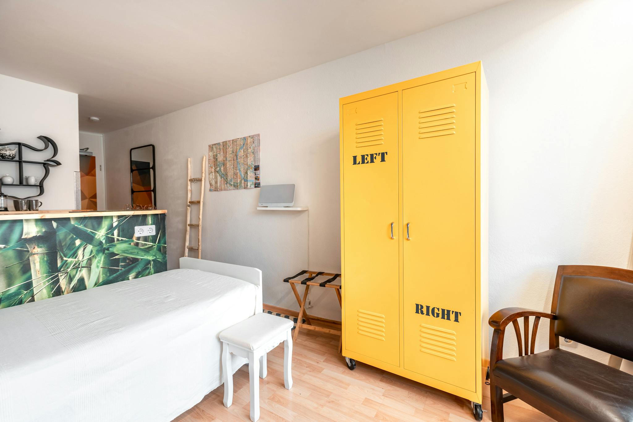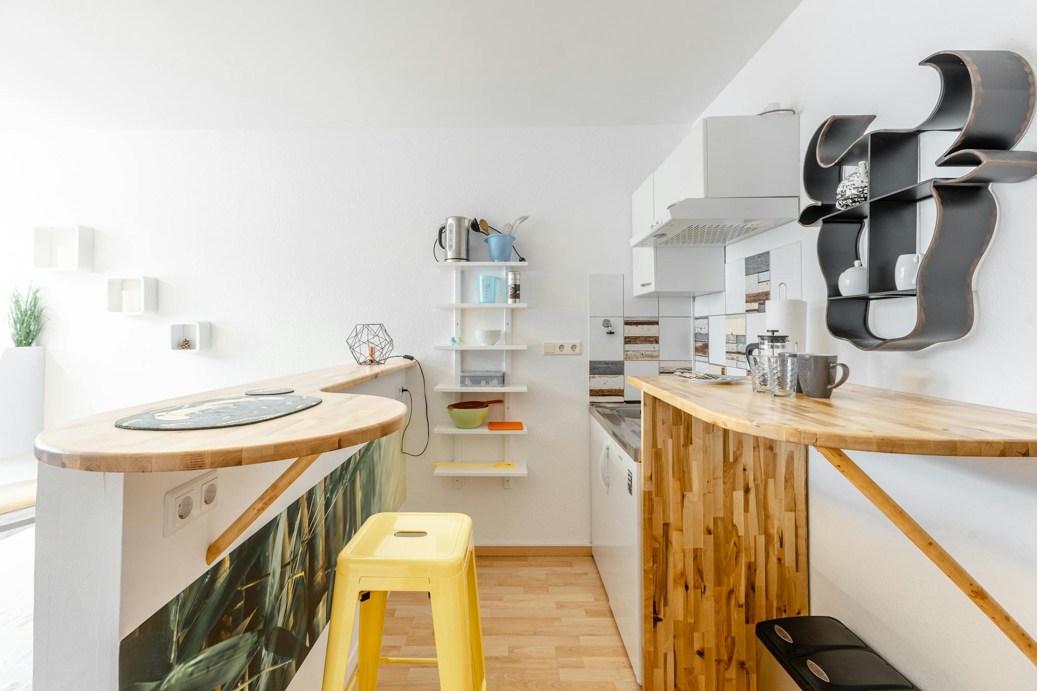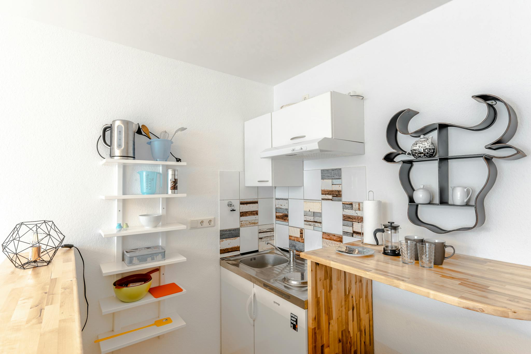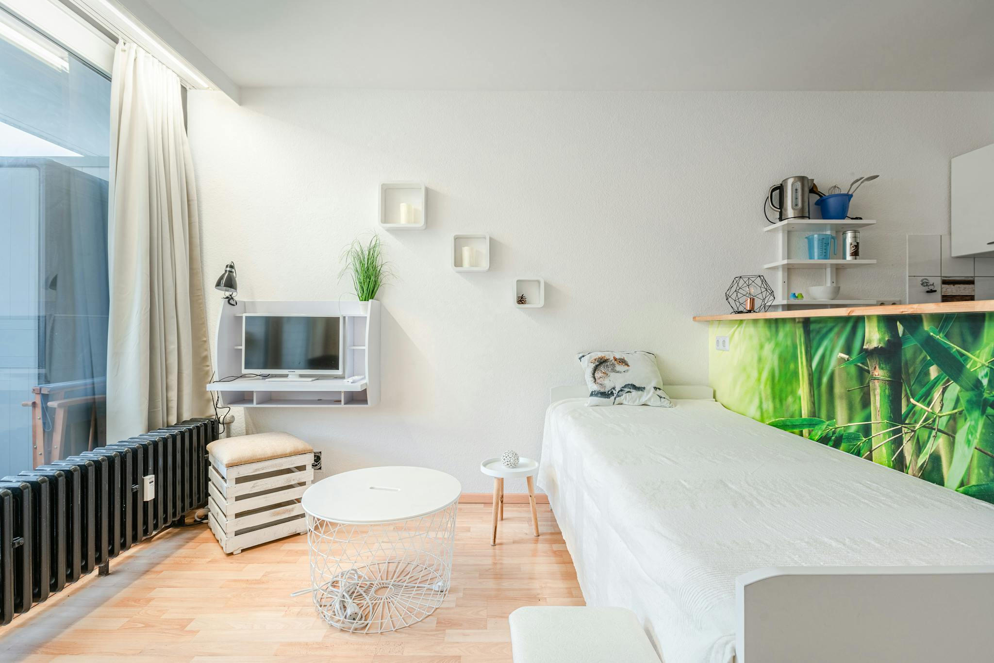Das 1 Zimmer Appartement hat eigentlich alles was man braucht. Die Küche hat einen Tresen an dem man seinen Cafe geniessen kann. Bei schönem Wetter kann man es sich auf dem Balkon gemütlich machen. Im Keller gibt es eine Gemeinschafts-Waschmaschine, die genutzt werden kann.