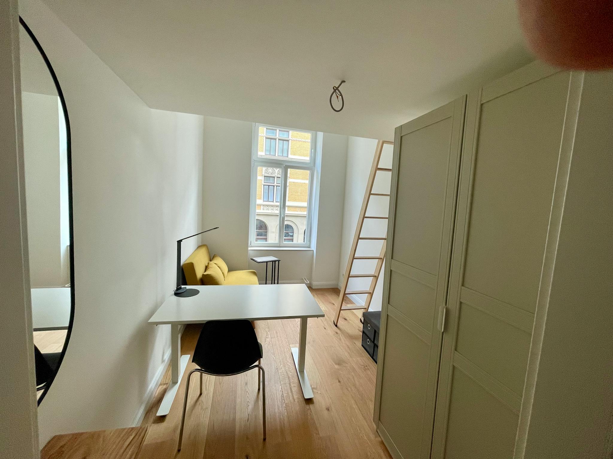 The room is fully furnished in a trendy industrial design with a bed, armchair, dining area consisting of a table with chairs, desk, closet, refrigerator, kitchenette with stove, oven, appropriate dishes and cooking utensils for preparing meals