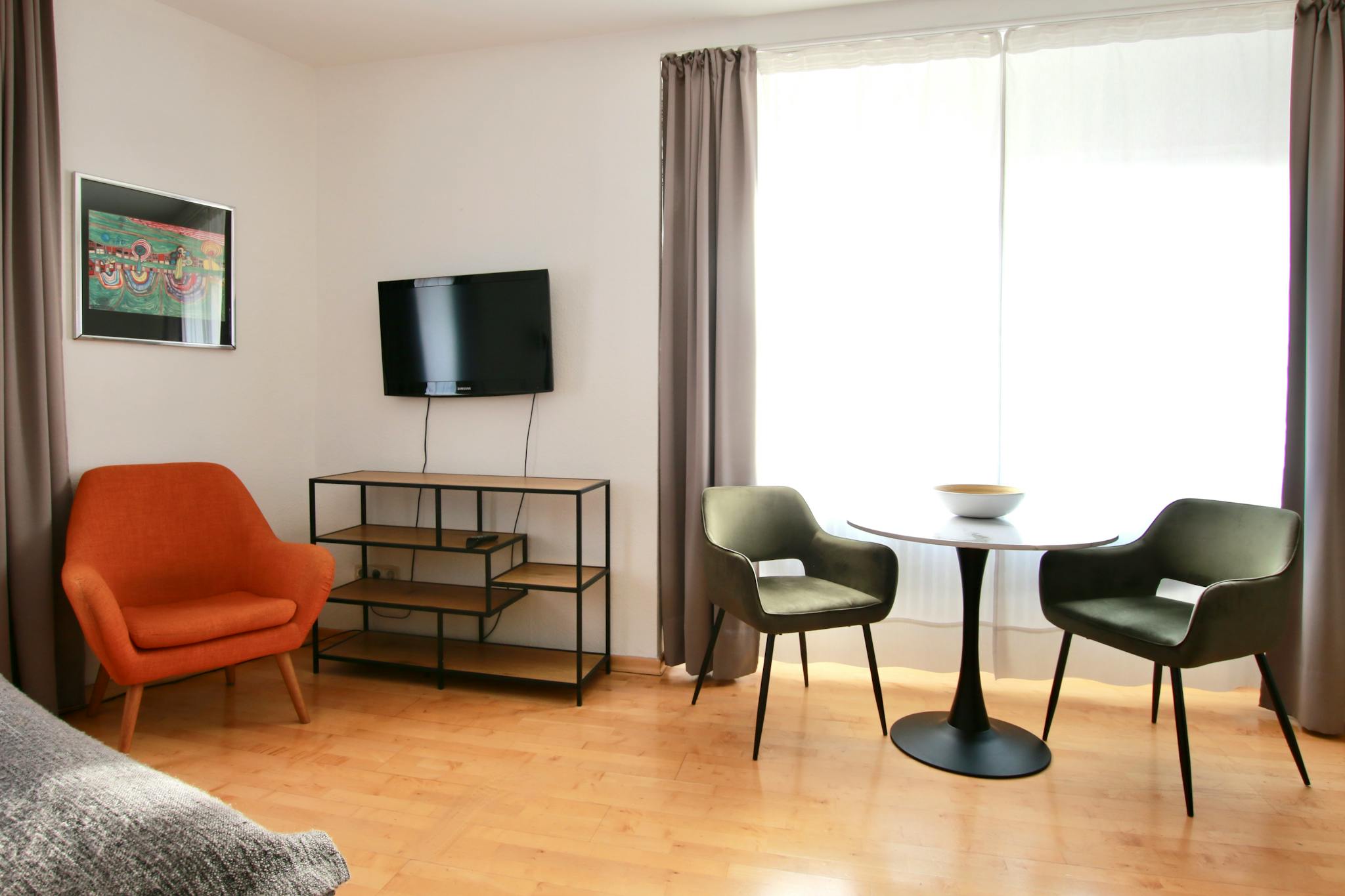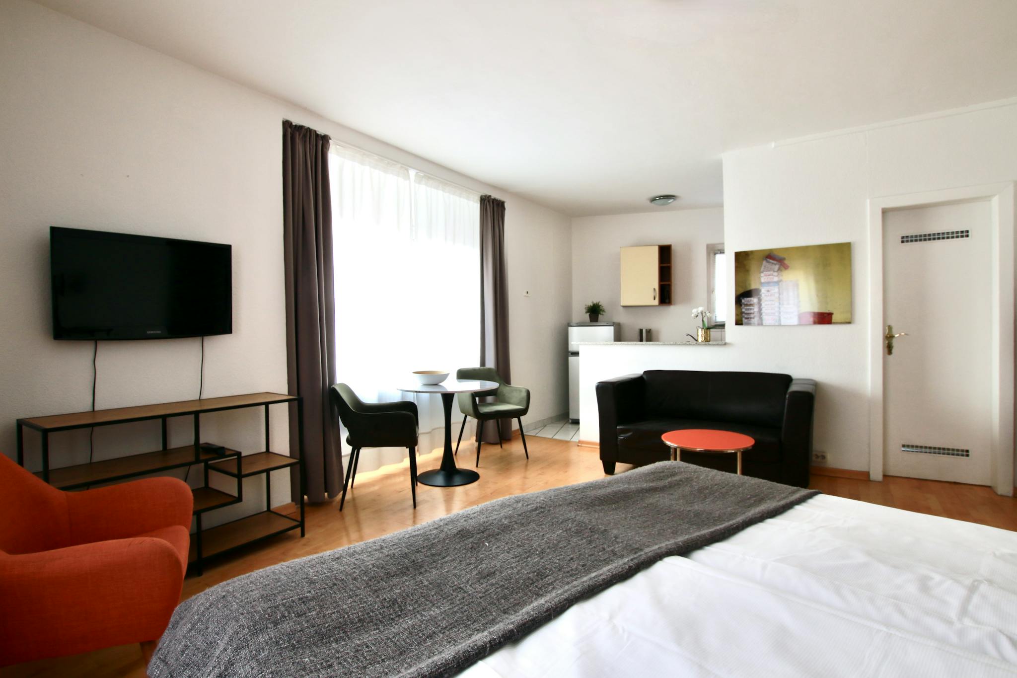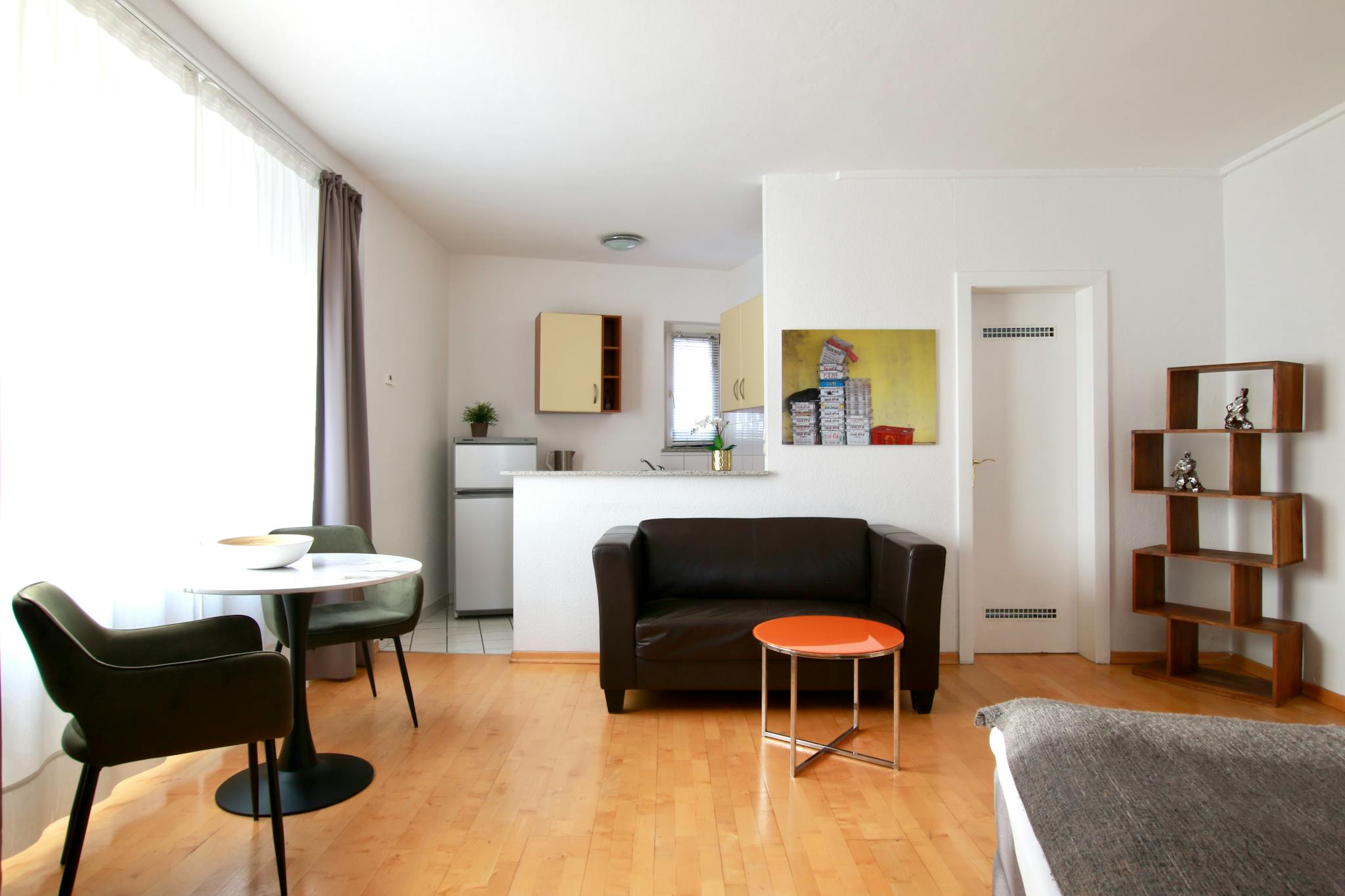 36qm großes Studio-Apartment (für 1-2 Personen) im 2. Stock eines 6-stöckigen Apartmenthauses an einer Straßenkreuzung im quirligen Belgischen Viertel. Der offene Wohnraum mit Laminatboden verfügt über ein Boxspringbett (180cm breit), Kleiderschrank, Bügelbrett & Bügeleisen, Sofa, Sessel, TV, ein kleines Duschbad mit Föhn, sowie eine voll ausgestattete Küche mit Kühlschrank, Cerankochfeld, Wasserkocher, Kaffeemaschine und Mikrowelle.