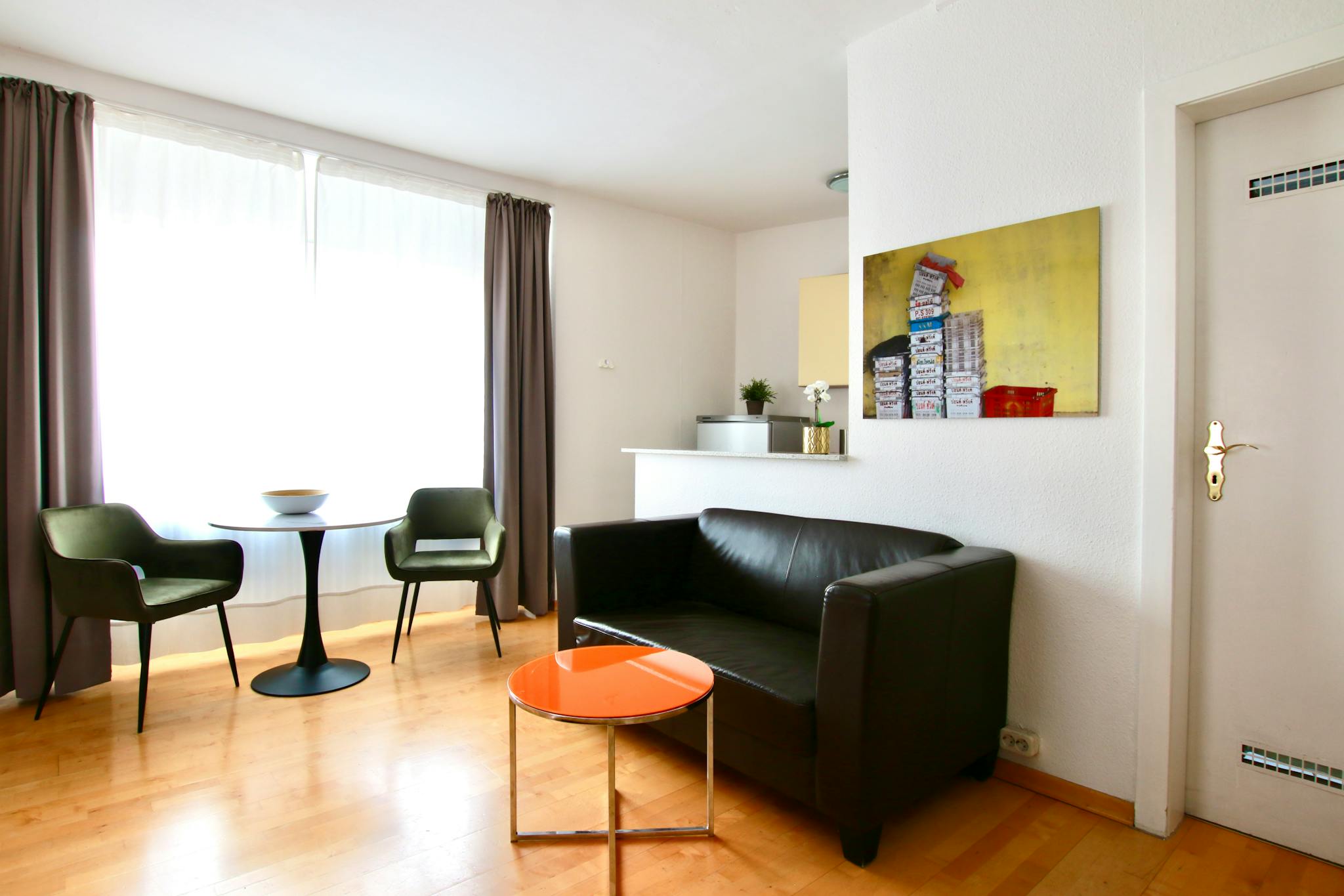 36 sqm studio apartment (for 1-2 persons) on the 2nd floor of a 6-story apartment building at a street corner in the vibrant Belgian Quarter. The open-plan living room with laminate flooring features a box-spring bed (180 cm width), wardrobe, ironing board & iron, sofa, armchair, TV, a small bathroom with shower & hairdryer, and a fully equipped kitchen with refrigerator, ceramic hob, kettle, coffee machine, toaster, and microwave. Free Wi-Fi is available.