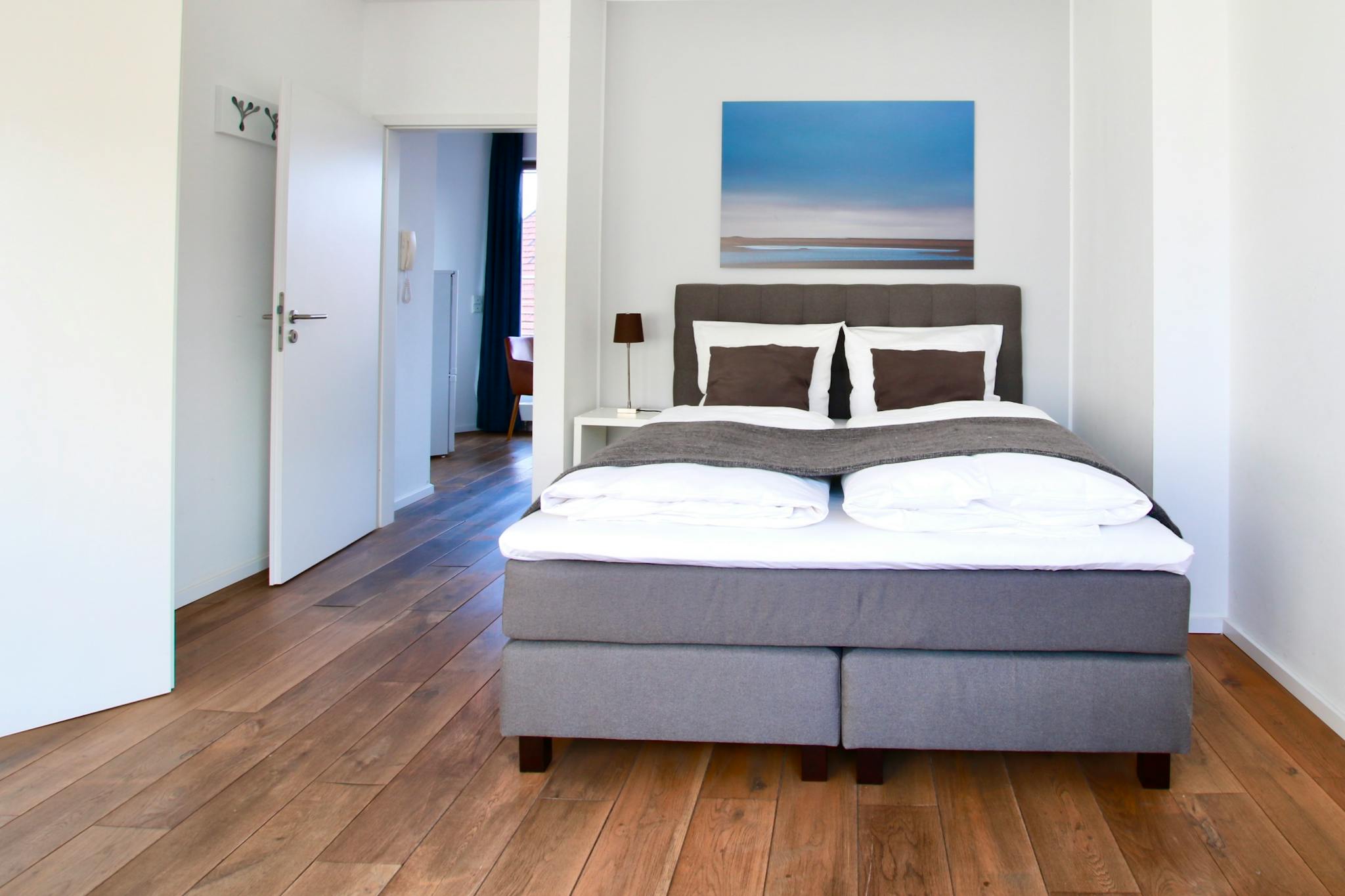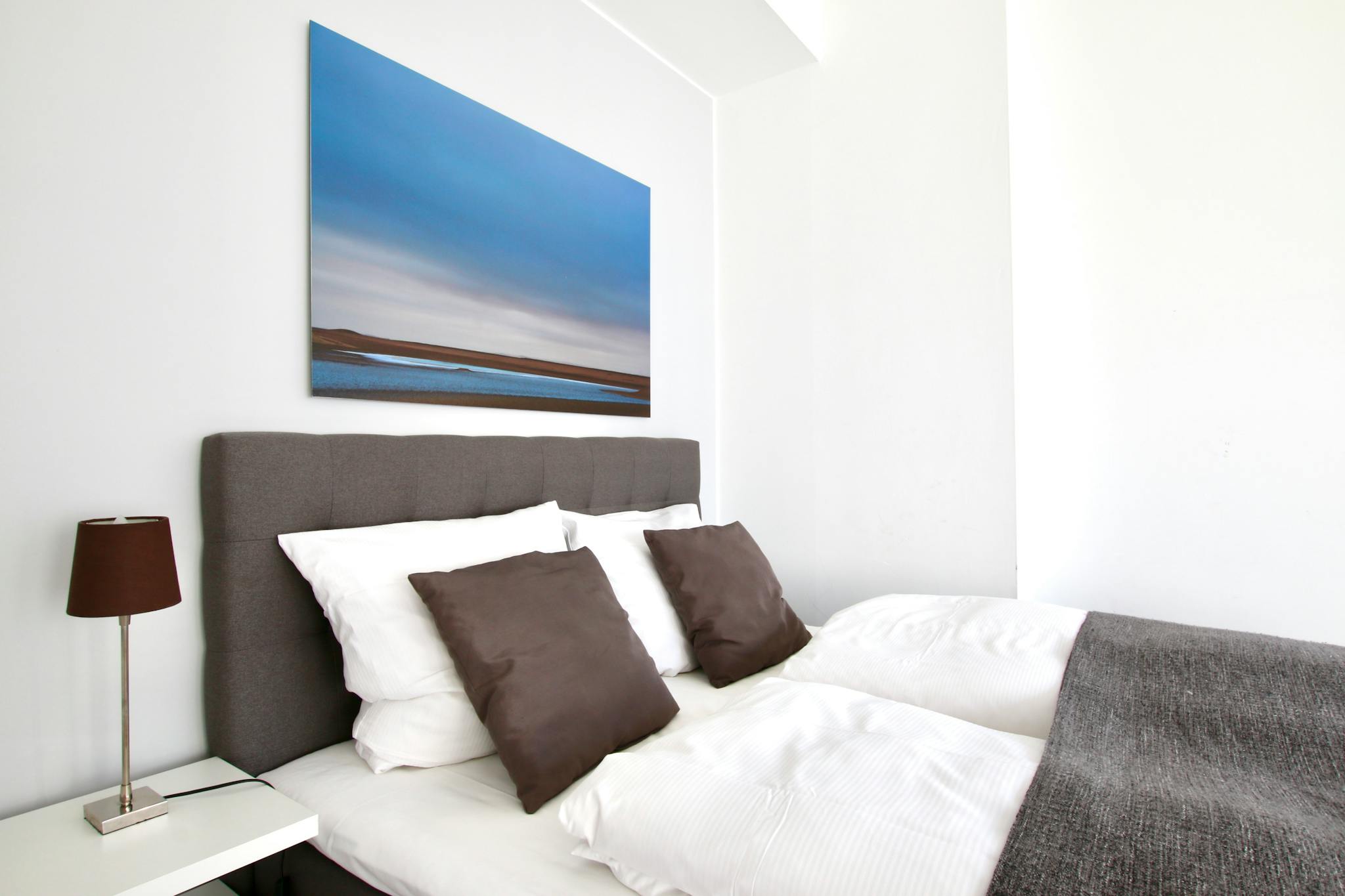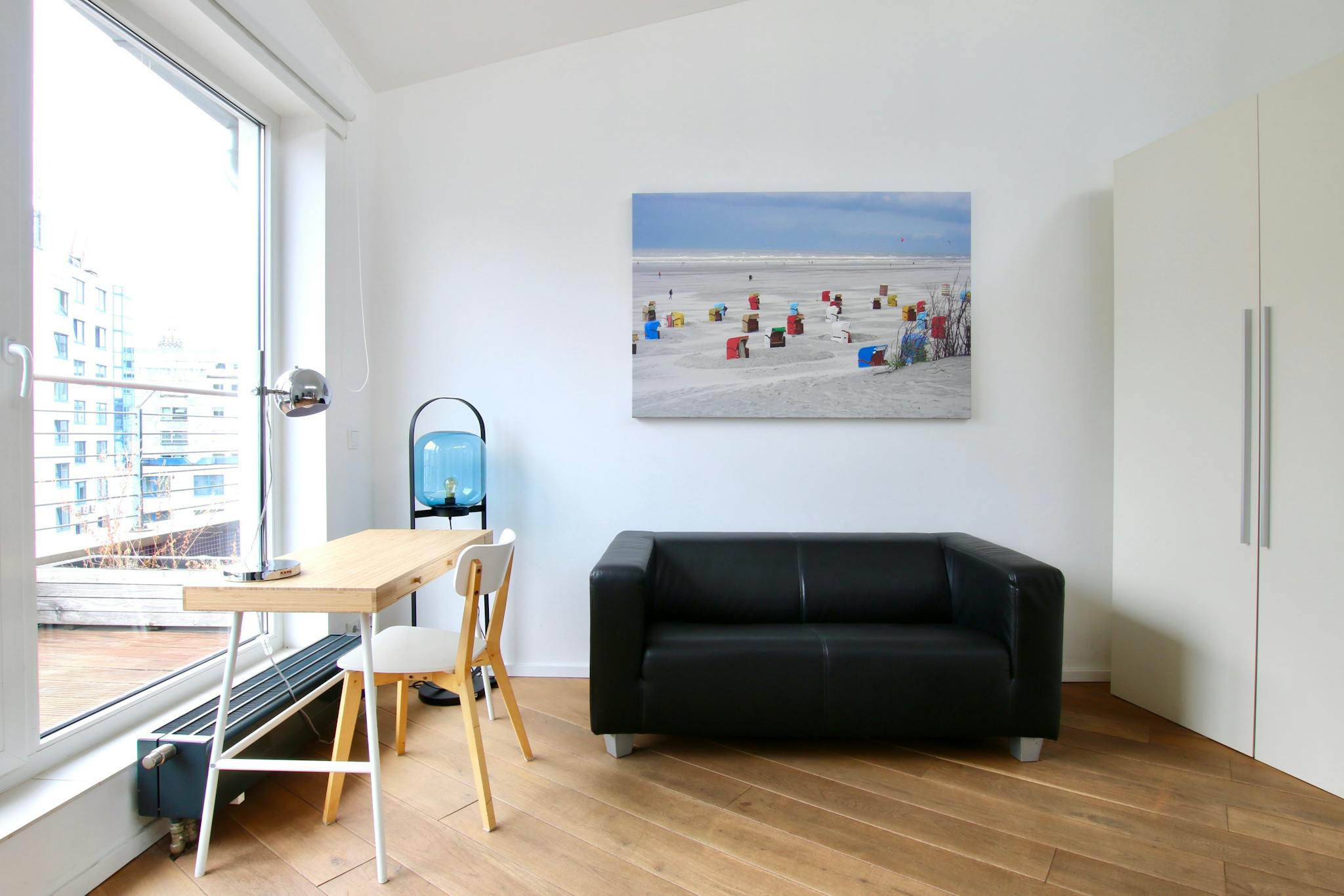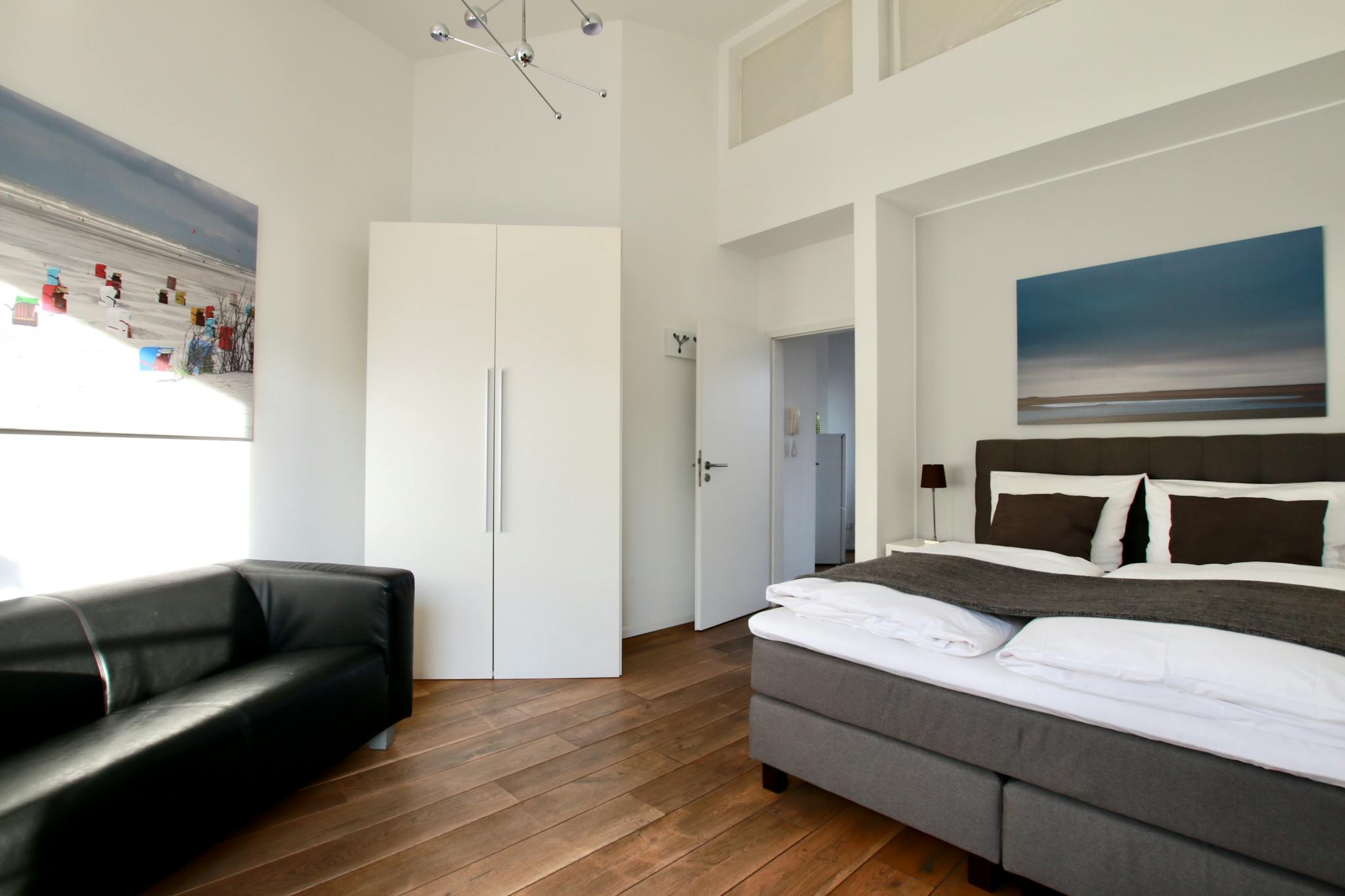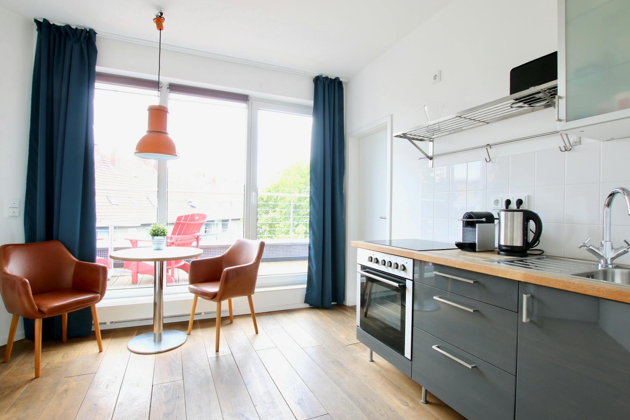 45qm großes, lichtdurchflutetes Penthouse-Apartment mit Holzböden im 4. OG eines 4-stöckigen Apartmenthauses und zwei großen Terrassen. Großer Wohn-/Schlafraum mit Boxspringbett (160cm breit), Schrank, Bügeleisen & Bügelbrett, Sofa, TV, Arbeitsplatz. Separate, voll ausgestattete Küche mit Kühlschrank, Cerankochfeld, Backofen, Wasserkocher, Kaffeemaschine und Toaster. Tageslichtbad mit Dusche und Föhn. Kostenloses Wlan ist verfügbar.