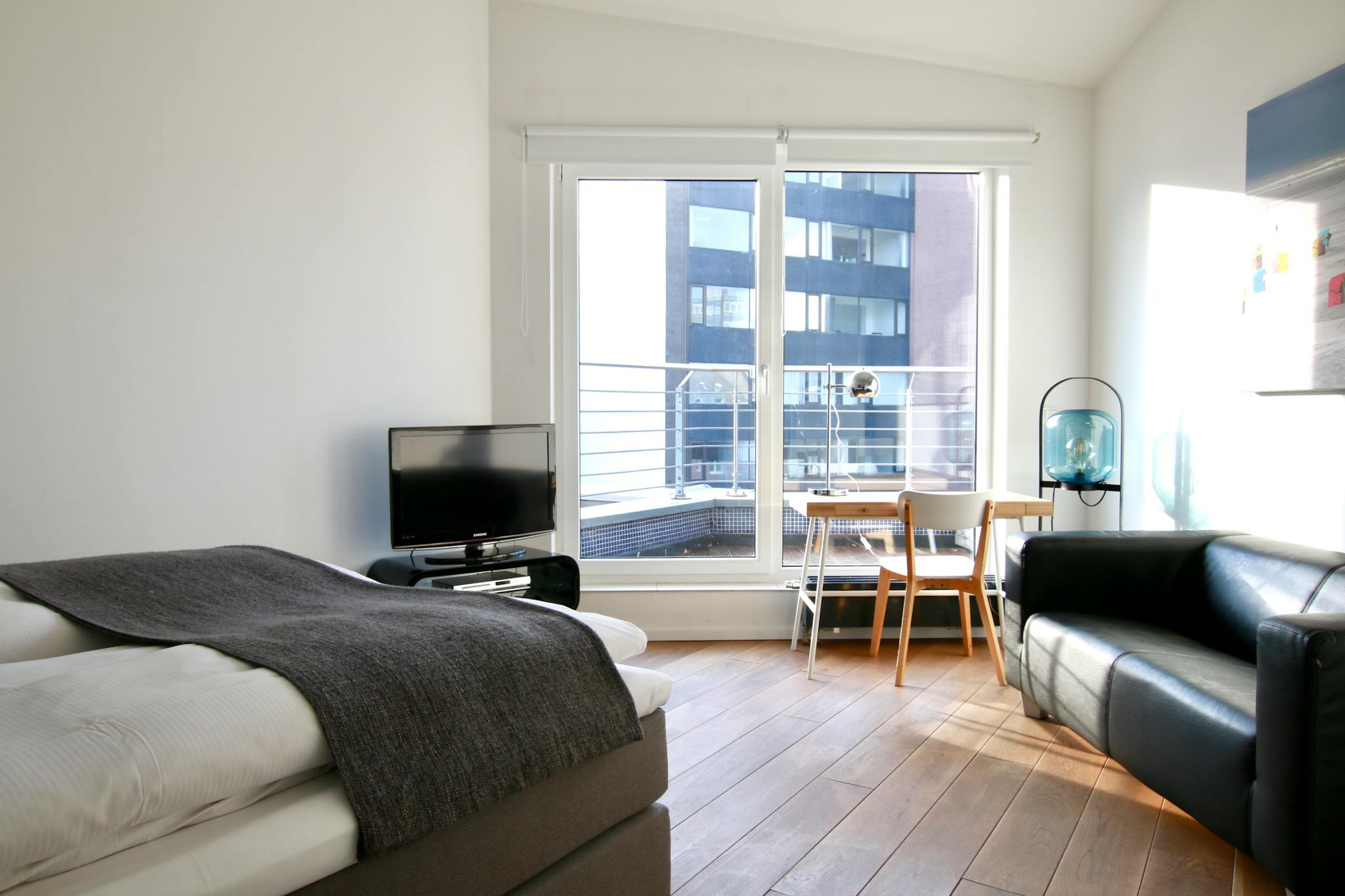 45 sqm, light-filled penthouse apartment with two large terraces & wooden flooring on the 4th floor of a 4-story apartment building.. Large living space with box spring bed (160 cm wide), wardrobe, iron & ironing board, sofa, TV, workspace. Separate, fully equipped kitchen with refrigerator, ceramic hob, oven, kettle, coffee machine, and toaster. Daylight bathroom with shower and hairdryer.