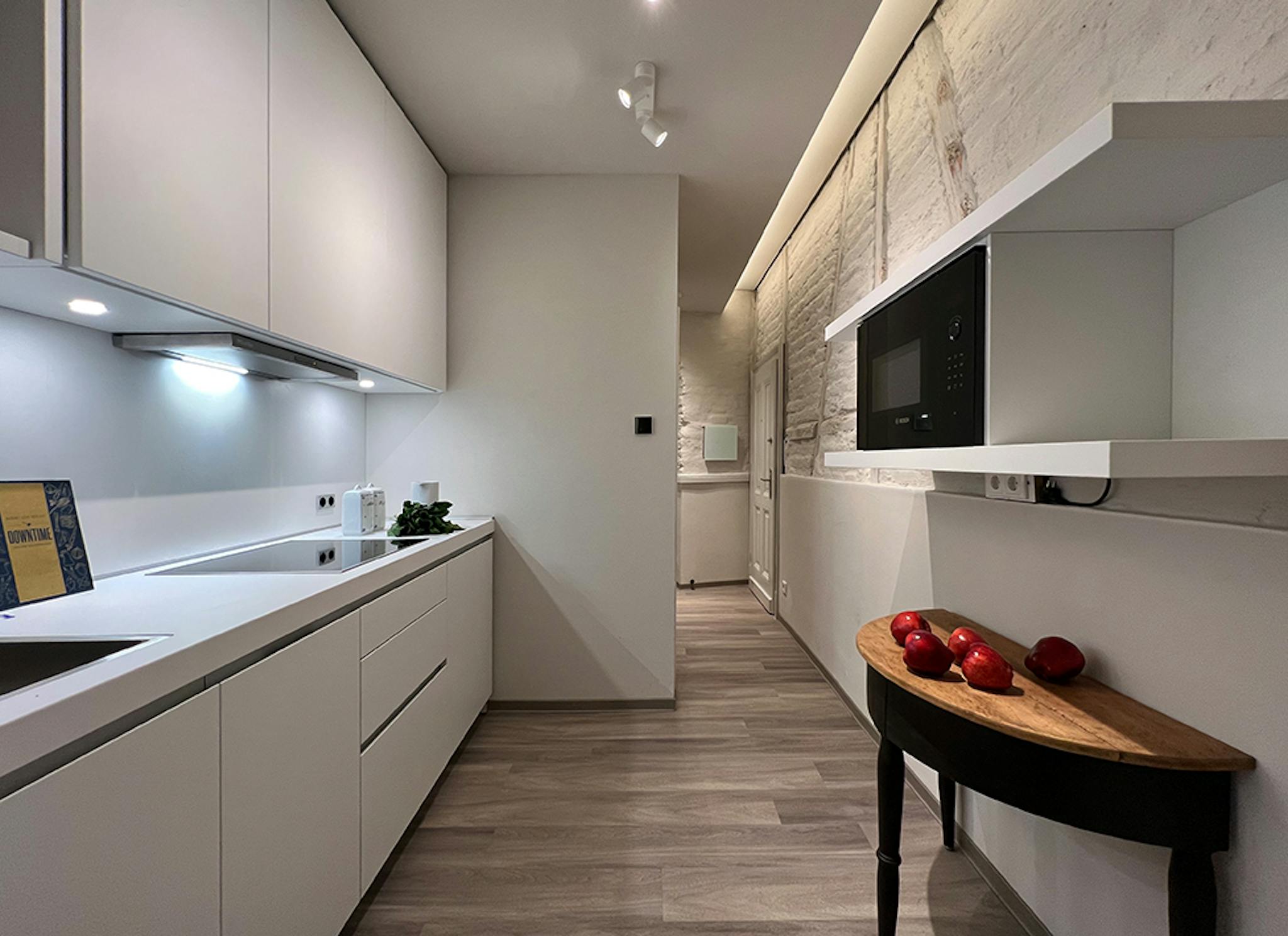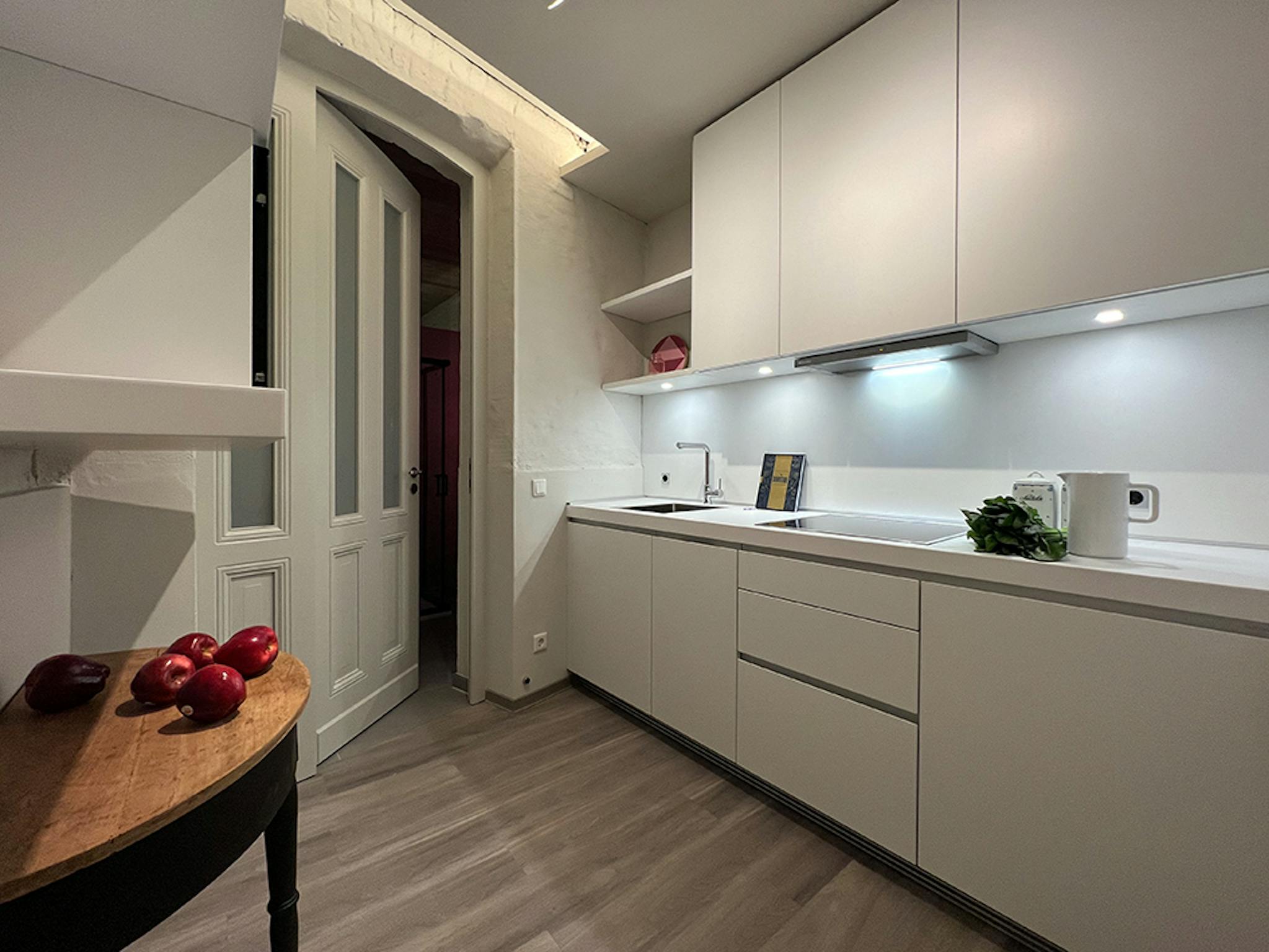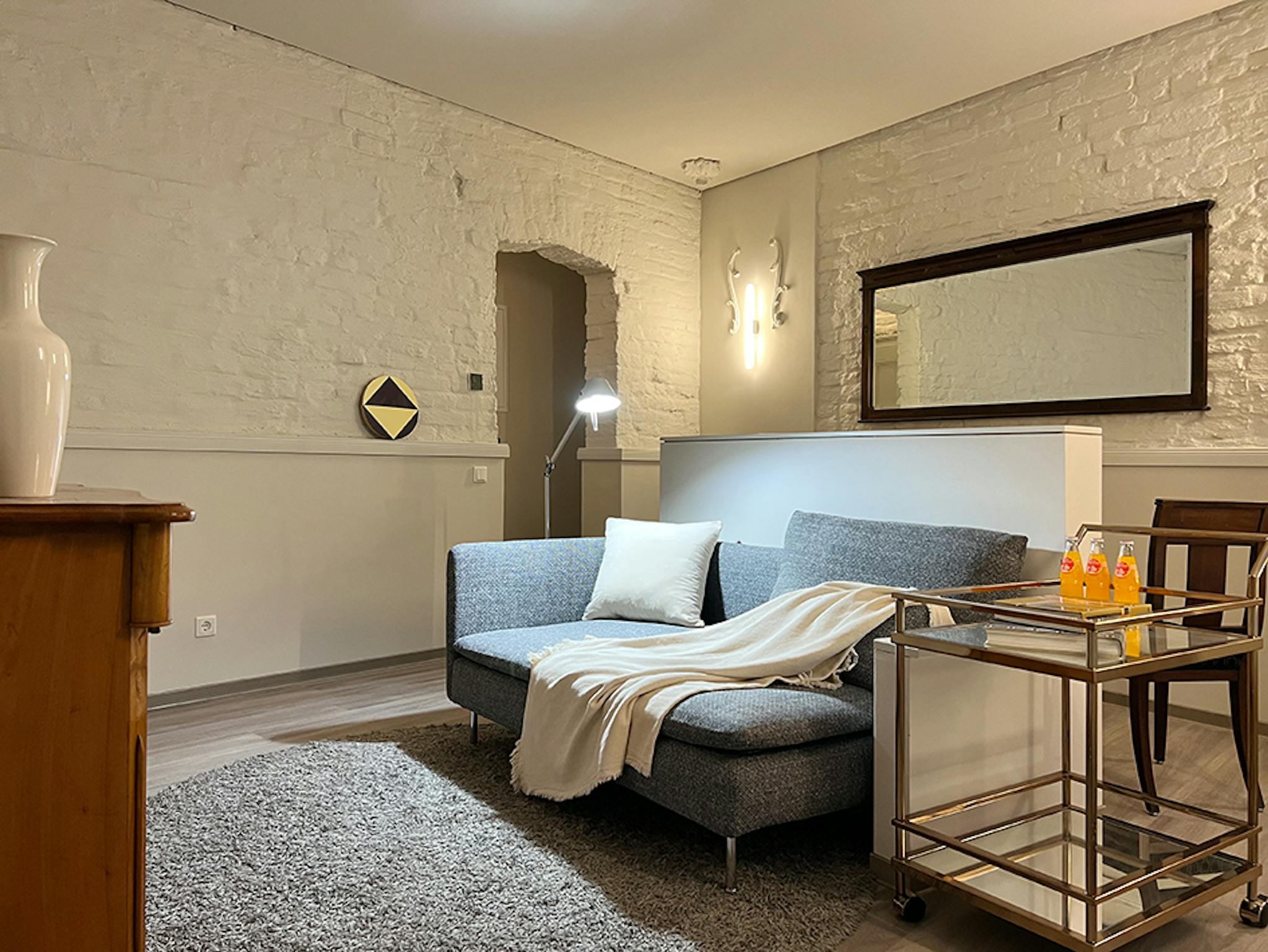 In the entrance area of the suite, the view falls to the left through the passageway to the back of the house, past the built-in bulthaup fitted kitchen into the bedroom with en suite bathroom. Here, indirect lighting lends the space an atmospheric ambience, emphasizing the 19th century-high ceilings. Both the 19th-century-timber frames with brick infill and the restored brick walls come aesthetically into their own. Behind the en suite bathroom with daylight is the sleeping area with an antique dresser and a comfortable bed. The French window at the end of this suite has a distinctive view of the back gardens and backyard charm of the neighborhood. The separate WC is located at the front of the suite next to the entrance. The furnished living area with both stucco ceiling and stucco-decorated walls faces the street. The in-house trash room is next to the discrete gateway to the supermarket in the back of the property in the courtyard.