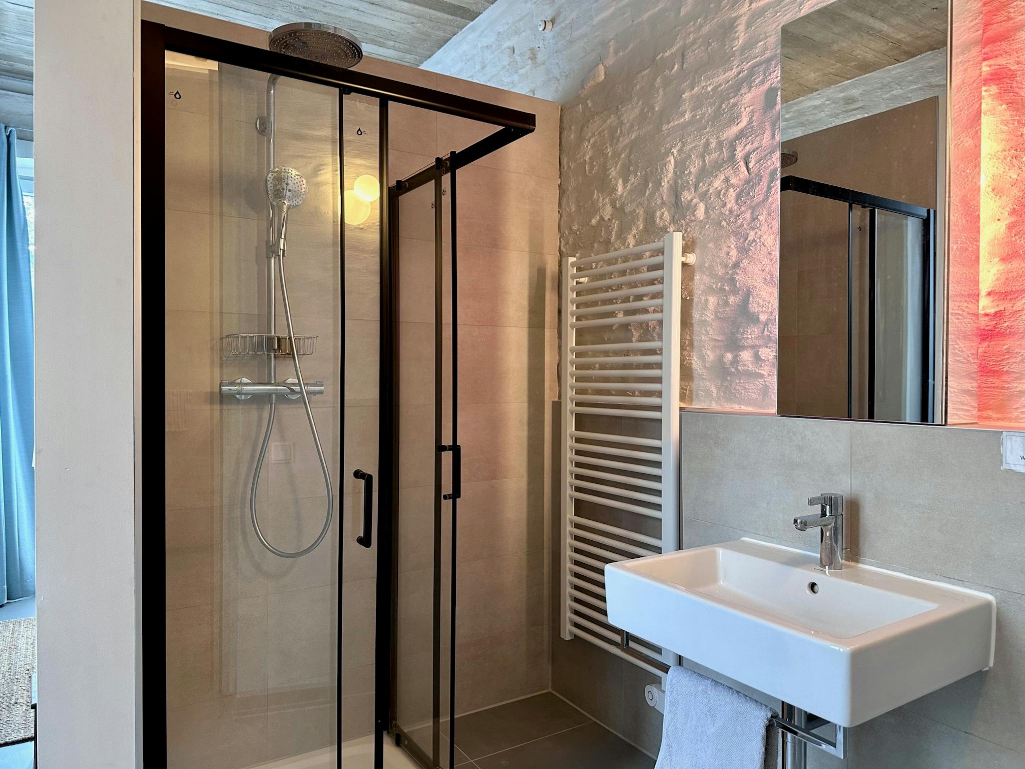 The spacious bathroom has a walk-in shower and a window providing both natural light and airing. The bathroom is equipped with a laundry basket, 2 shelves, and a mirrored wall unit.