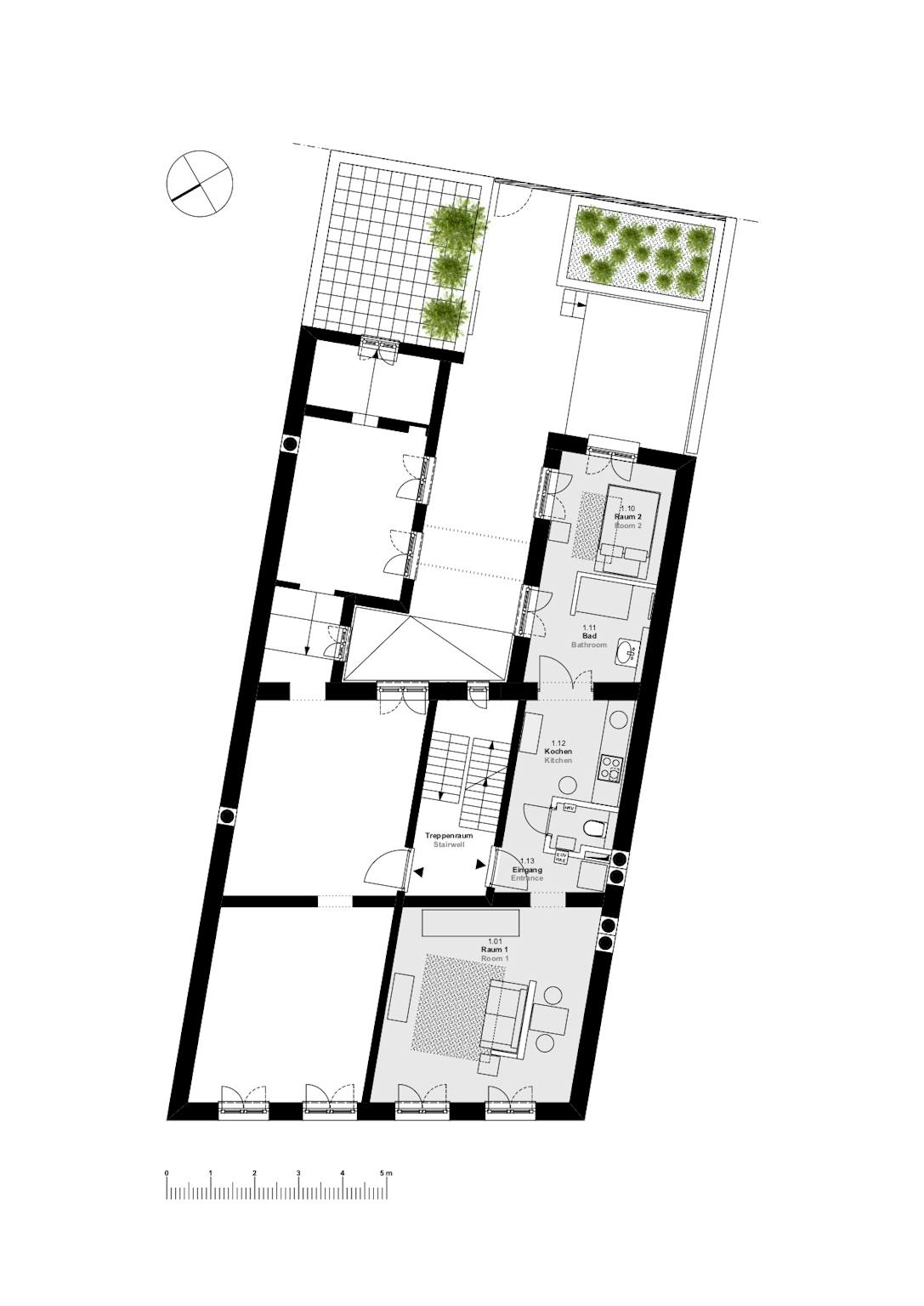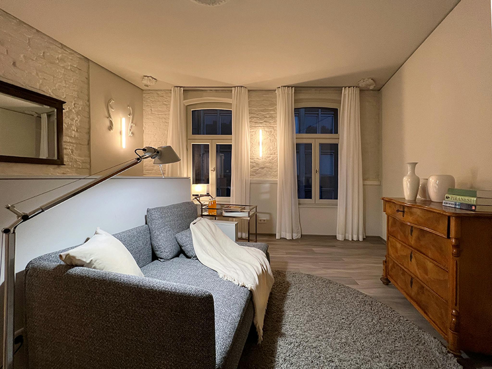 All apartments in this 19th century apartment building were thoughtfully refurbished using high quality mineral renders, filler, and paints. The materials allow an excellent moisture exchange between the wall surface and the room air. They are open pore and absolutely water vapor permeable. High ceilings, high windows with, floors with floor heating, selected textiles, exquisite furniture and lights refine the newly designed spaces with both elegance and comfort. All apartments are non-smoking apartments!