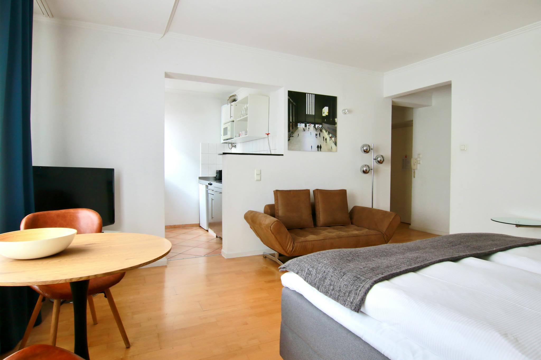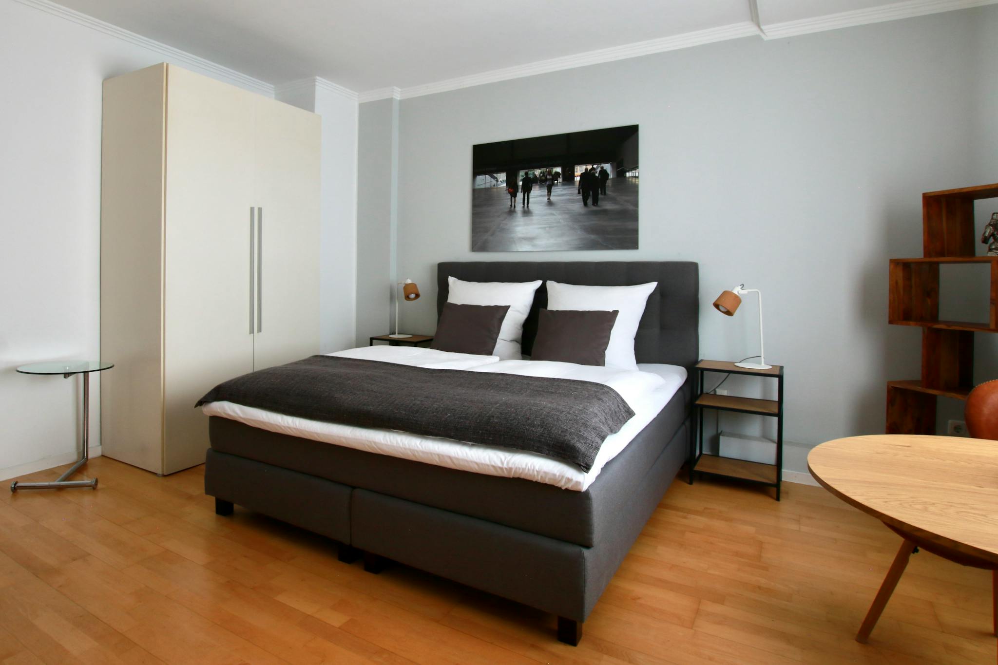 32qm großes Studio-Apartment im 1. Stock eines 6-stöckigen Apartmenthauses an einer Straßenkreuzung im quirligen Belgischen Viertel. Der Schlaf-/Wohnraum mit Laminatboden verfügt über ein Boxspringbett (180cm breit), Kleiderschrank, Bügeleisen & Bügelbrett, Sofa, TV, kleines Wannenbad mit Föhn, und voll ausgestattete Küche mit Kühlschrank, Cerankochfeld, Wasserkocher, Kaffeemaschine, Toaster und Mikrowelle.