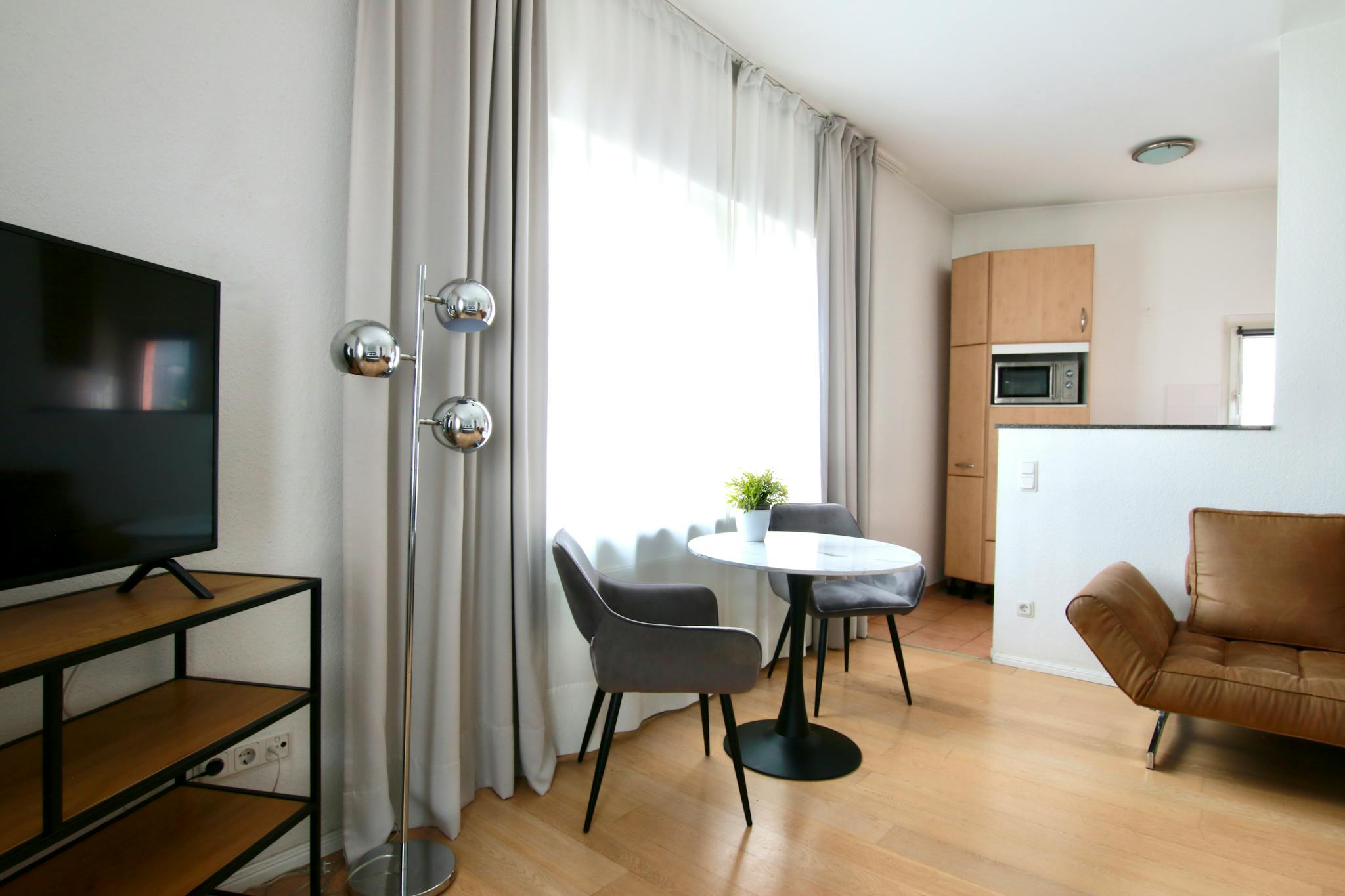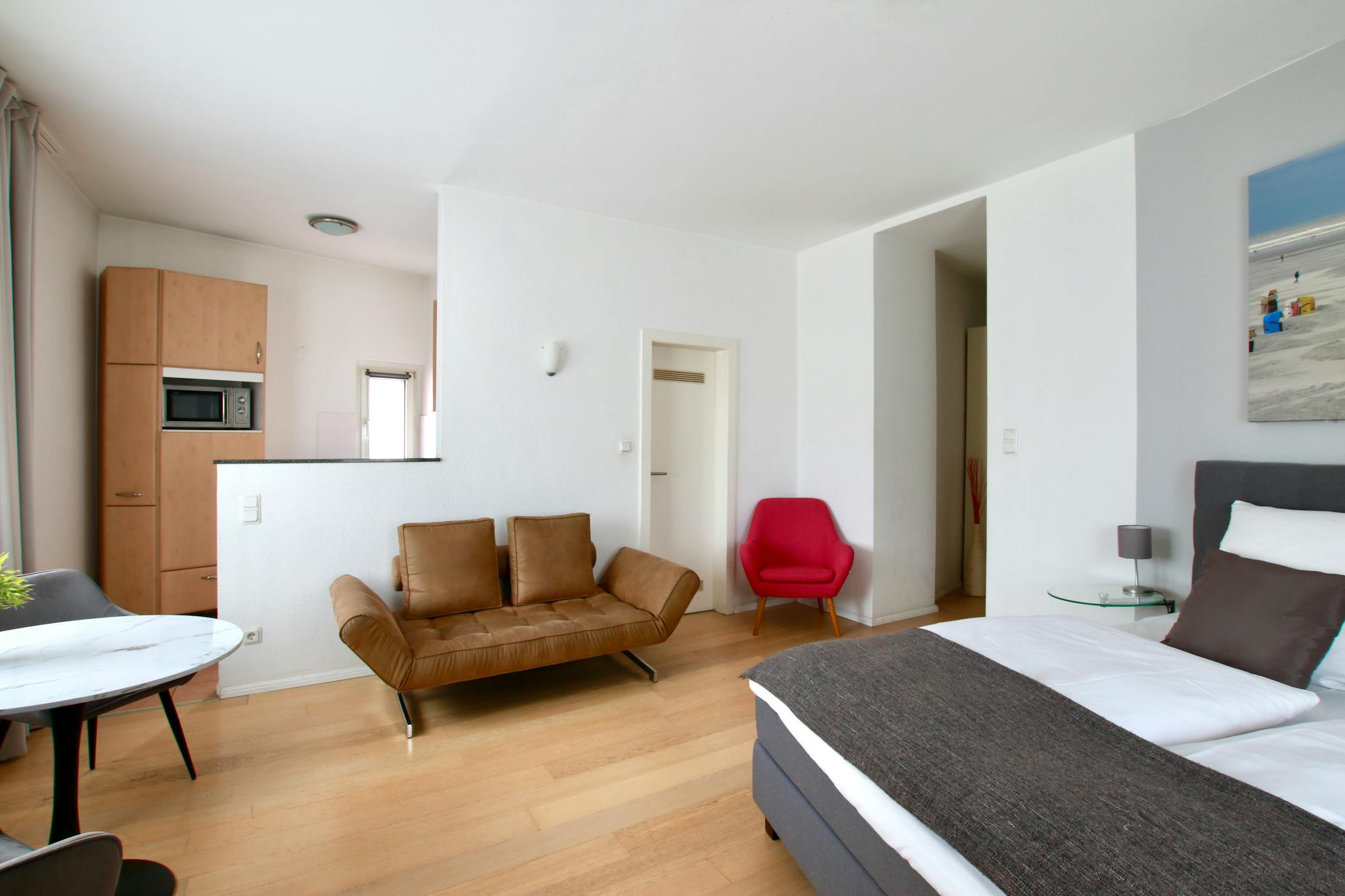 40qm großes Studio-Apartment (für 1-2 Personen) im 5. Stock eines 6-stöckigen Apartmenthauses an einer Straßenkreuzung im quirligen Belgischen Viertel. Der offene Wohnraum mit Laminatboden verfügt über ein Boxspringbett (180cm breit), Kleiderschrank, Bügelbrett & Bügeleisen, Sofa, Sessel, TV, ein Tageslichtbad mit Badewanne & Föhn, sowie eine voll ausgestattete Küche mit Kühlschrank, Spülmaschine, Cerankochfeld, Wasserkocher, Kaffeemaschine, Toaster und Mikrowelle.
