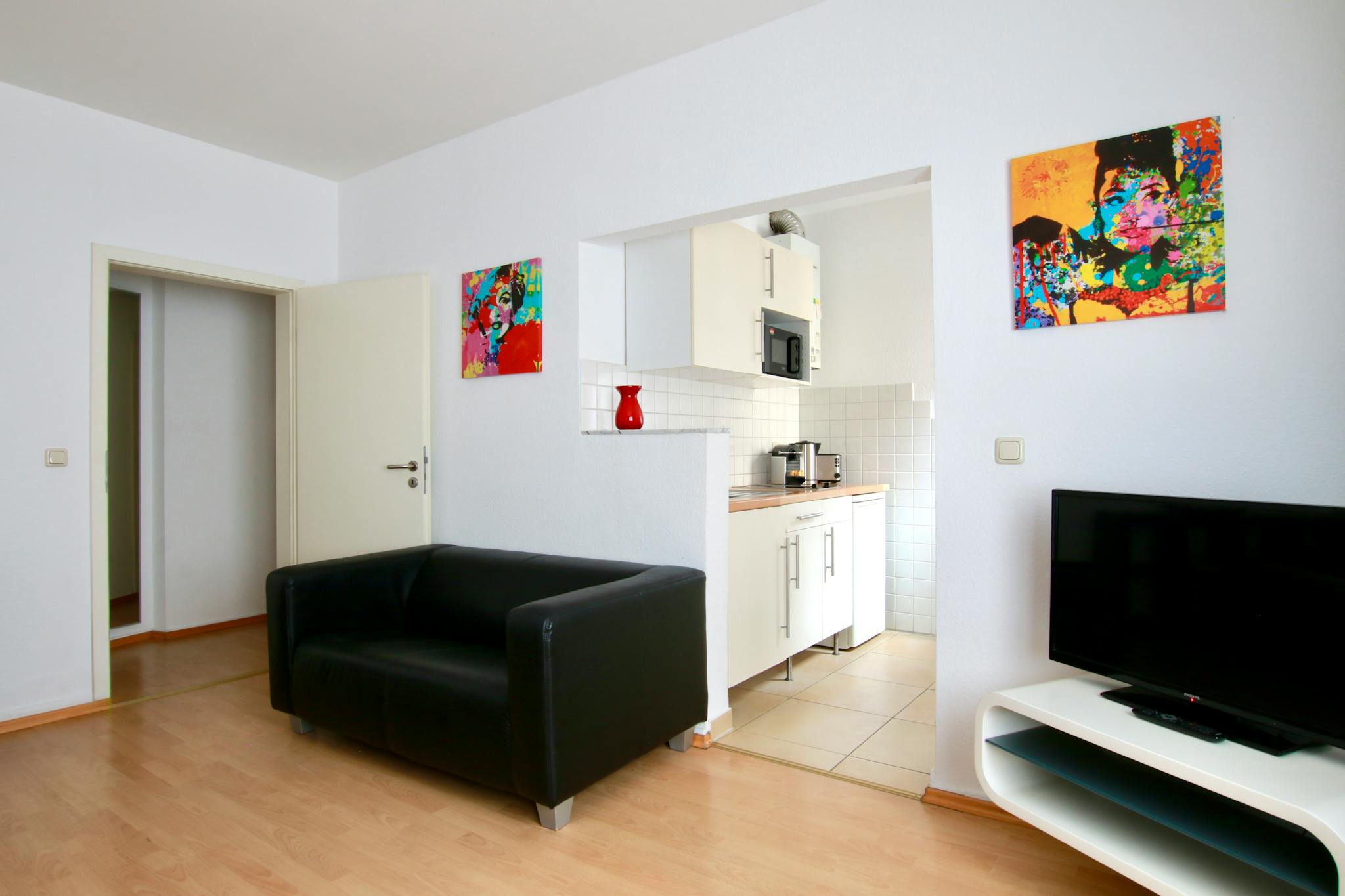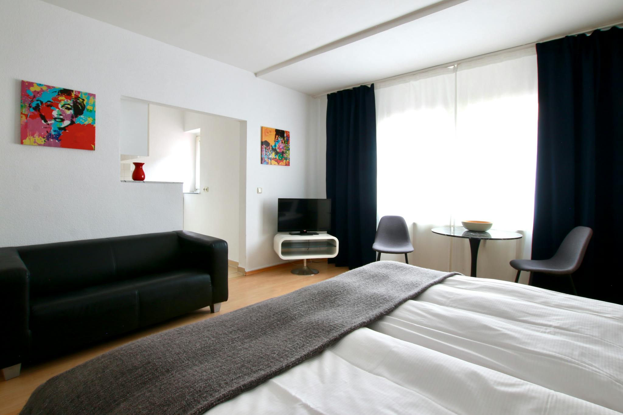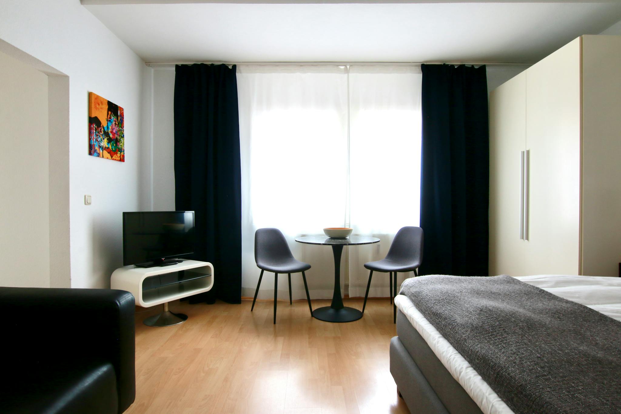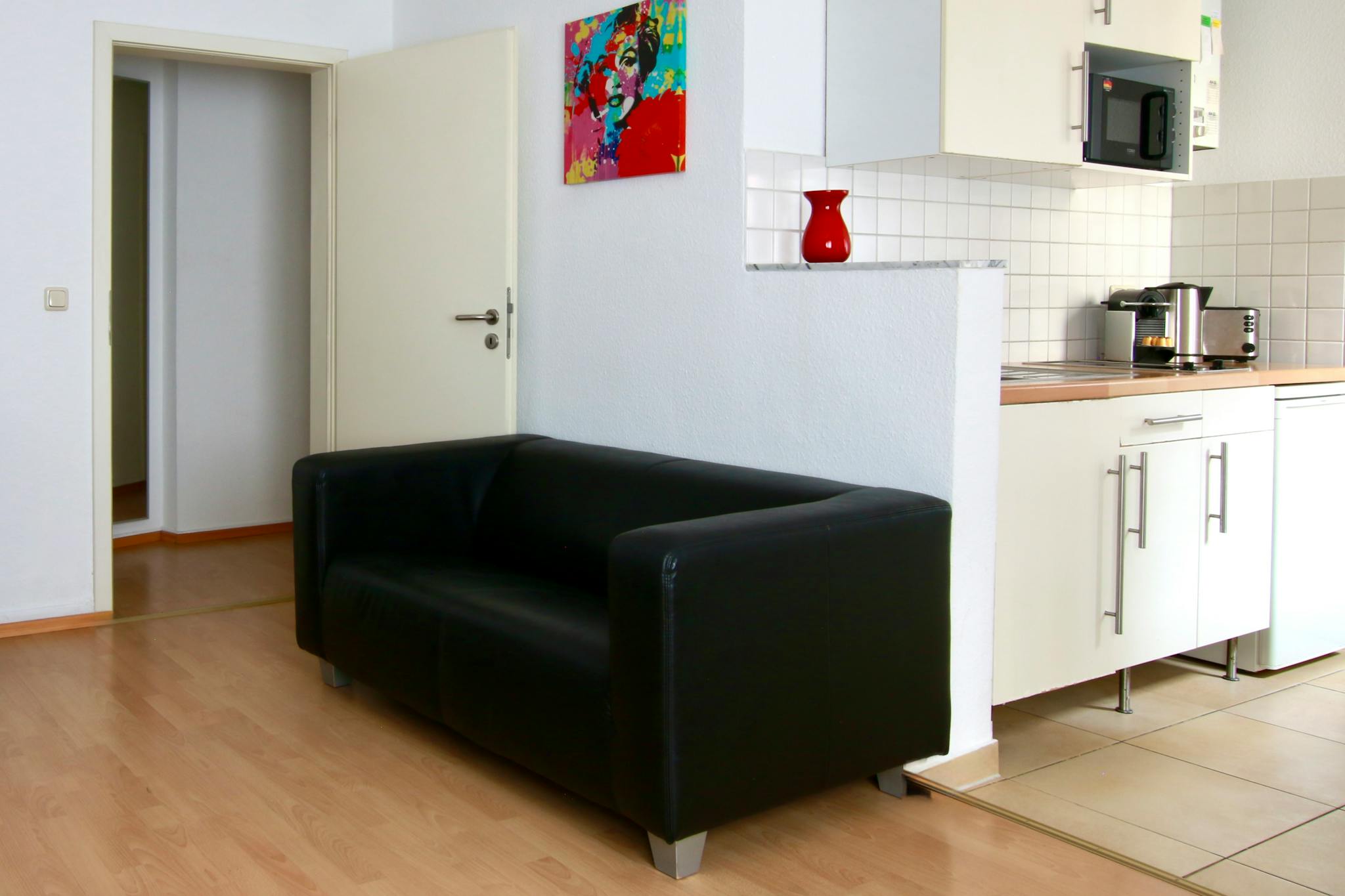 32qm großes Studio-Apartment im 1. Stock eines 6-stöckigen Apartmenthauses an einer Straßenecke im quirligen Belgischen Viertel. Der Schlaf-/Wohnraum mit Laminatboden verfügt über ein Boxspringbett (180cm breit), Kleiderschrank, Bügeleisen & Bügelbrett, Sofa, TV, kleines Wannenbad mit Föhn, und voll ausgestattete Küche mit Kühlschrank, Cerankochfeld, Wasserkocher, Kaffeemaschine, Toaster und Mikrowelle. Kostenloses Wlan ist verfügbar.
