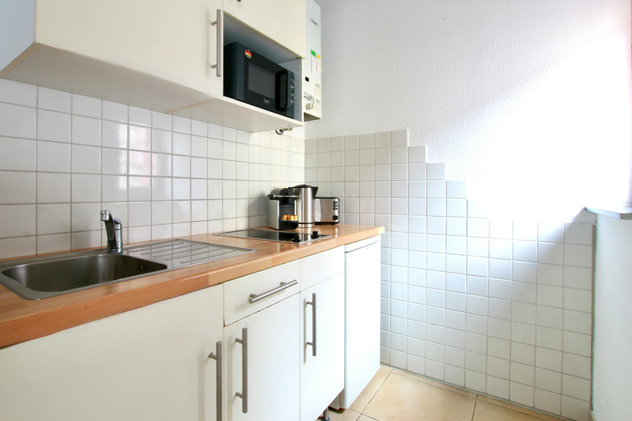 32 sqm studio apartment on the 1st floor of a 6-story apartment building on a street corner in the vibrant Belgian Quarter. The living space with laminate flooring features a box spring bed (180 cm width), wardrobe, iron & ironing board, sofa, TV, a small bathroom with bathtub and hairdryer, and a fully equipped kitchen with refrigerator, ceramic hob, kettle, coffee maker, toaster, and microwave.