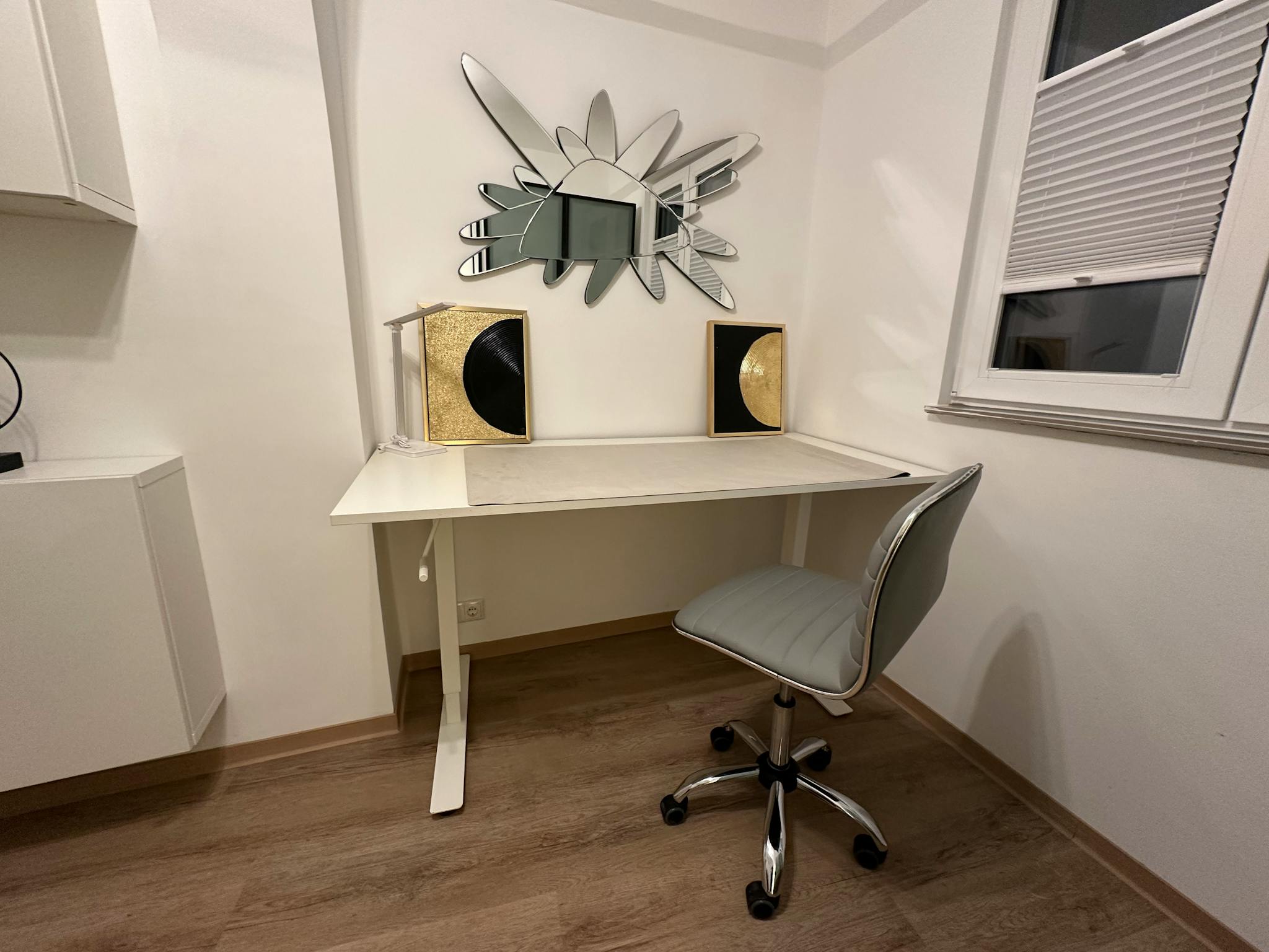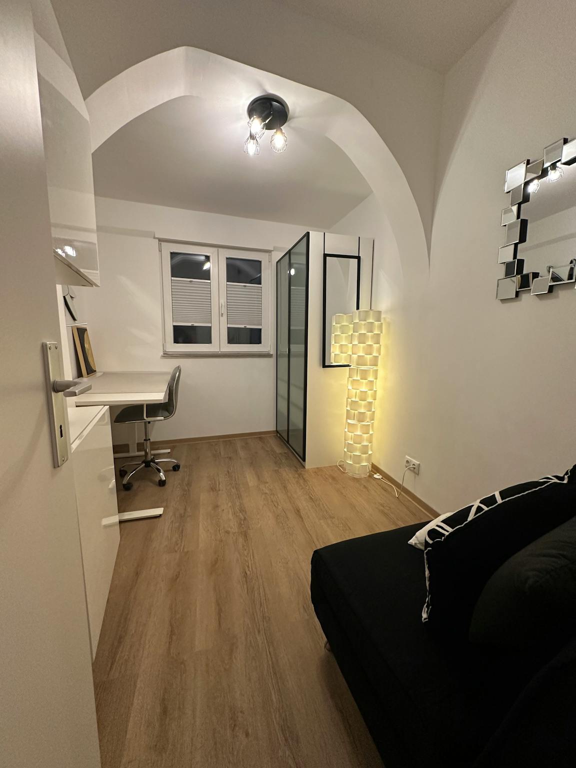 A quiet room furnished with a desk, ergonomic chair and Pax wardrobe. A sofa bed, which can be converted into a bed if required, provides additional sleeping space.