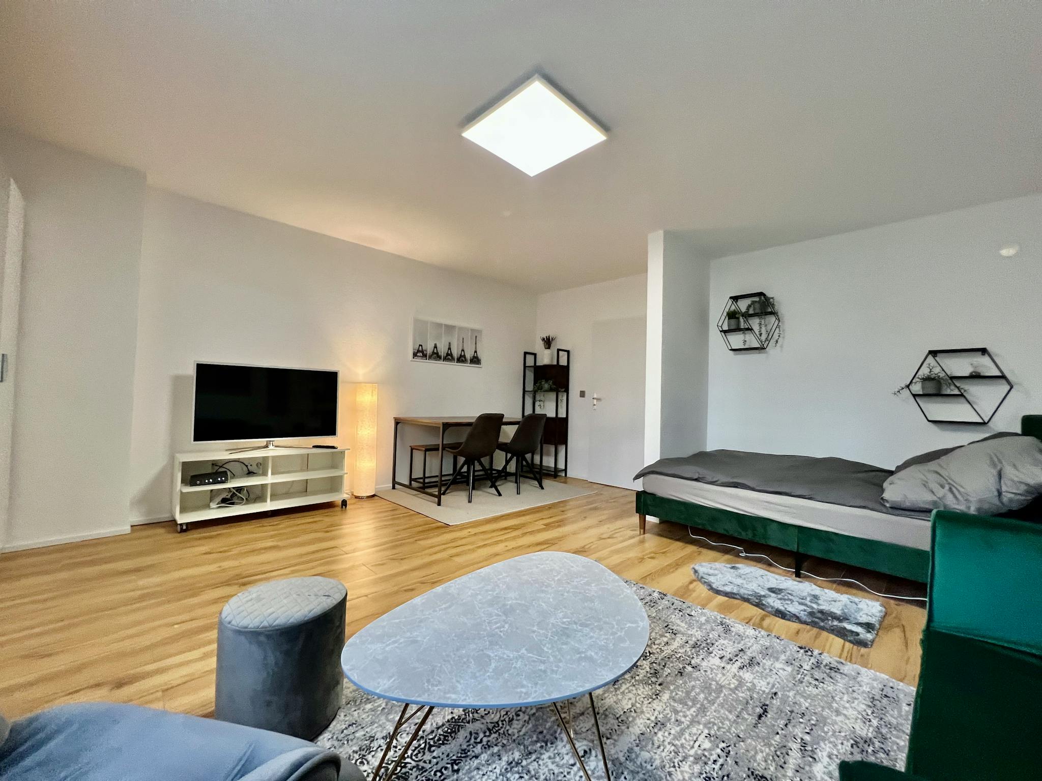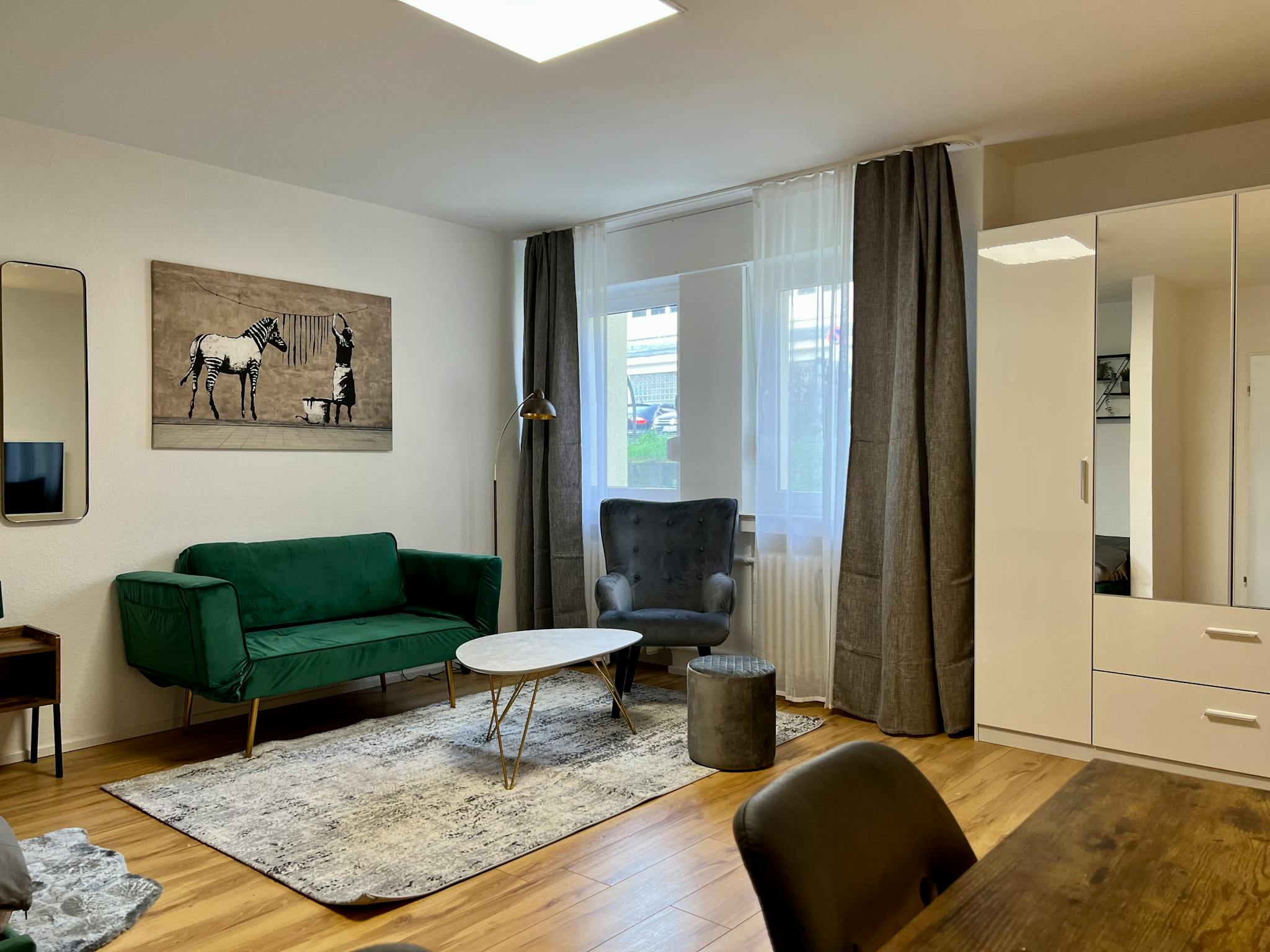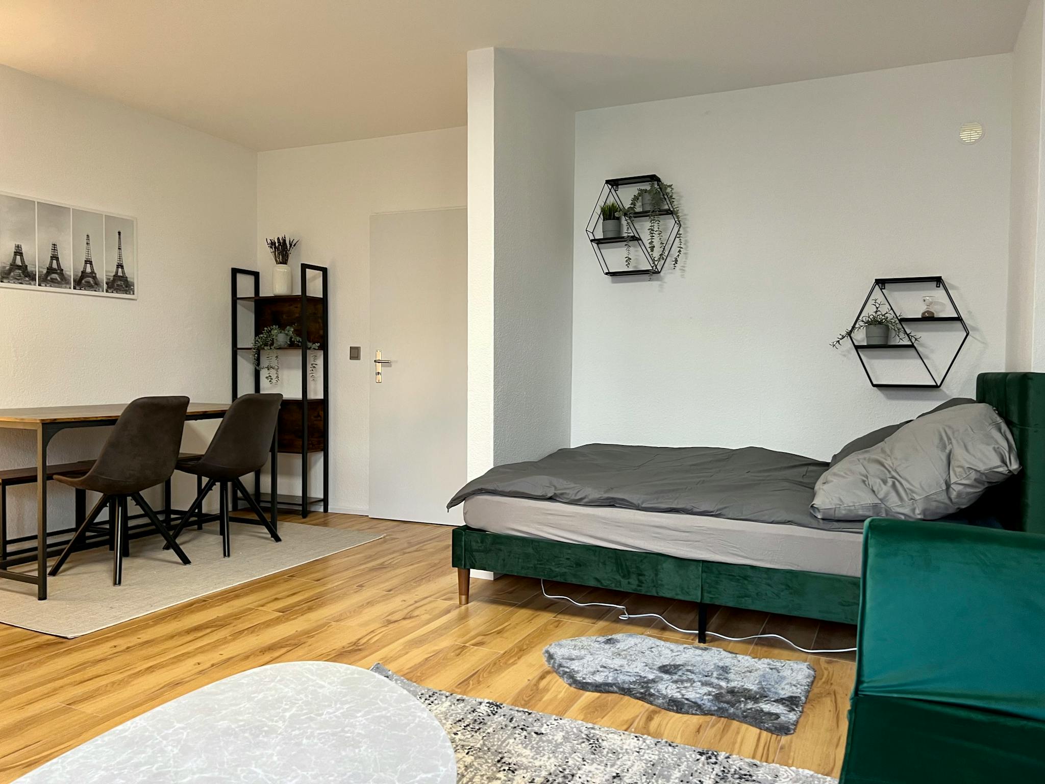 Non-SmokingNot allowed Möbliertes und designtes Studio-Apartment (37qm) in einer ruhiger Seitenstraeße in Köln Ehrenfeld. Das Apartment liegt im Erdgeschoss eines Mehrfamilienhauses, und ist sehr hell und geräumig. Es hat einen Wohn/Schlafbereich mit einem 1,40x2m großen Bett, einem Arbeitsplatz/Esstisch und ein kleines Schlafsofa. Zudem gibt es eine separate Küche, ein separates. Duschbad, und einen geräumigen Eingangsbereich (Flur).