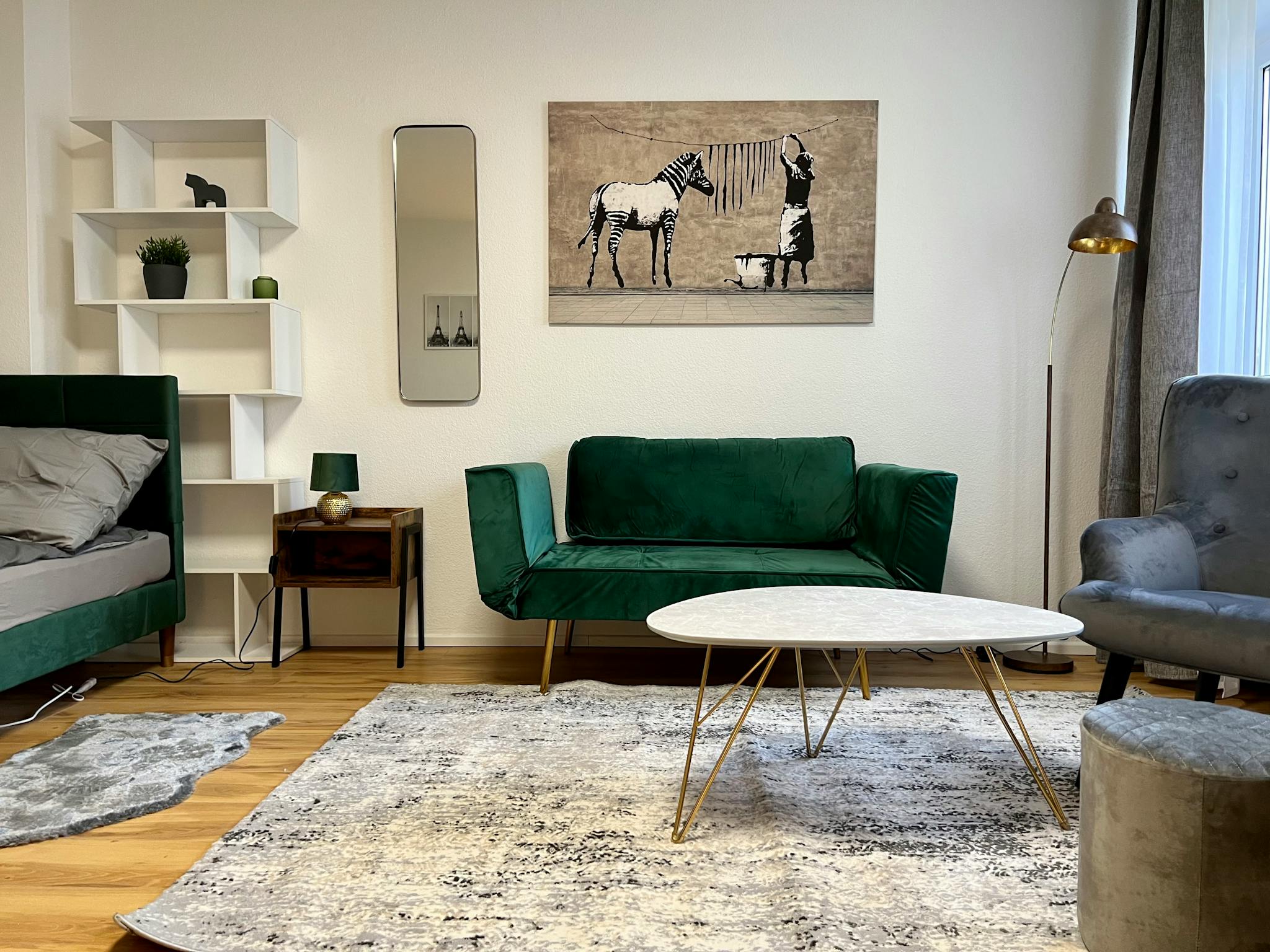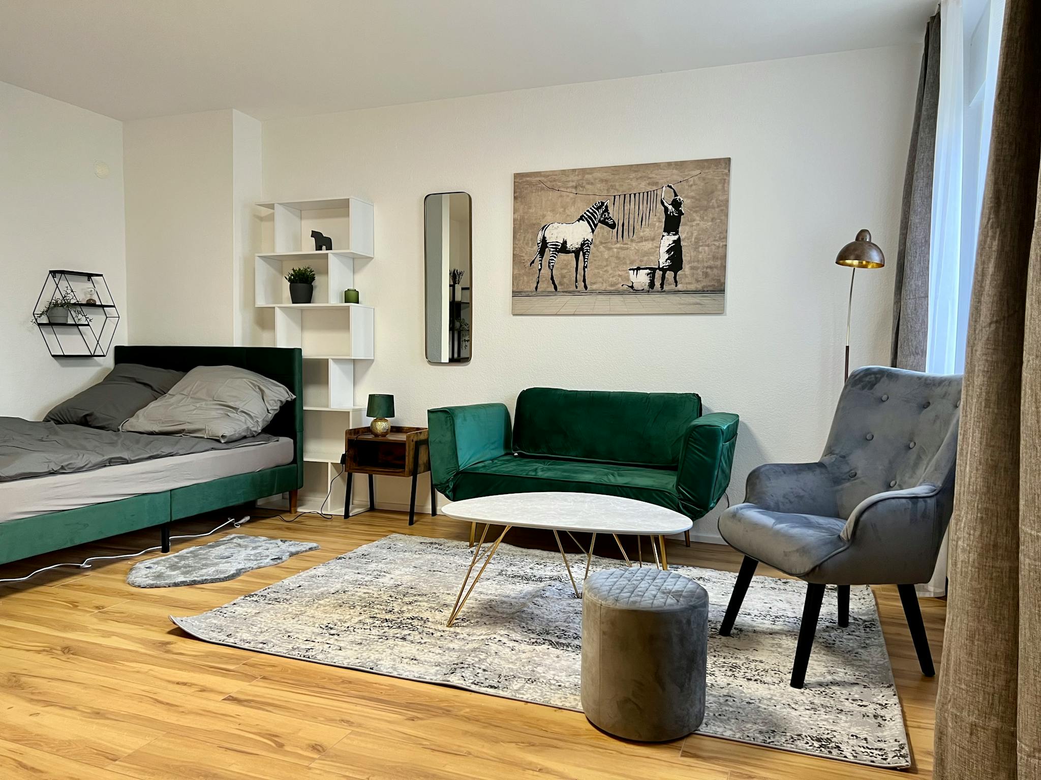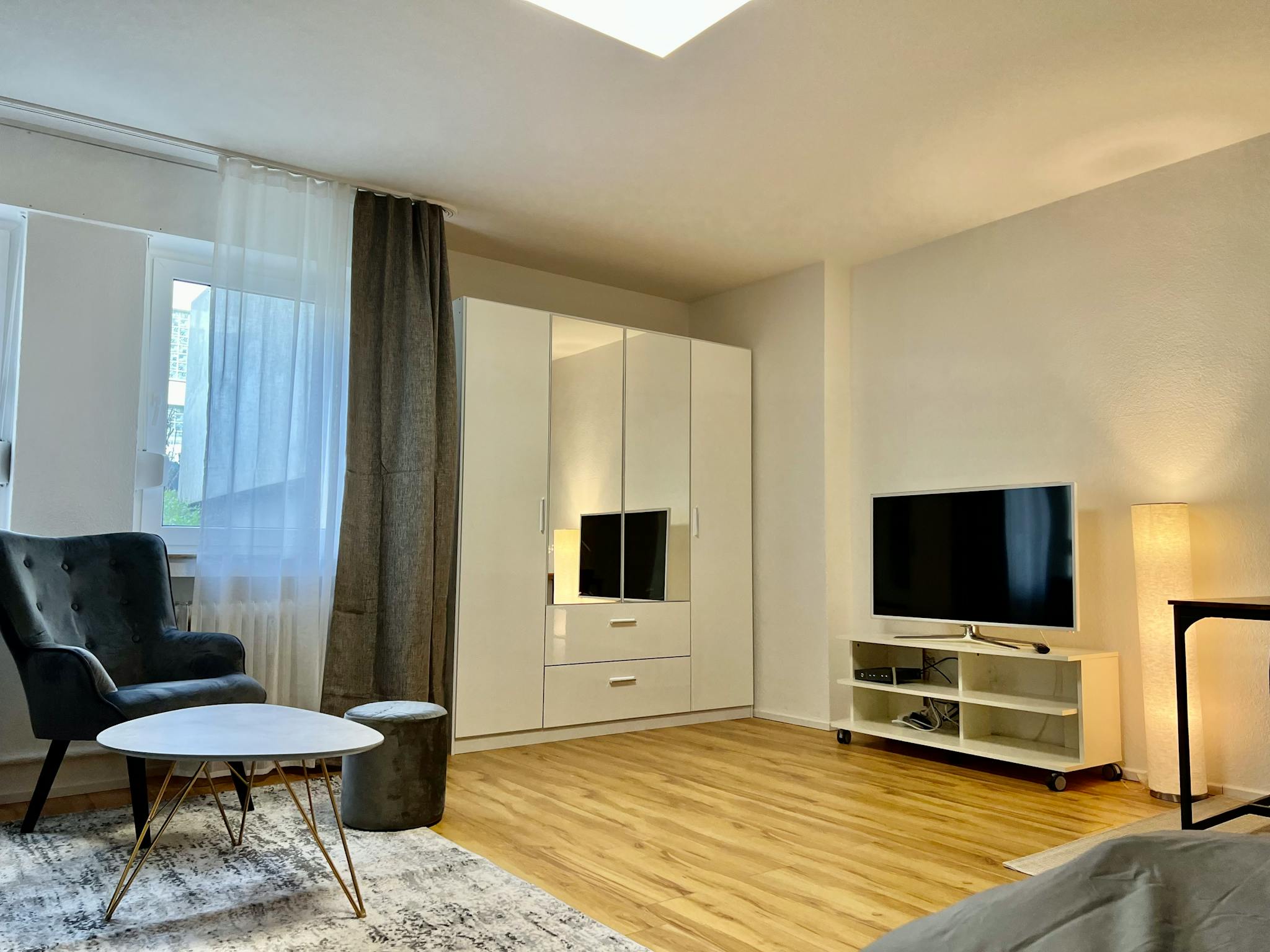 Non-SmokingNot allowed Möbliertes und designtes Studio-Apartment (37qm) in einer ruhiger Seitenstraeße in Köln Ehrenfeld. Das Apartment liegt im Erdgeschoss eines Mehrfamilienhauses, und ist sehr hell und geräumig. Es hat einen Wohn/Schlafbereich mit einem 1,40x2m großen Bett, einem Arbeitsplatz/Esstisch und ein kleines Schlafsofa. Zudem gibt es eine separate Küche, ein separates. Duschbad, und einen geräumigen Eingangsbereich (Flur).