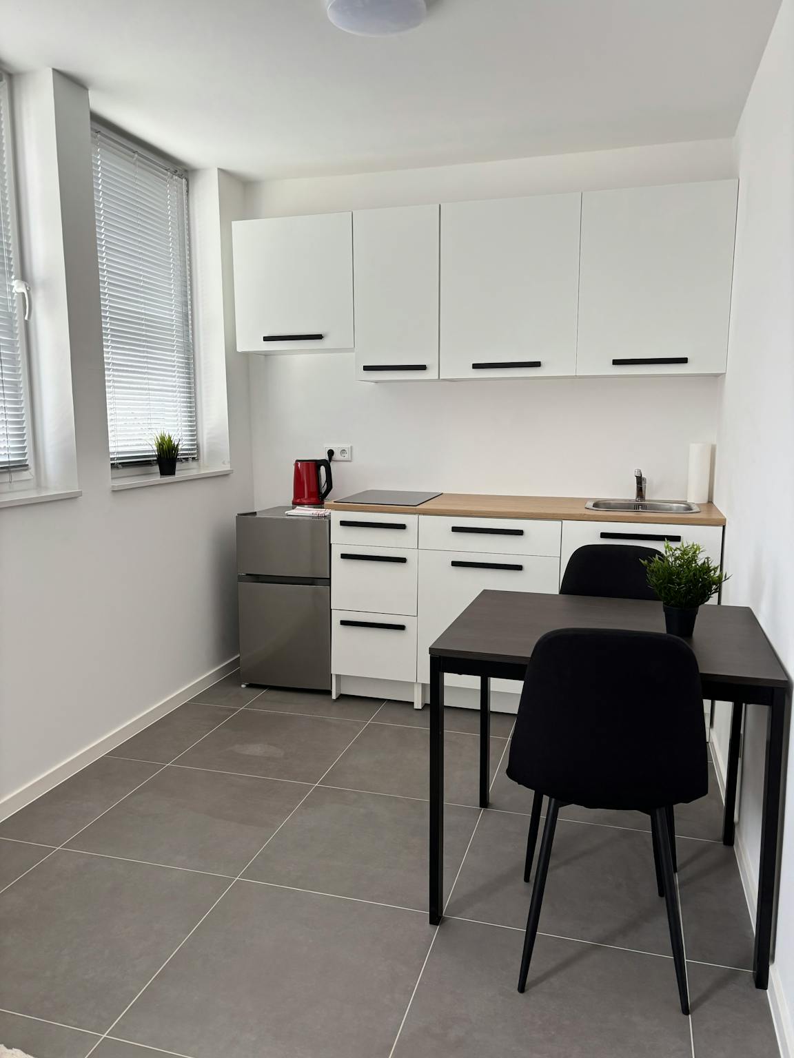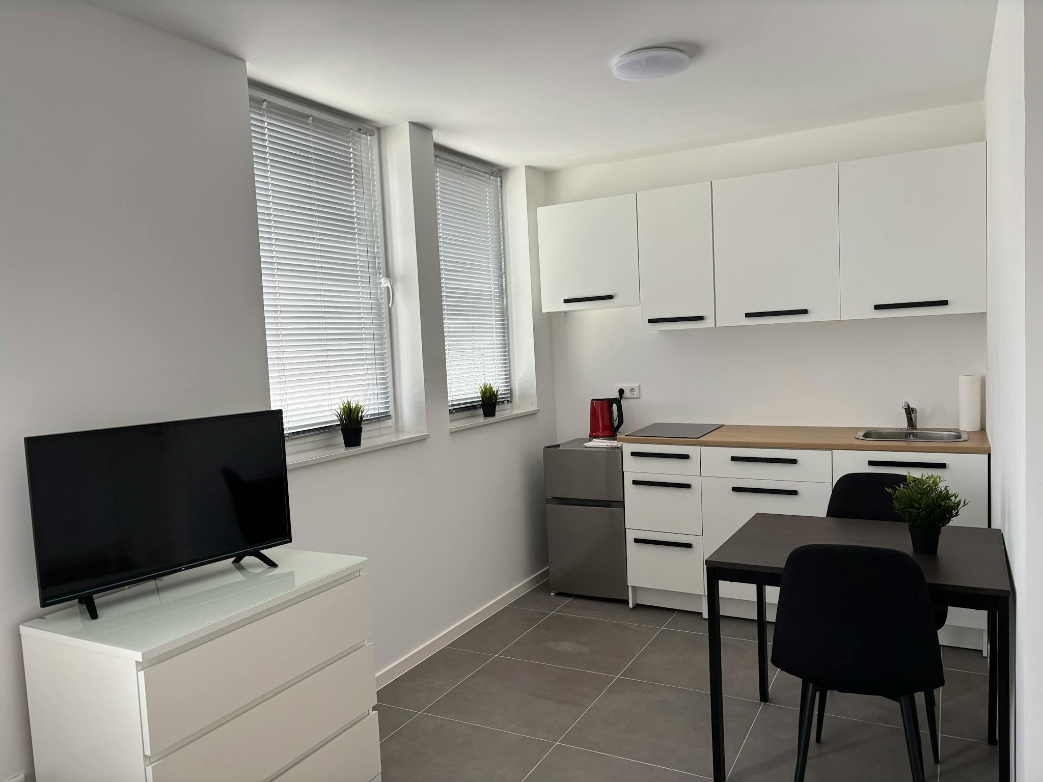 3. Küchenzeile mit der notwendigen Technik und einem Geschirrset.