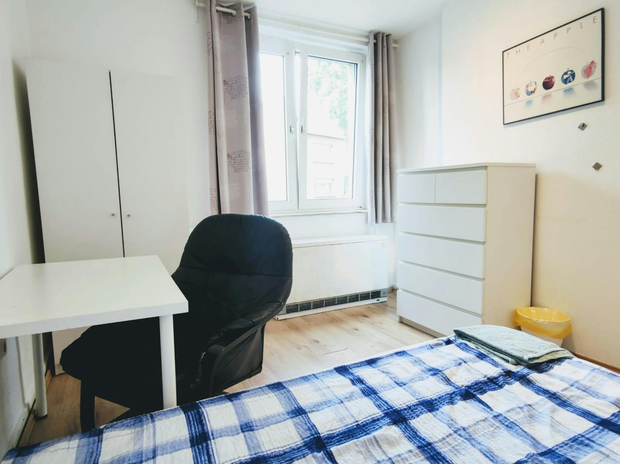 Fully Furnished Rooms: Each room is approximately 12-14 m2 and includes a desk, chair, wardrobe, and pull-out sofa/bed.