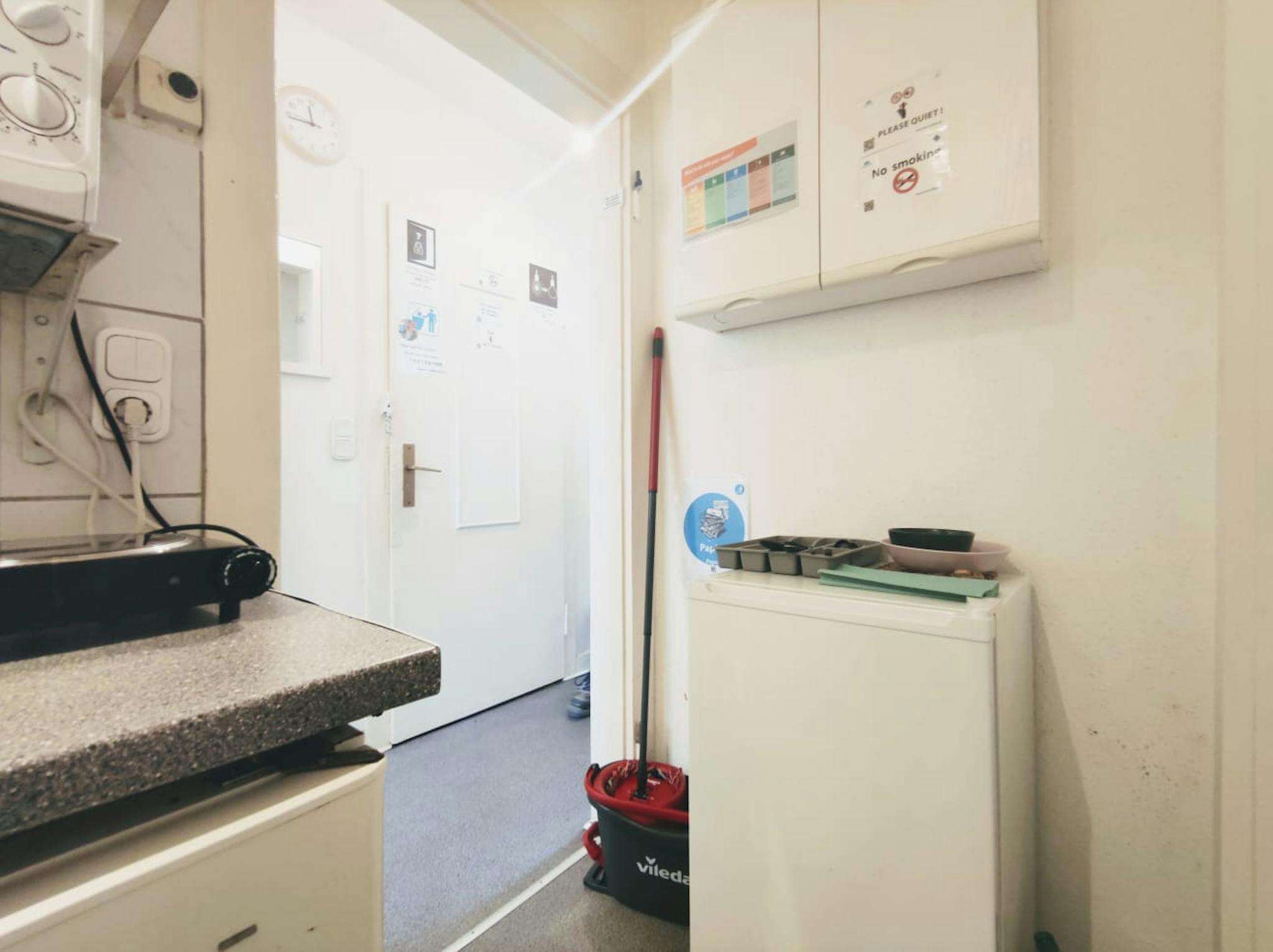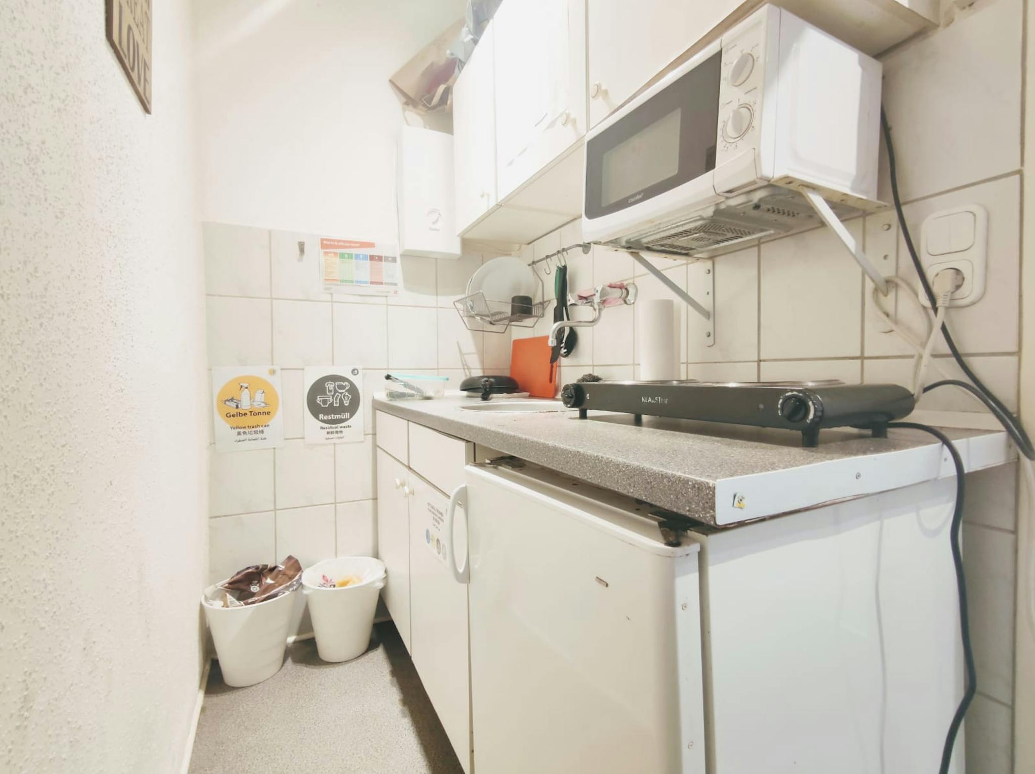 The compact kitchen is equipped with a cooktop, electric kettle, fridge, and kitchenware.
