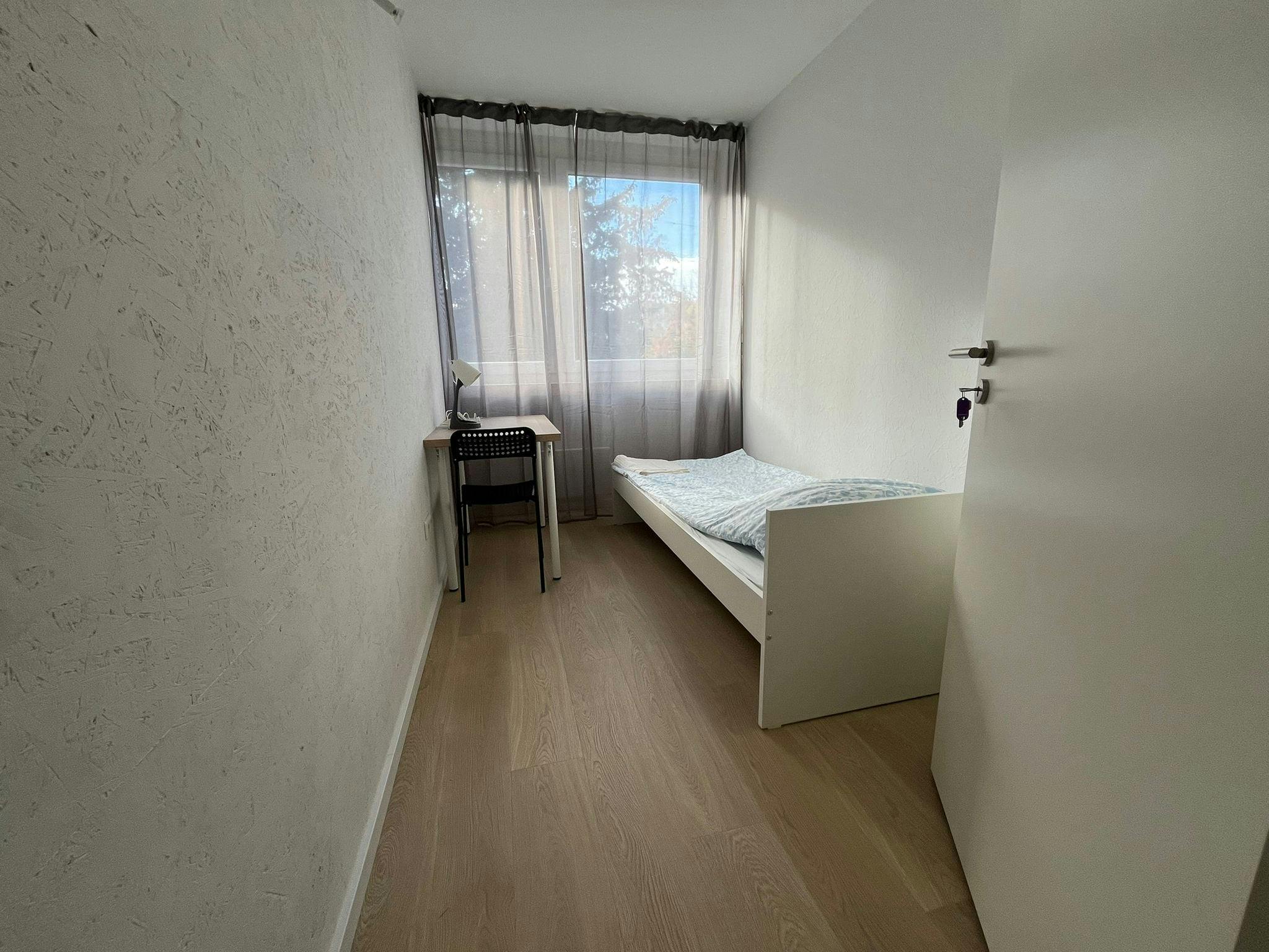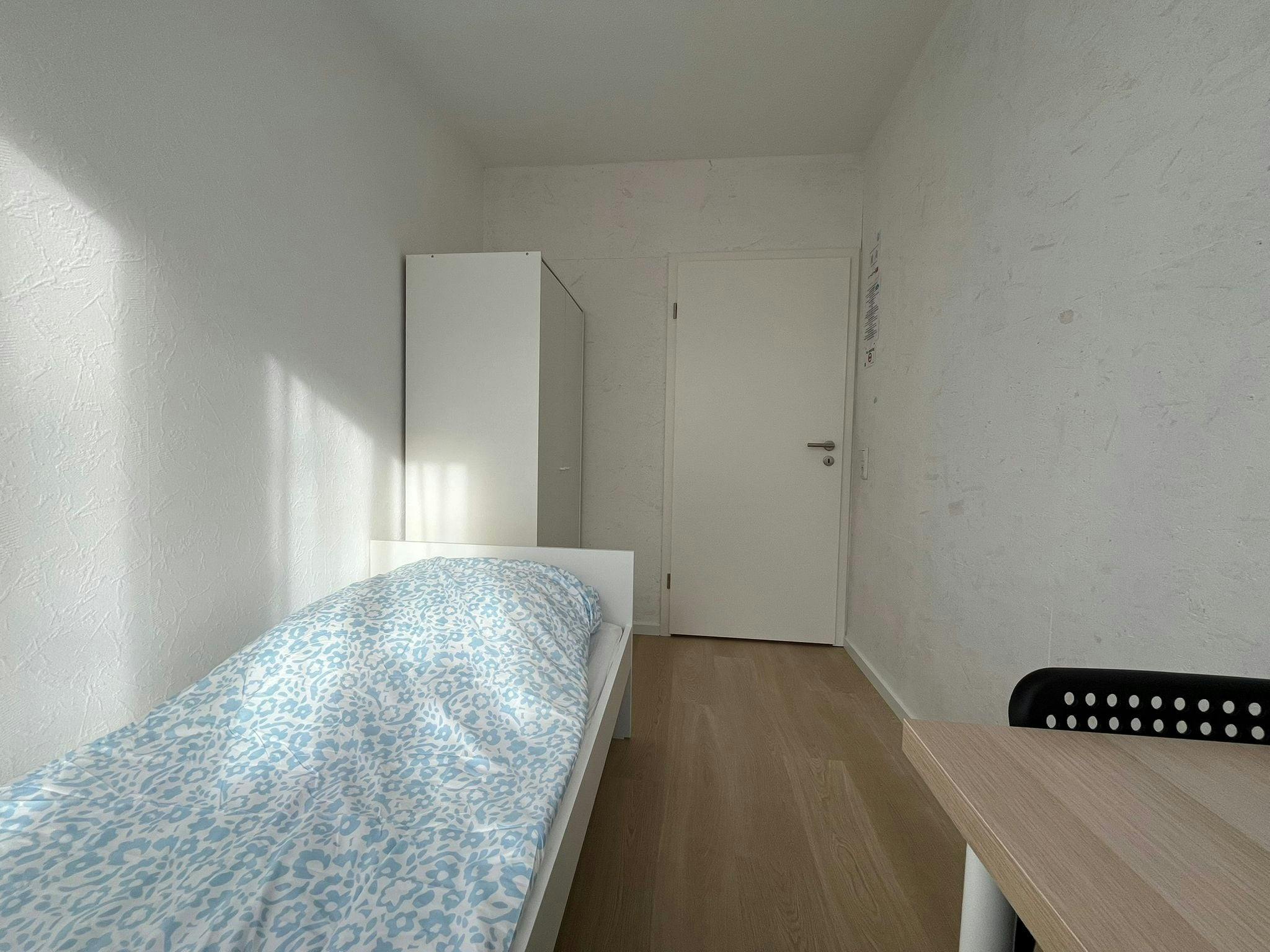 Fully Furnished Rooms: Each room includes a bed, work table, chair, and wardrobe.