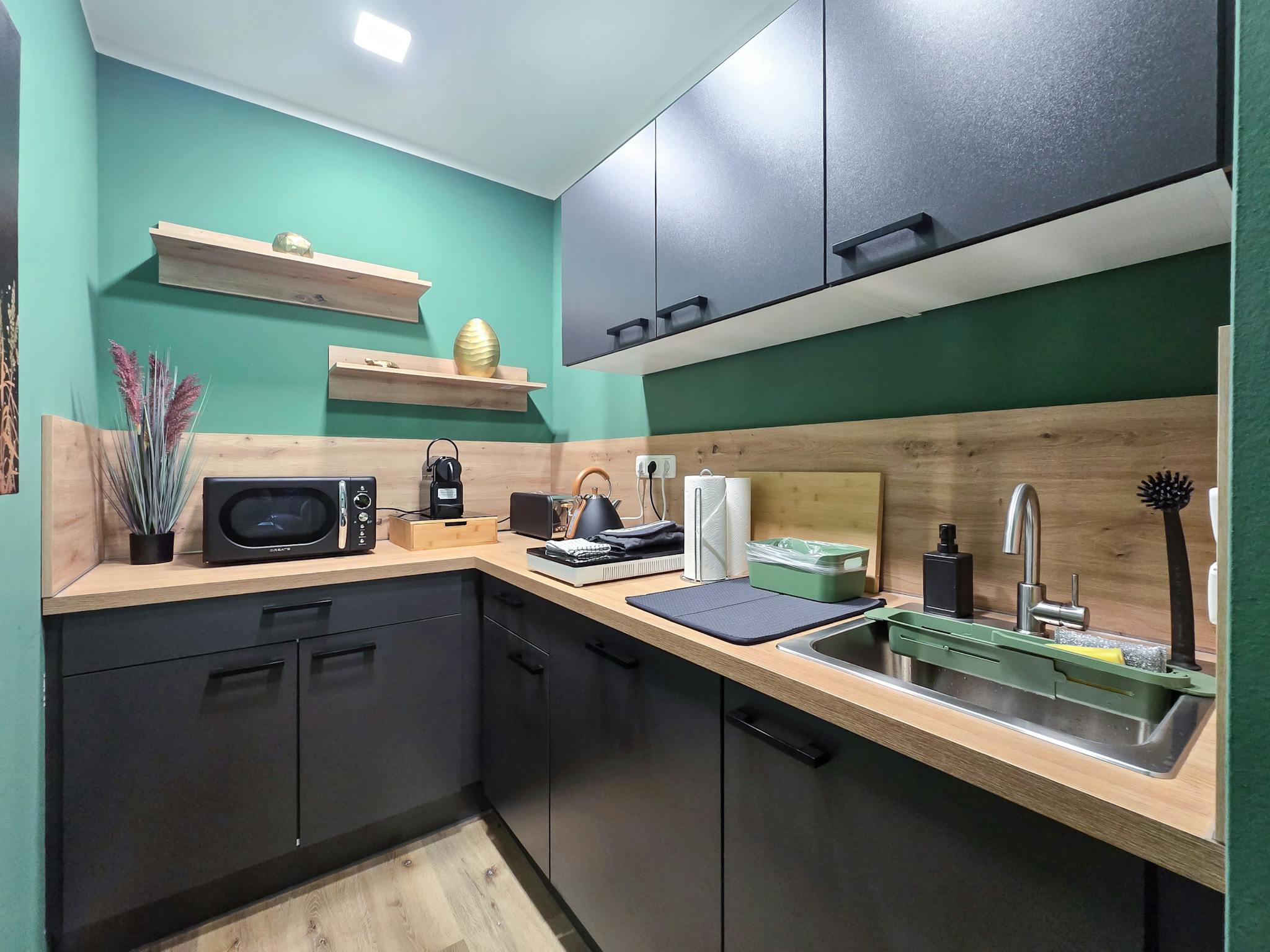 On the 3rd floor - conveniently accessible by elevator - a unique and cleverly designed studio apartment awaits you on approximately 30 m2. The highlight is the open, spacious living and sleeping area, whose "Green Flair" creates a calming and at the same time inspiring atmosphere through a stylish color scheme. Here, sleeping, living, and life merge into a harmonious whole..