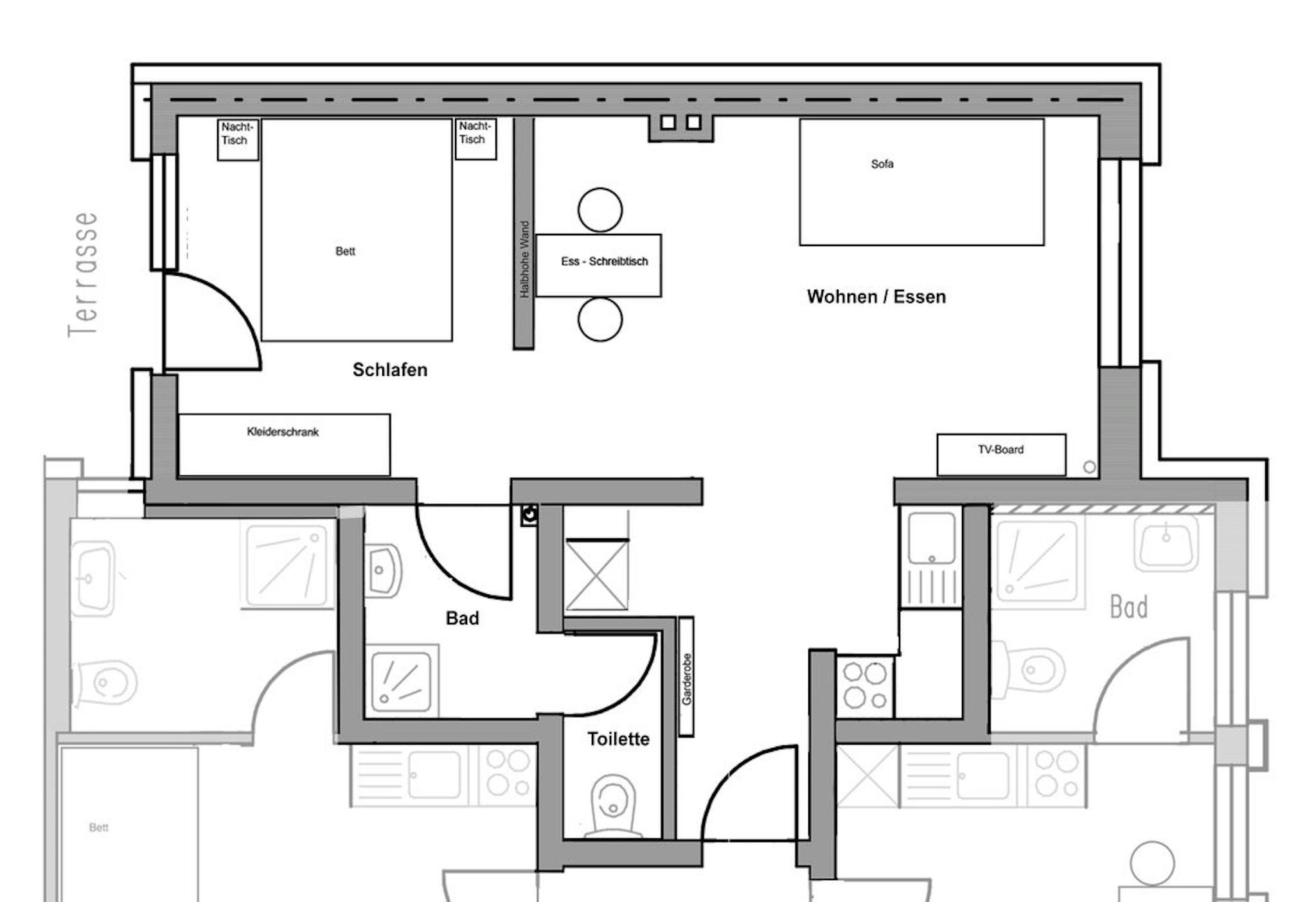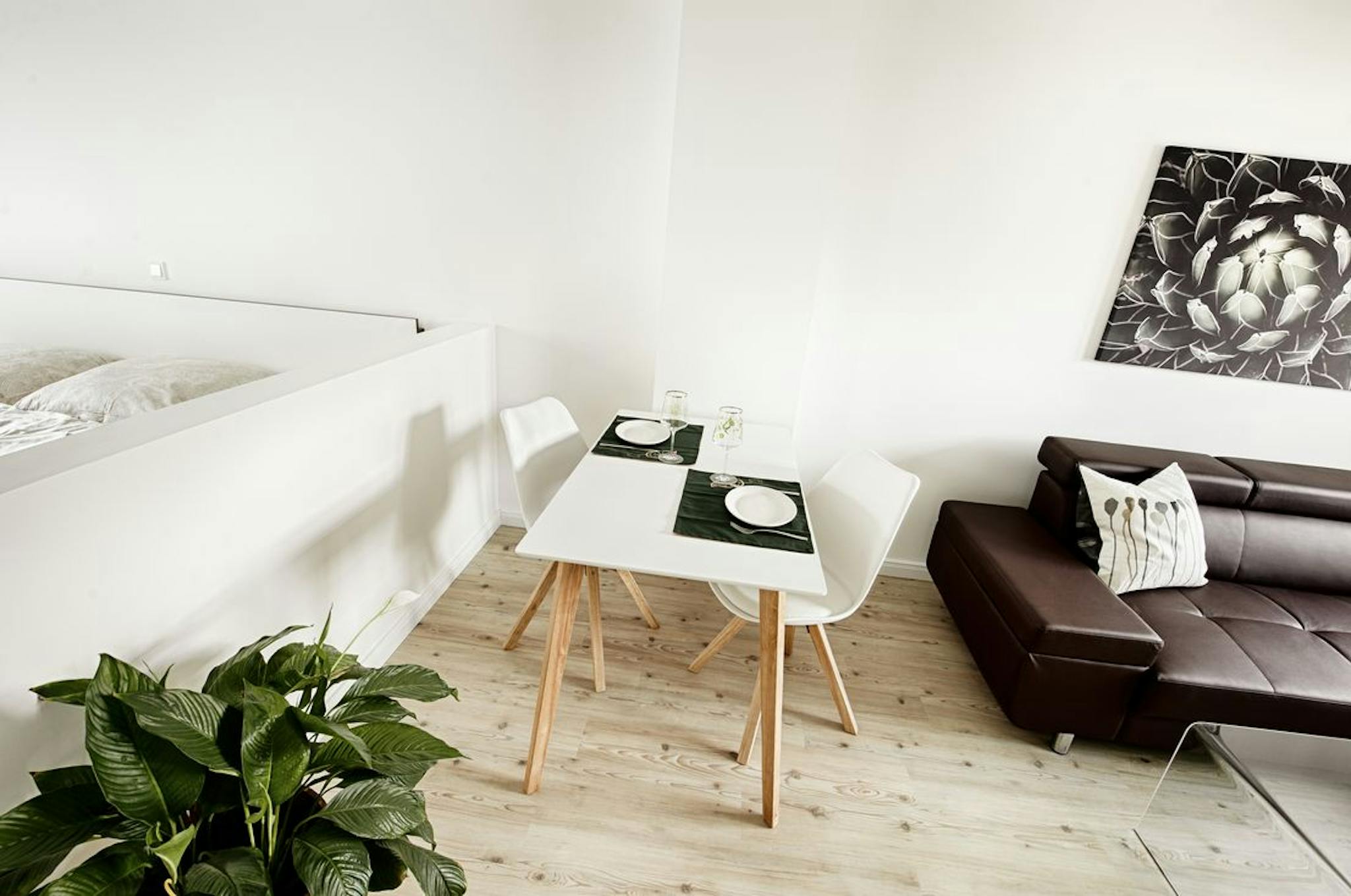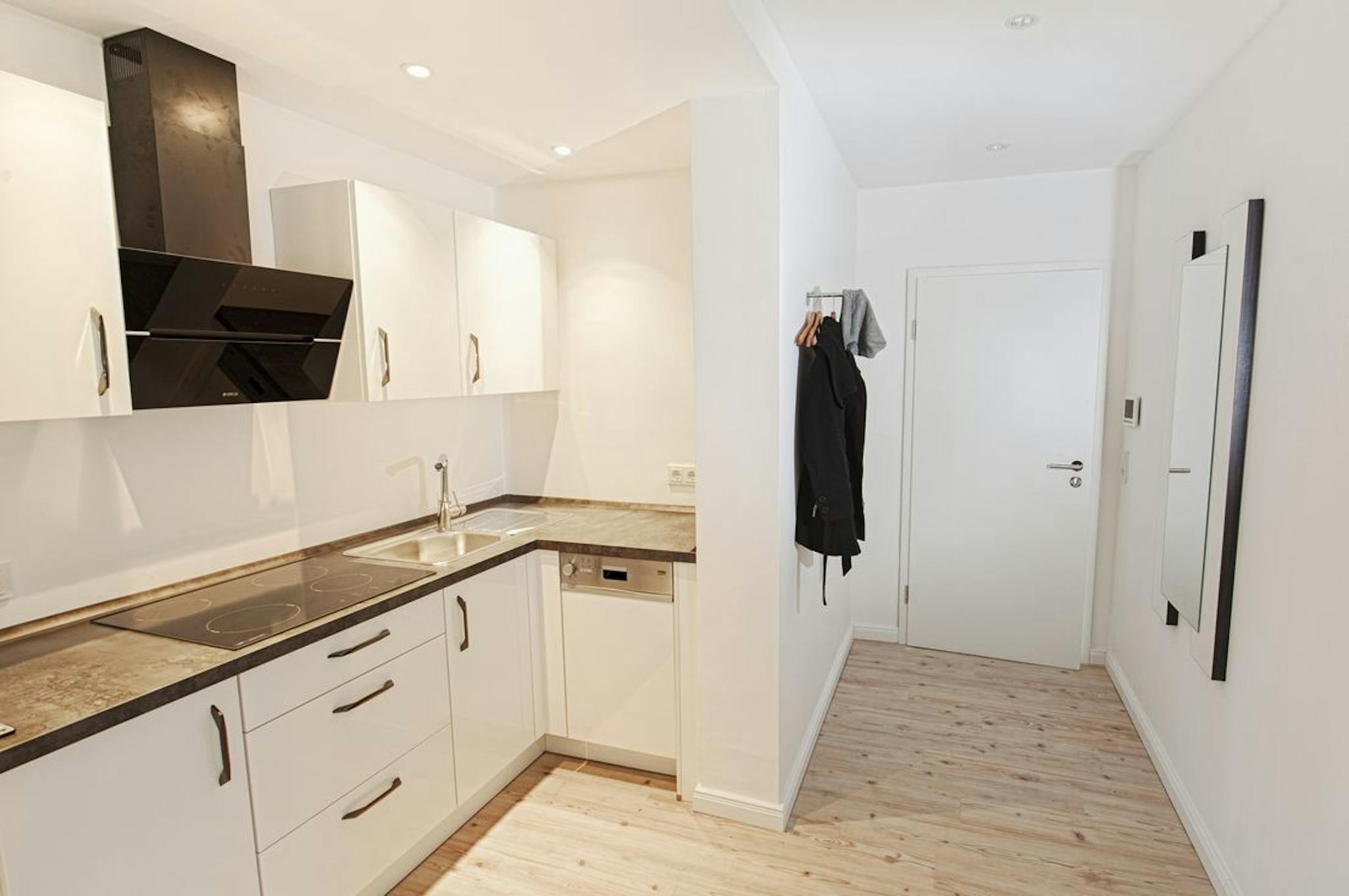 The 46m 2 1-room business apartment with shower room, separate toilet and fully equipped kitchen is optimally designed for double occupancy.